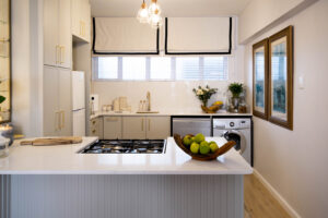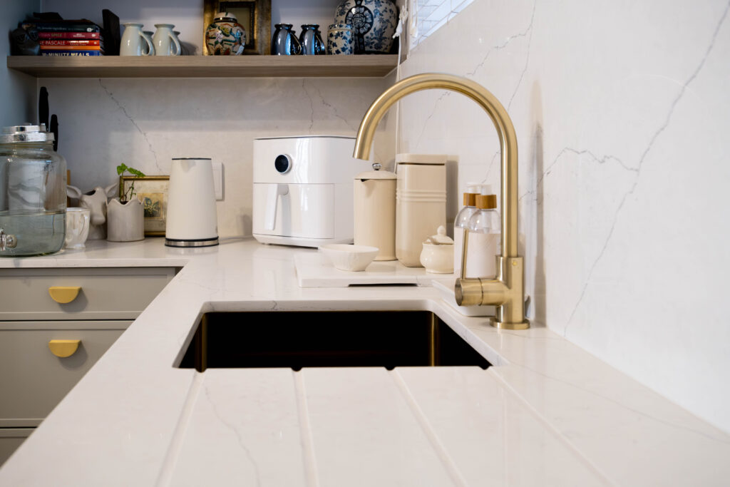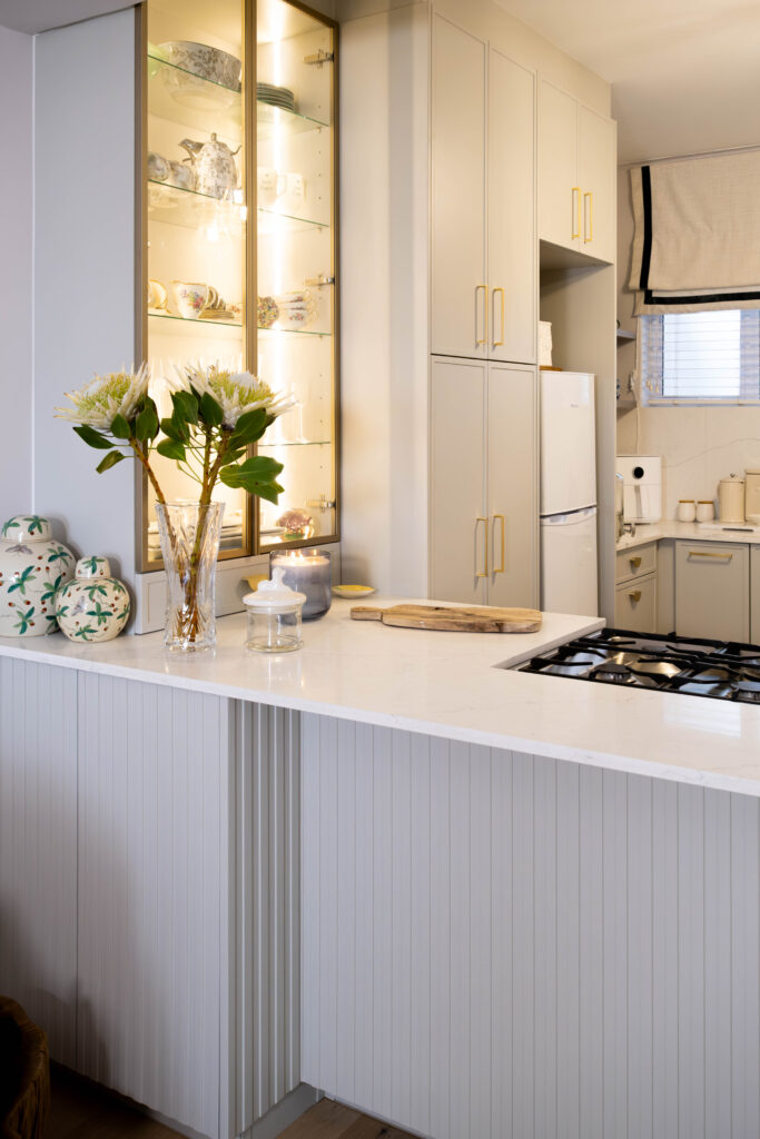 This is Marc Buckner’s kitchen – a refined and elegant space that perfectly balances contemporary design with timeless charm. Soft, neutral cabinetry paired with gold hardware creates a sophisticated yet inviting atmosphere, while the vertical panelling on the island adds subtle texture and visual interest. The white countertops and splashback enhance the sense of light and openness, making the space feel airy and uncluttered.