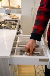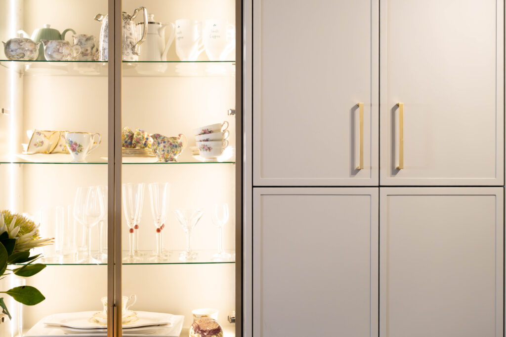 Thoughtfully styled with fresh flowers, natural wood accents, and decorative ceramics, the kitchen reflects Marc’s eye for detail and love for curated living. The central island, equipped with a built-in hob, offers a practical workspace that also serves as a focal point for cooking and socialising. Designed in collaboration with Easylife Kitchens, this kitchen embodies understated luxury, functionality, and personalised style.