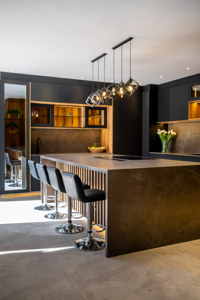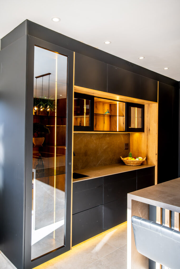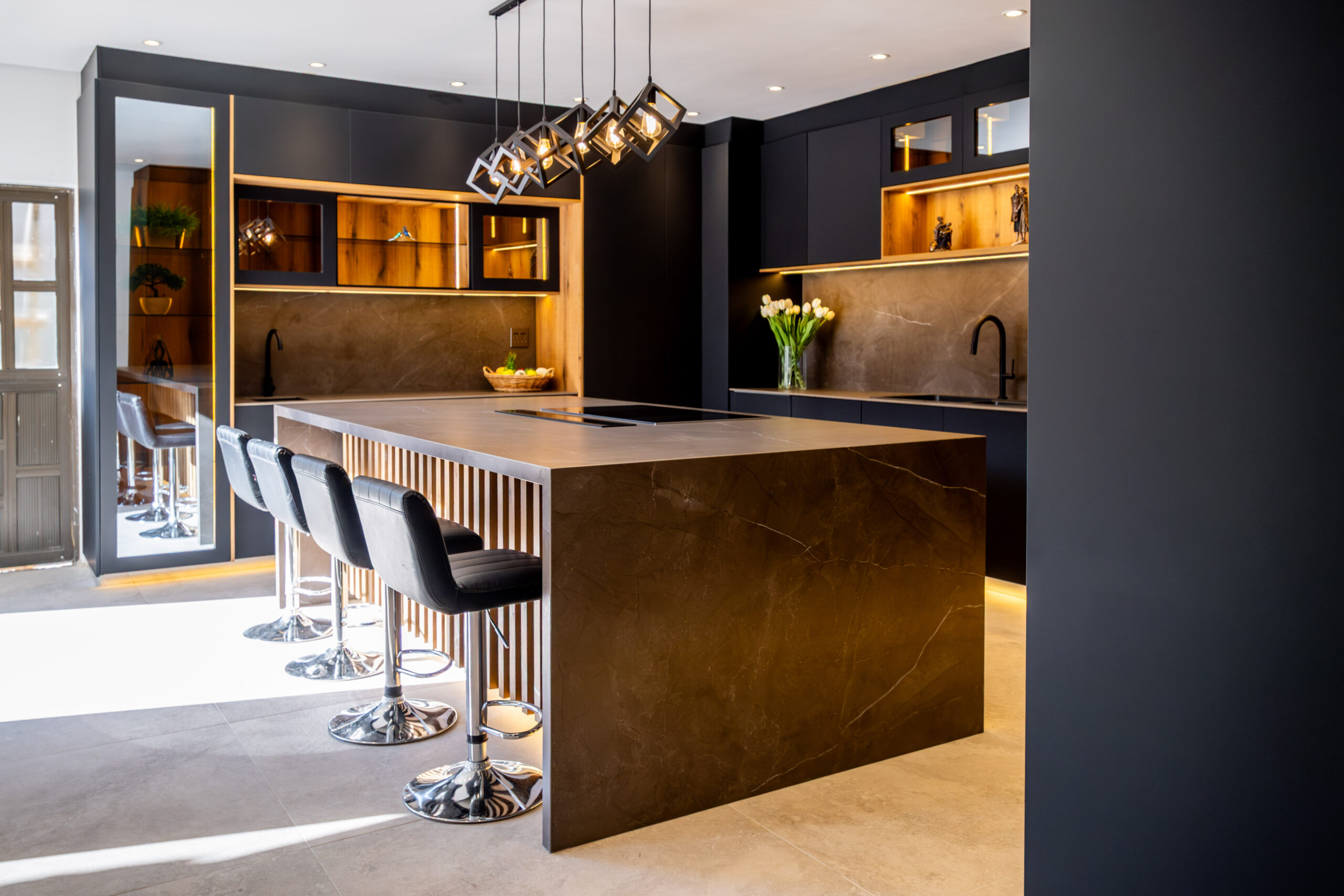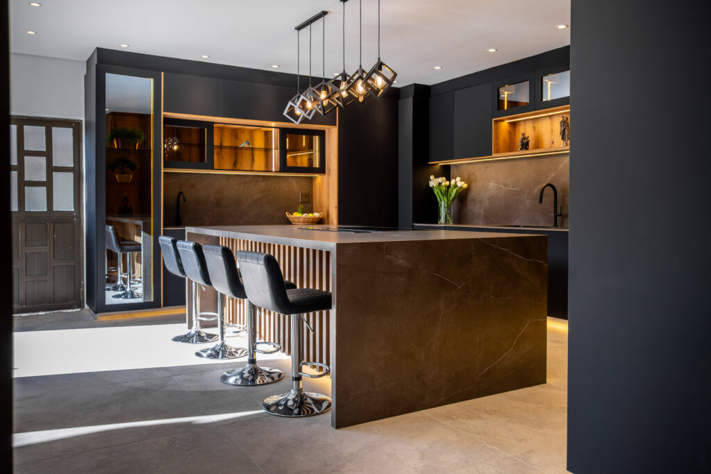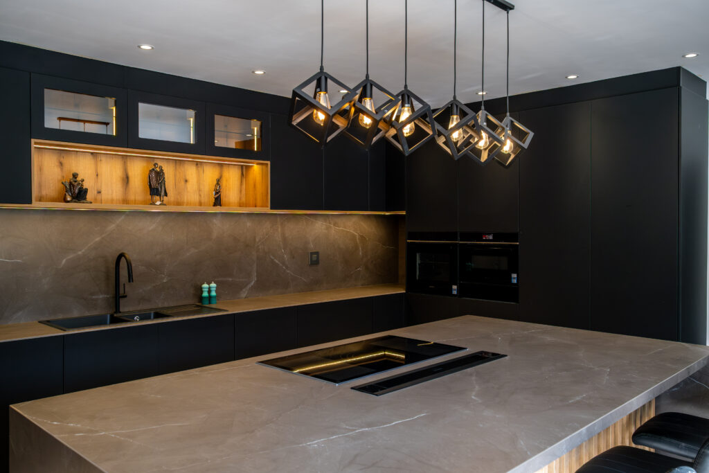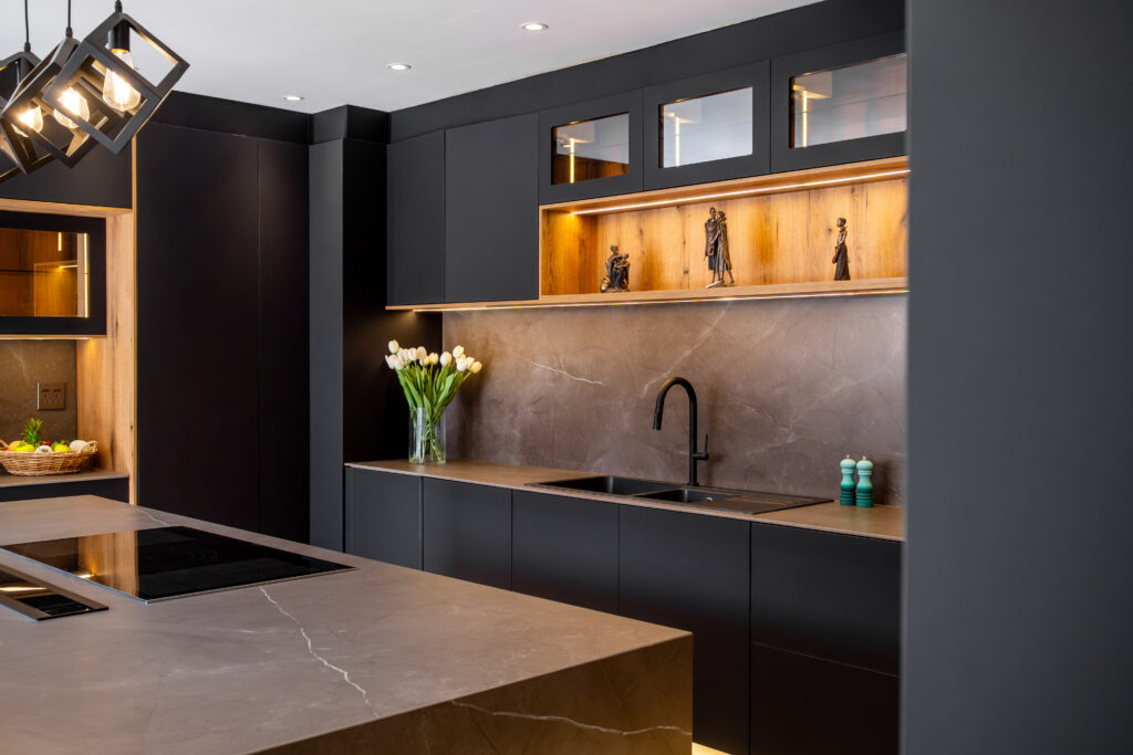 The Metropolitan Eclipse Kitchen is a striking statement of modern luxury. Bold black cabinetry sets a dramatic tone, softened by the warmth of natural wood accents and subtle golden backlighting. The sleek, stone-look surfaces bring a refined edge, while geometric pendant lights add an architectural flair. Every detail is designed for both beauty and functionality, creating a space that feels at once contemporary, inviting, and effortlessly sophisticated. Perfect for the urban homeowner who values high design and flawless craftsmanship, this kitchen is where city style meets timeless elegance.