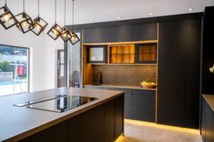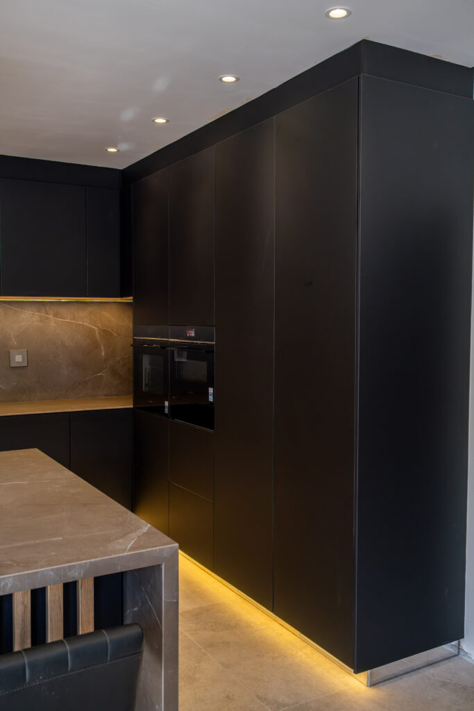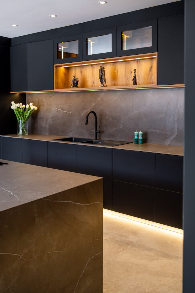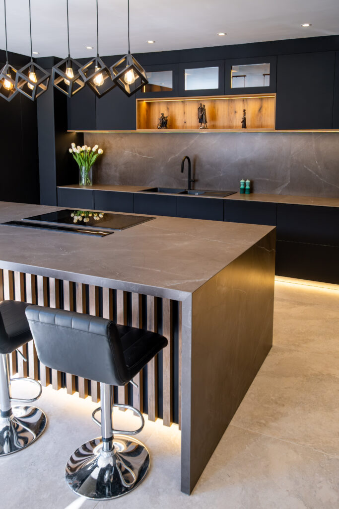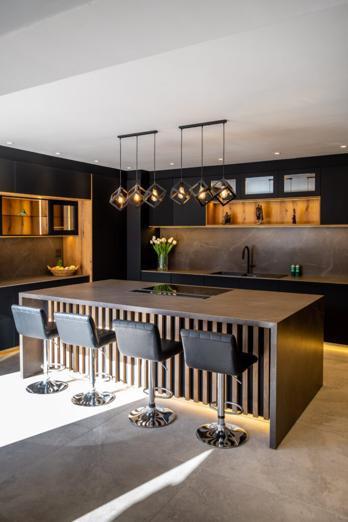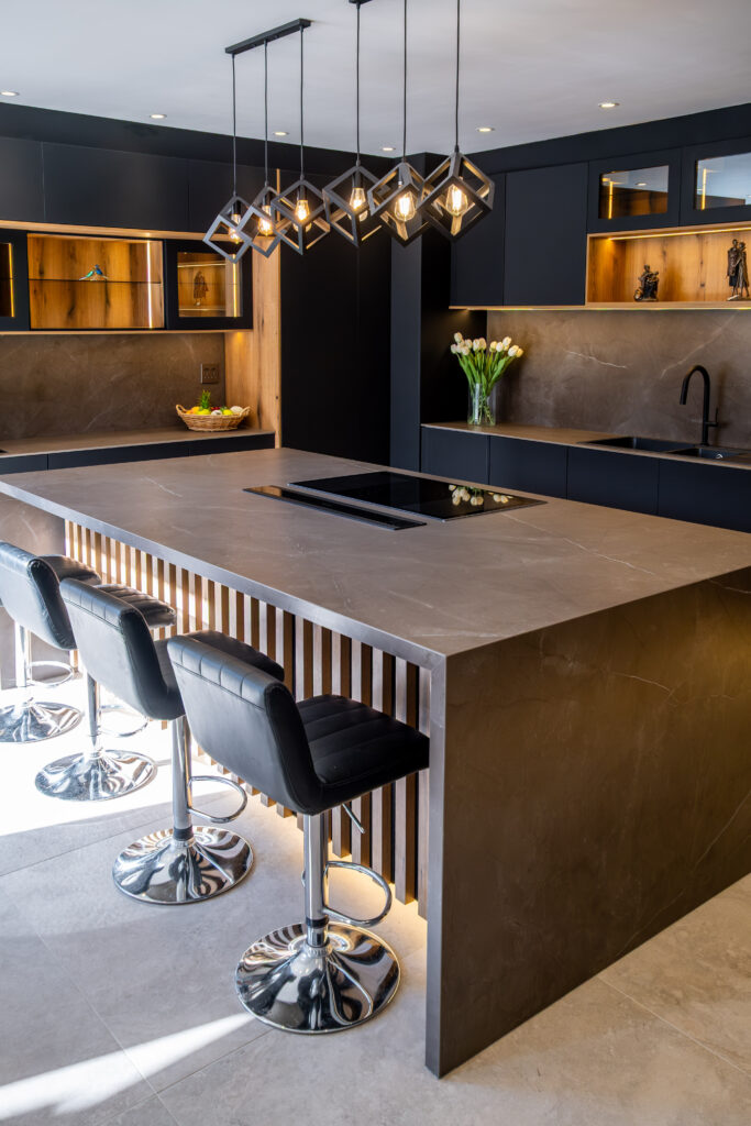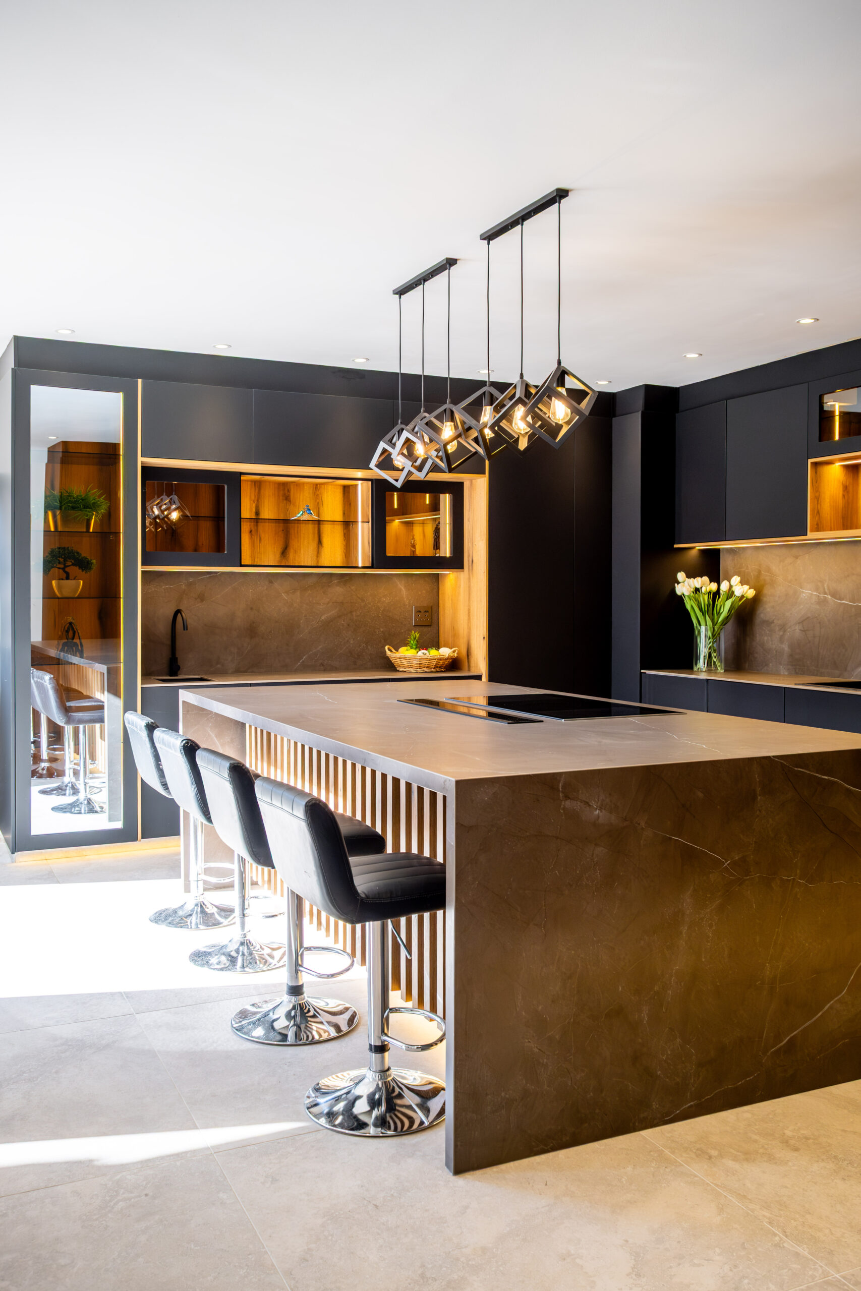 The Metropolitan Eclipse Kitchen is a striking statement of modern luxury. Bold black cabinetry sets a dramatic tone, softened by the warmth of natural wood accents and subtle golden backlighting. The sleek, stone-look surfaces bring a refined edge, while geometric pendant lights add an architectural flair. Every detail is designed for both beauty and functionality, creating a space that feels at once contemporary, inviting, and effortlessly sophisticated. Perfect for the urban homeowner who values high design and flawless craftsmanship, this kitchen is where city style meets timeless elegance.