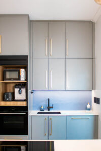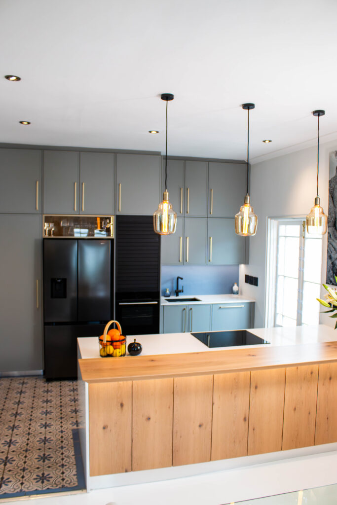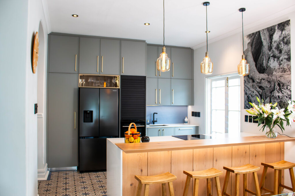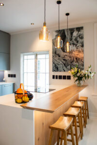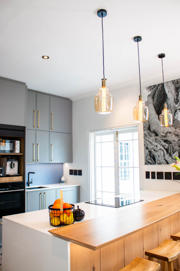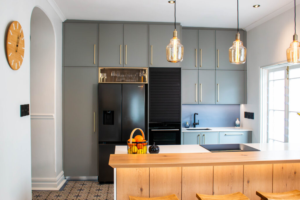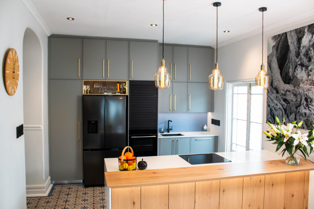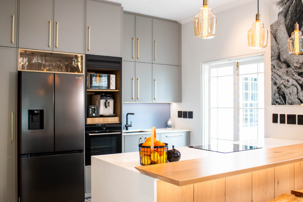 The Scandi Luxe Kitchen is a masterclass in understated elegance. Soft grey cabinetry with brushed gold handles sets a refined tone, while the natural timber breakfast bar and stools bring warmth and texture to the space. The white quartz worktop offers a crisp contrast, enhancing the kitchen’s light and airy feel. Pendant lighting in warm amber tones adds a golden glow, creating an inviting ambience perfect for both morning coffee and evening entertaining. Thoughtfully designed for functionality and beauty, this kitchen blends Scandinavian minimalism with subtle luxury for a timeless, welcoming space.