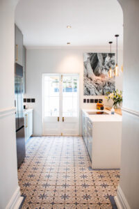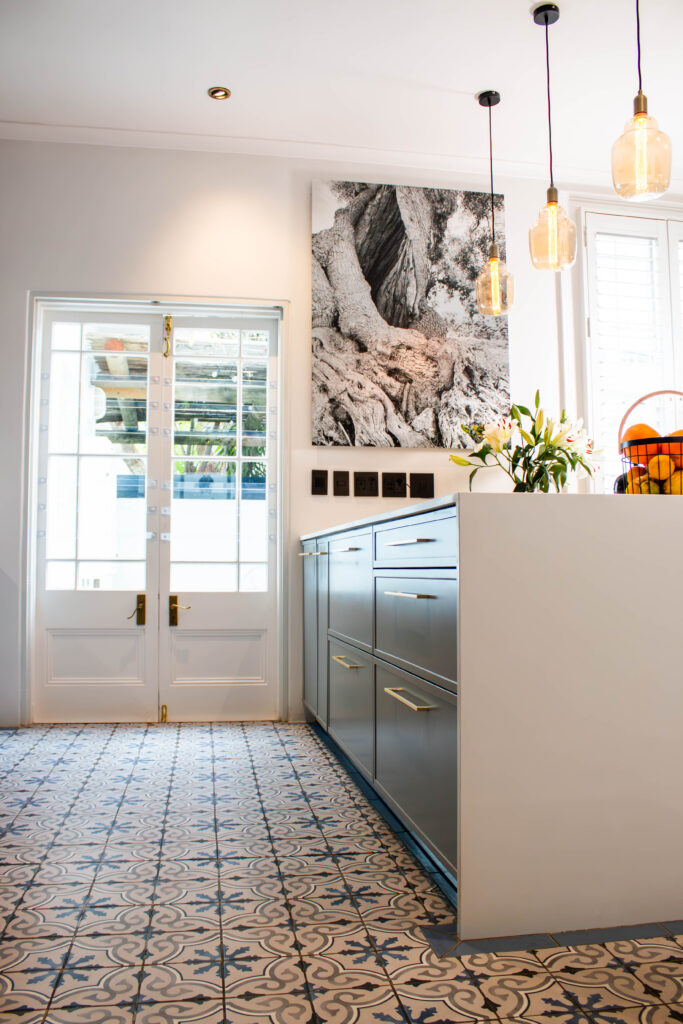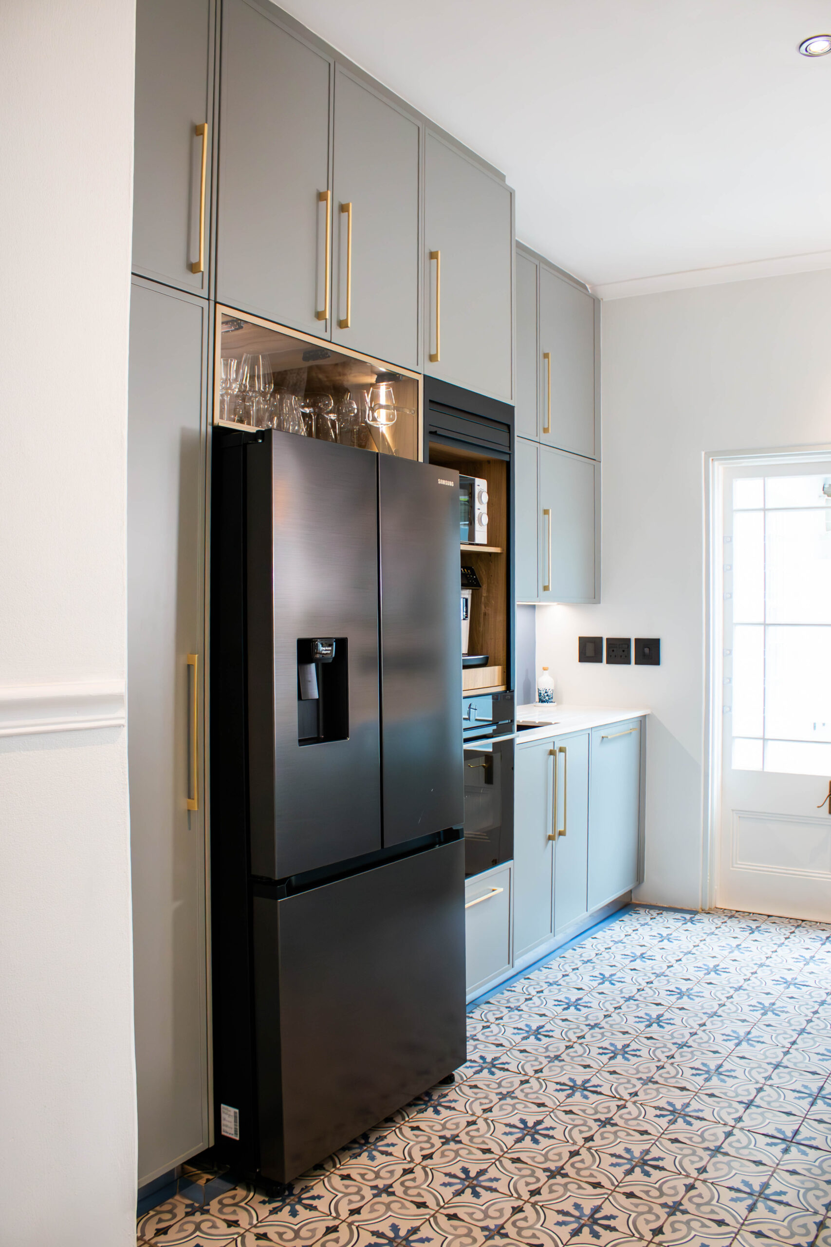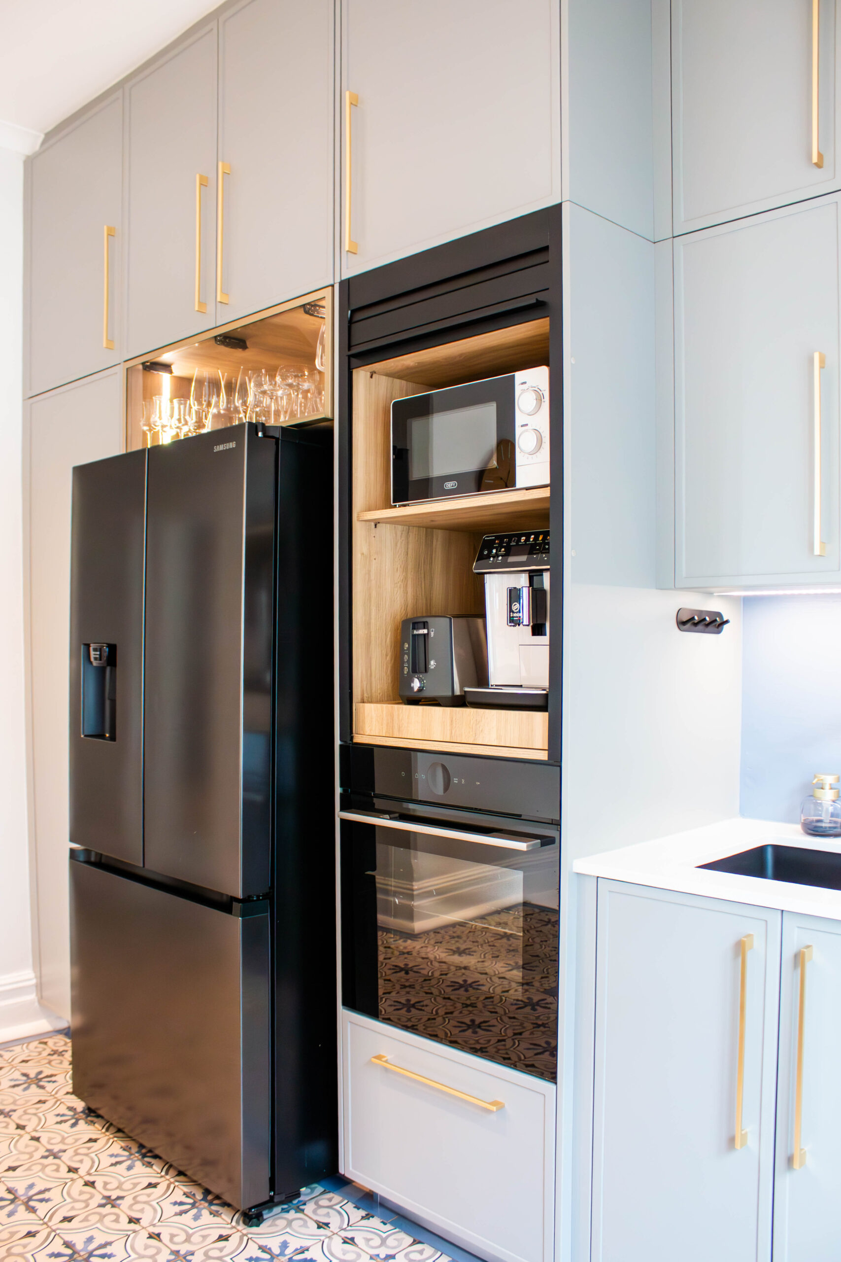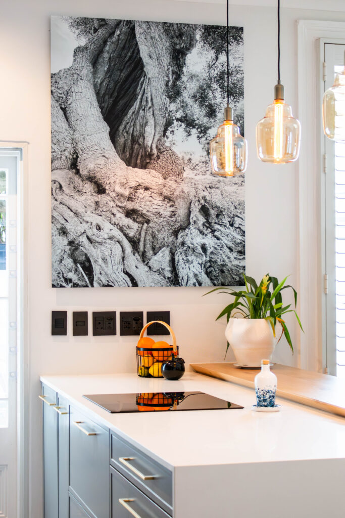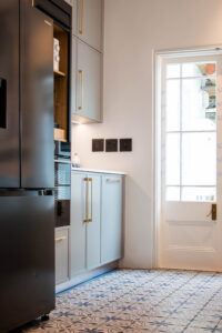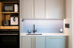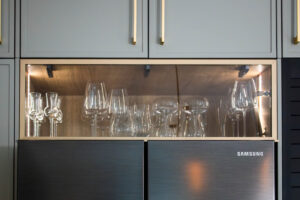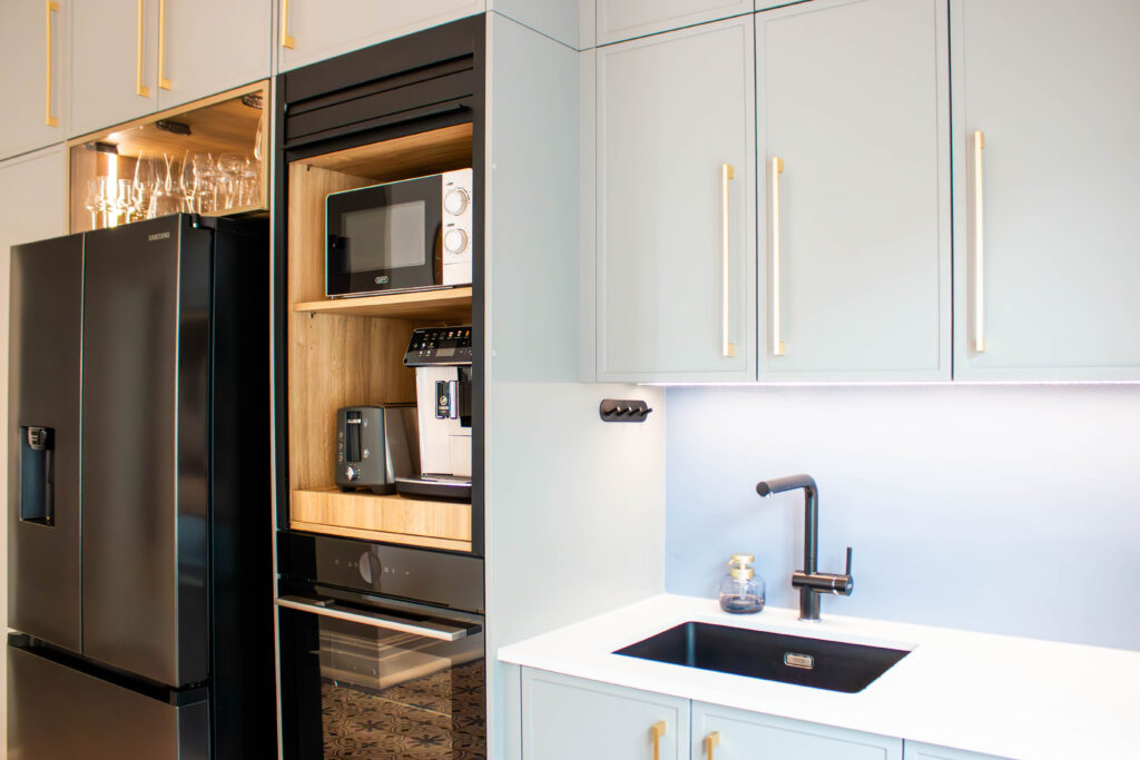 The Scandi Luxe Kitchen is a masterclass in understated elegance. Soft grey cabinetry with brushed gold handles sets a refined tone, while the natural timber breakfast bar and stools bring warmth and texture to the space. The white quartz worktop offers a crisp contrast, enhancing the kitchen’s light and airy feel. Pendant lighting in warm amber tones adds a golden glow, creating an inviting ambience perfect for both morning coffee and evening entertaining. Thoughtfully designed for functionality and beauty, this kitchen blends Scandinavian minimalism with subtle luxury for a timeless, welcoming space.