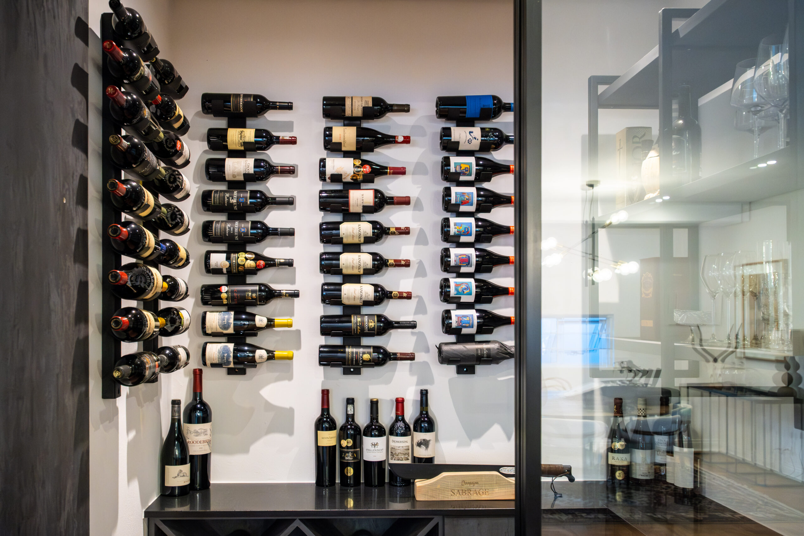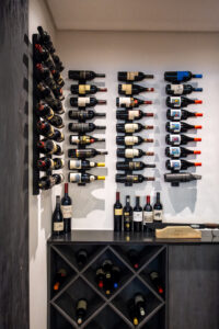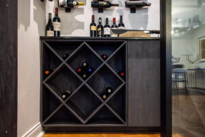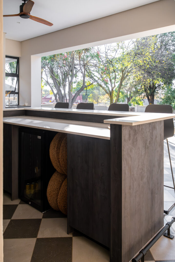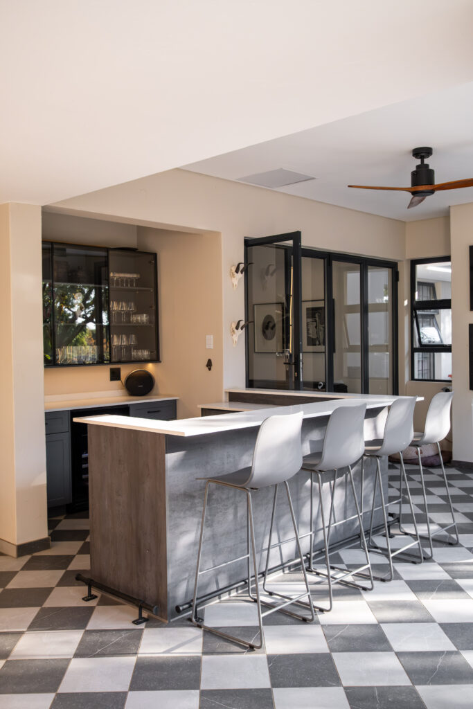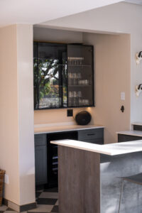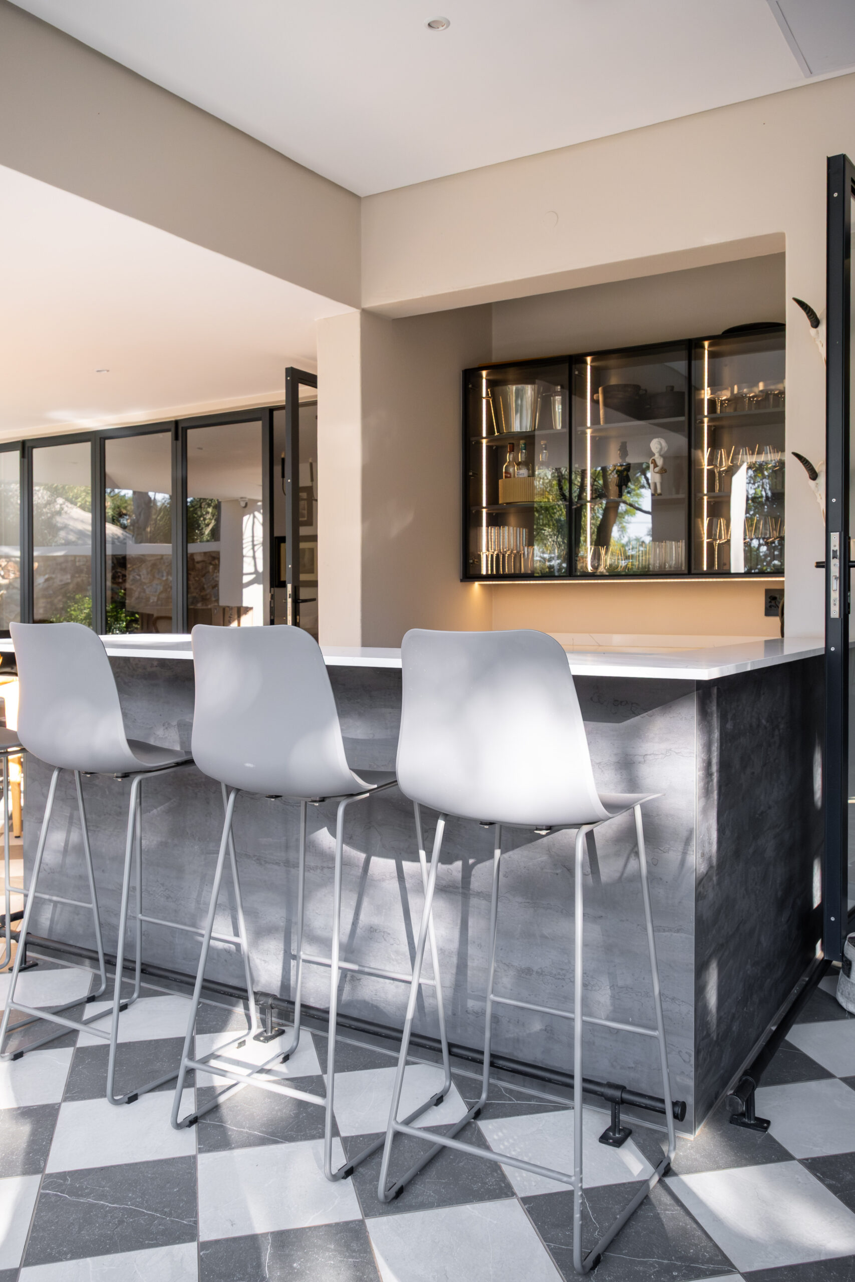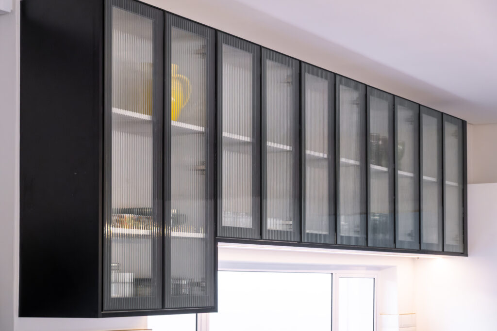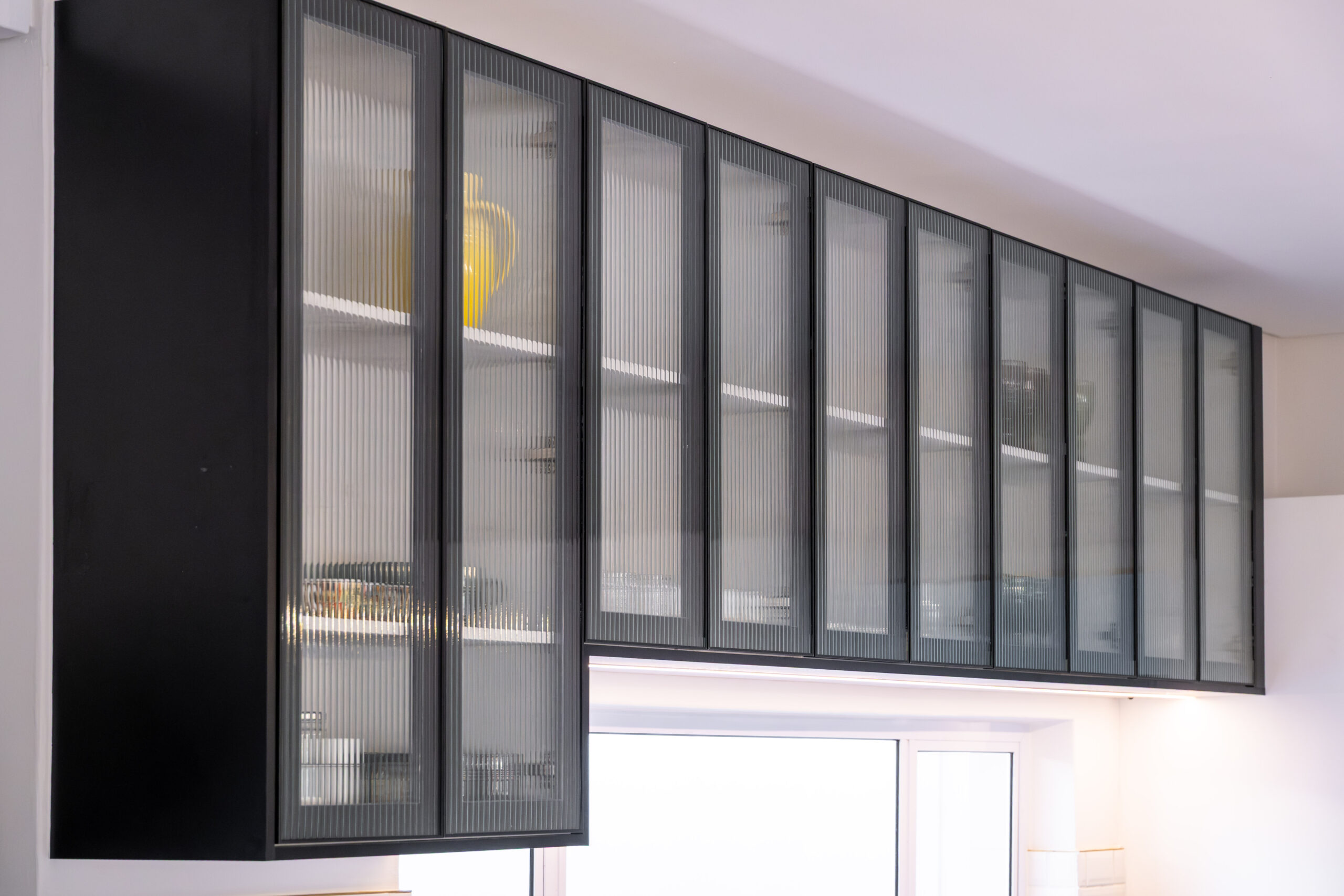 The kitchen design blends contemporary design with timeless elegance, creating a space that is both functional and visually striking. The crisp white cabinetry and marble-look countertops set a bright and sophisticated tone, while the warm parquet flooring and rich tan leather bar stools add depth and texture. Black-framed glass cabinets introduce a modern, urban edge, perfectly complemented by sleek black appliances and statement brass lighting.