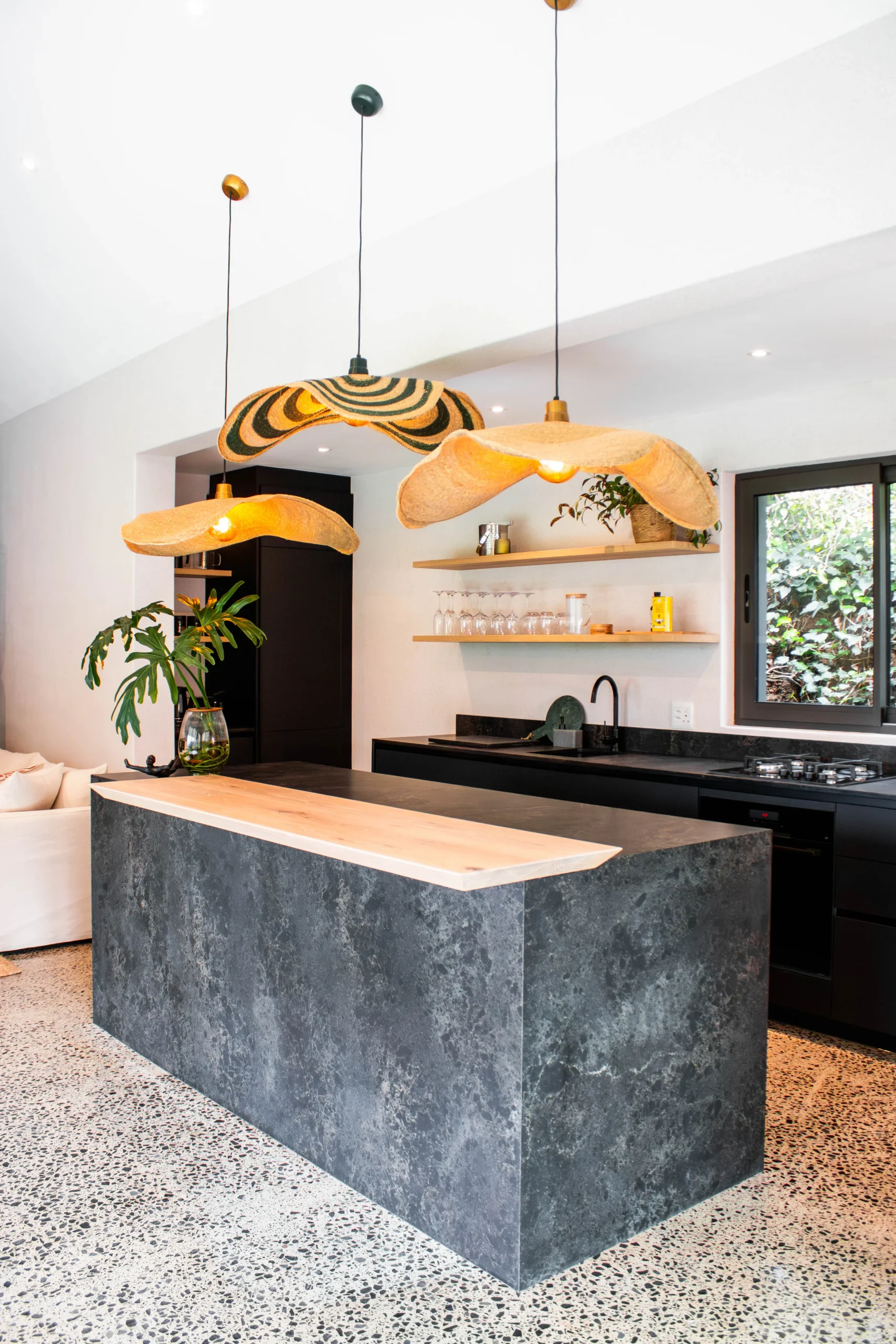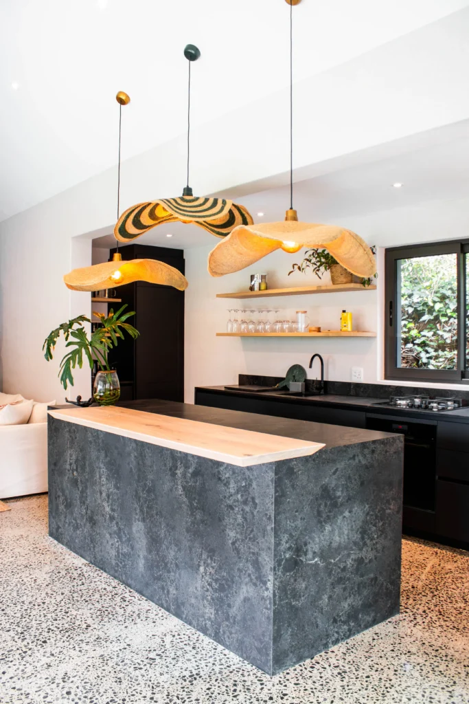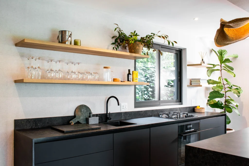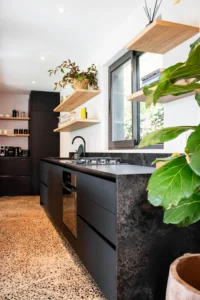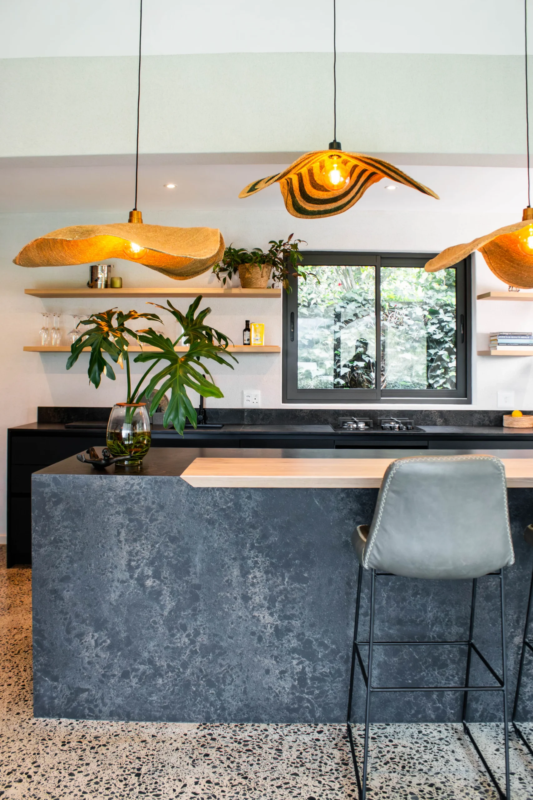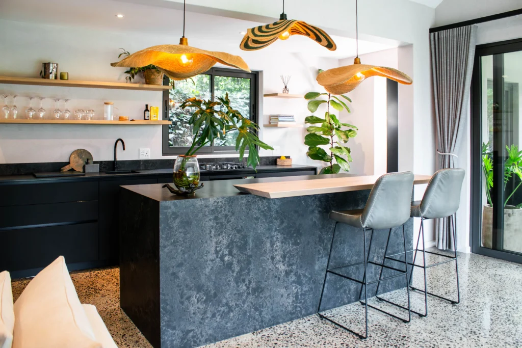 A seamless blend of contemporary elegance and natural warmth, the Urban Oasis Kitchen is designed for both style and functionality. The striking charcoal cabinetry and textured stone island create a bold, modern foundation, beautifully contrasted by open wooden shelving and organic pendant lighting. Lush greenery softens the sleek lines, bringing a sense of tranquillity and life into the space. The extended breakfast bar invites casual dining and conversation, while the open-plan layout ensures effortless flow for both cooking and entertaining. This kitchen is a perfect harmony of city sophistication and calming, nature-inspired design.