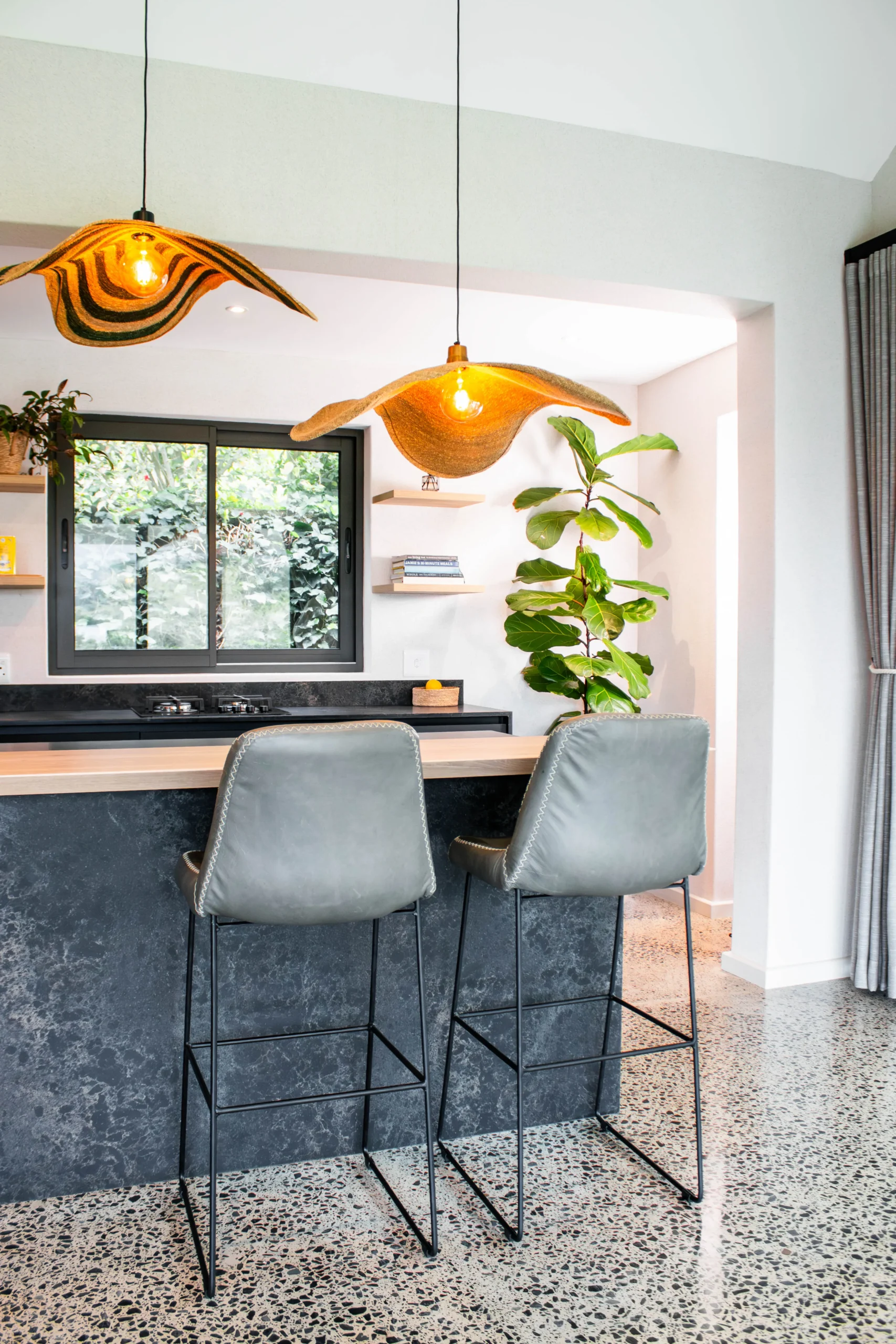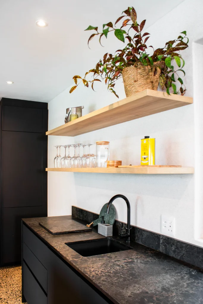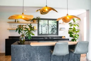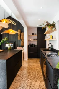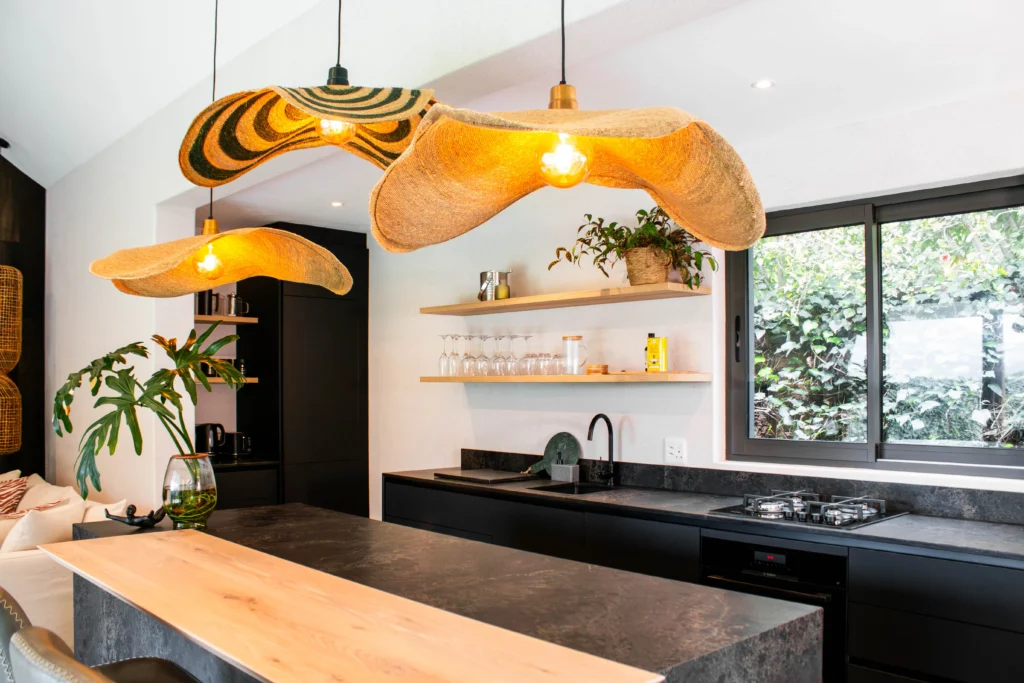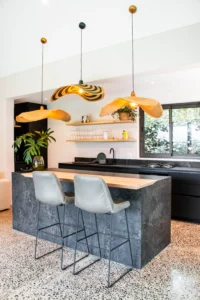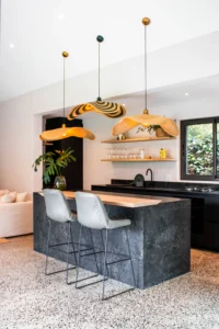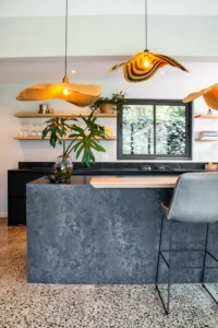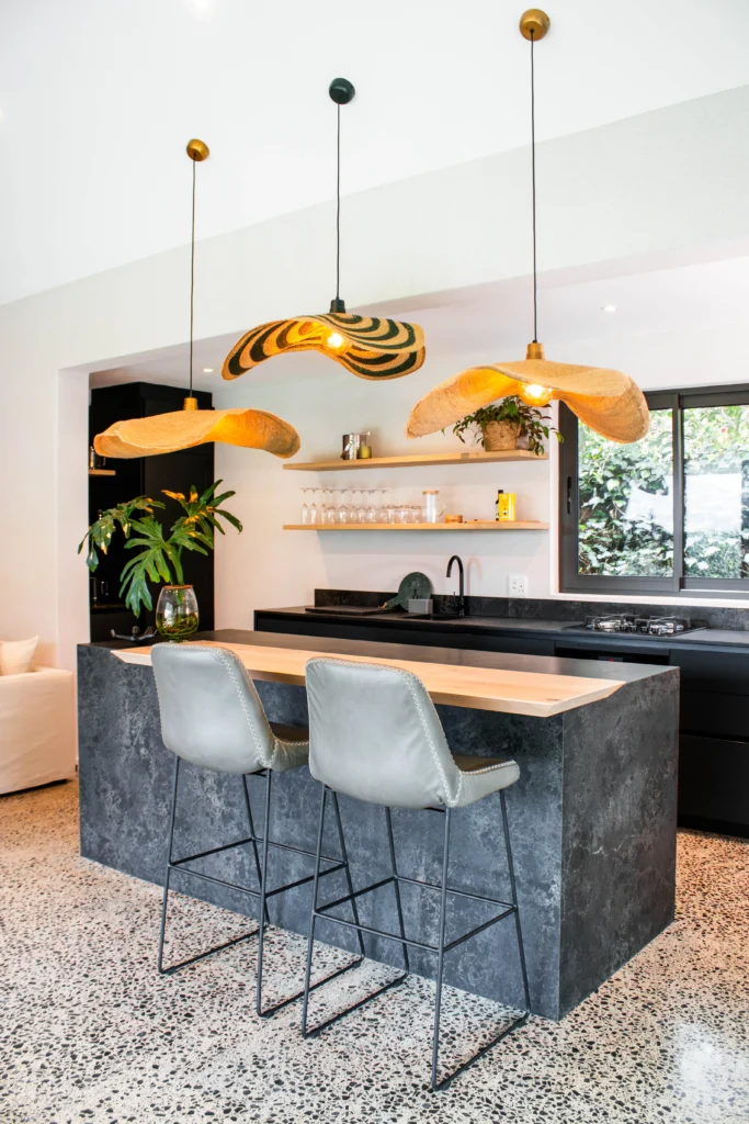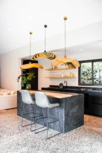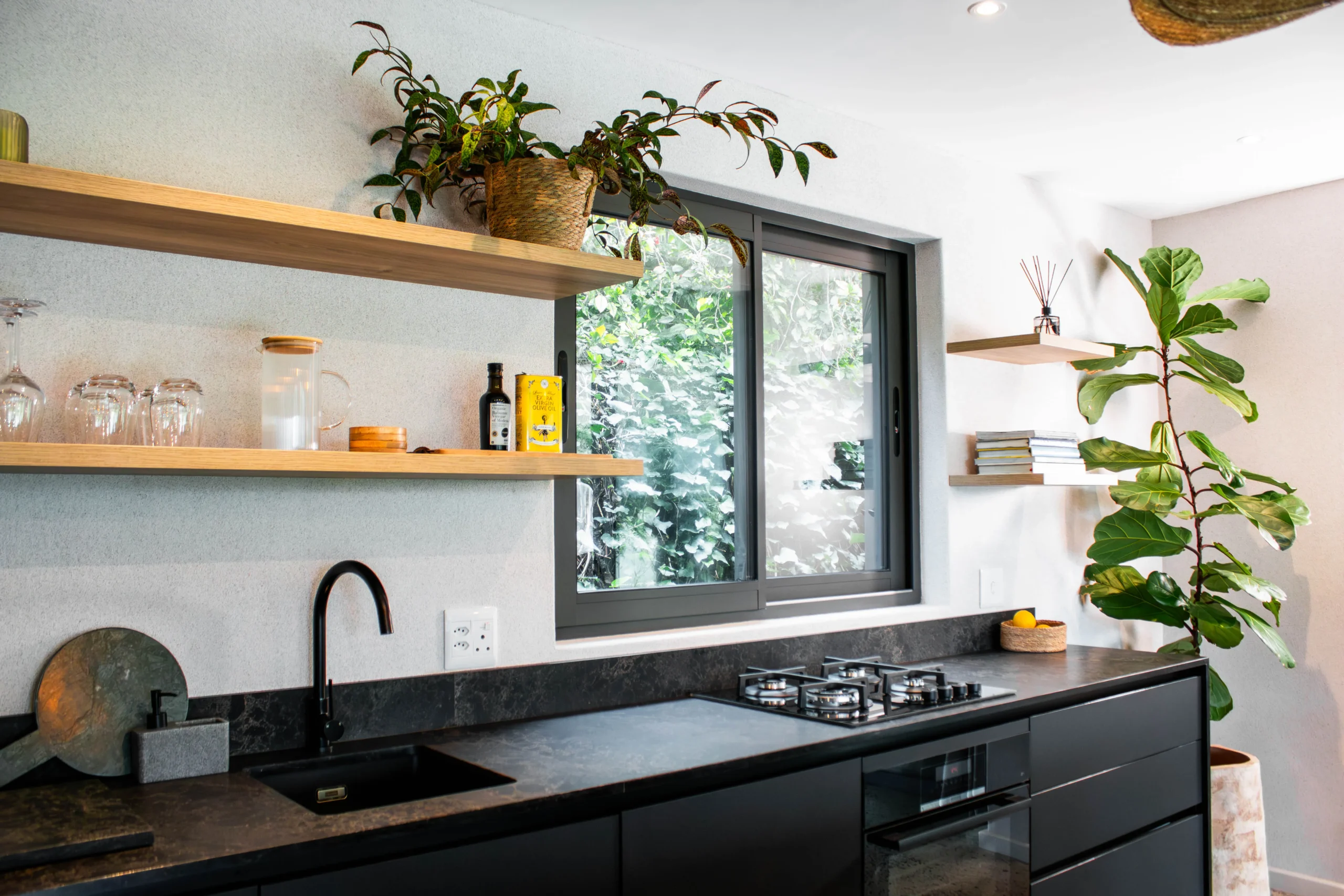 A seamless blend of contemporary elegance and natural warmth, the Urban Oasis Kitchen is designed for both style and functionality. The striking charcoal cabinetry and textured stone island create a bold, modern foundation, beautifully contrasted by open wooden shelving and organic pendant lighting. Lush greenery softens the sleek lines, bringing a sense of tranquillity and life into the space. The extended breakfast bar invites casual dining and conversation, while the open-plan layout ensures effortless flow for both cooking and entertaining. This kitchen is a perfect harmony of city sophistication and calming, nature-inspired design.