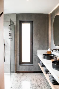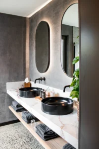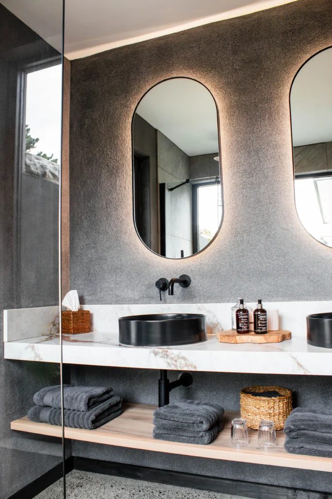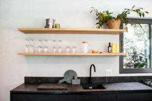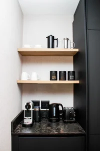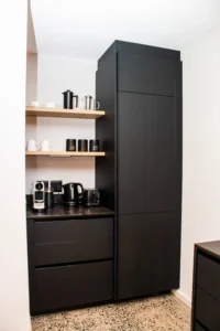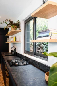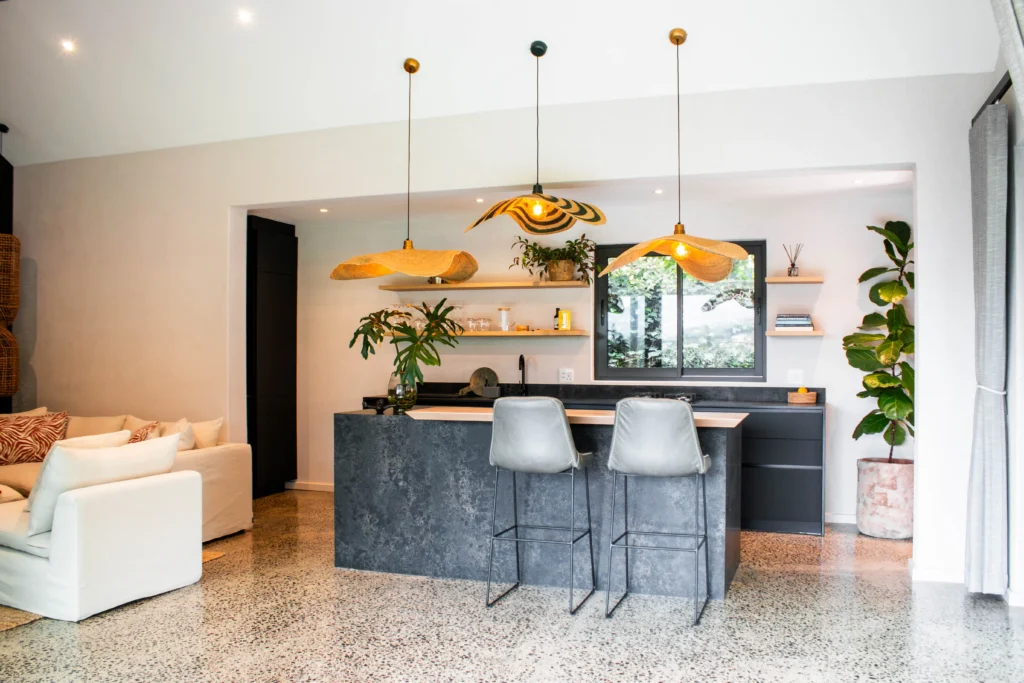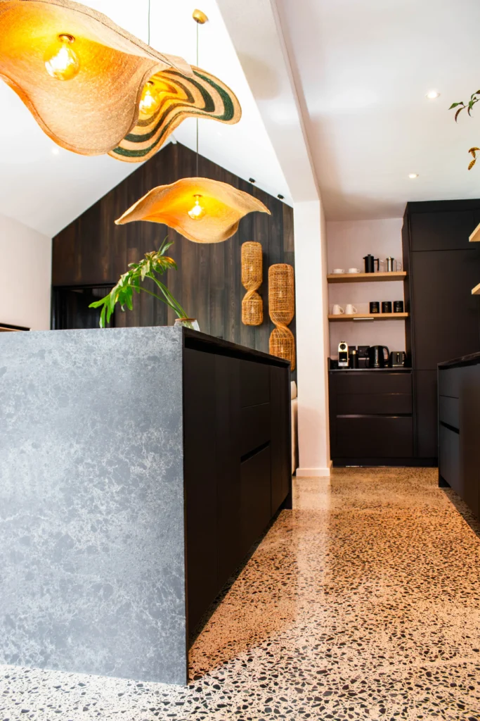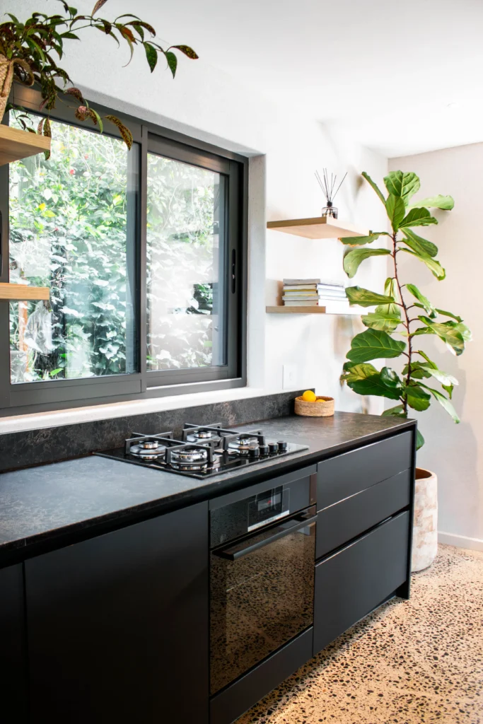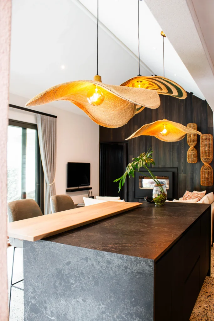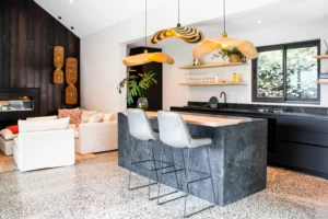A seamless blend of contemporary elegance and natural warmth, the Urban Oasis Kitchen is designed for both style and functionality. The striking charcoal cabinetry and textured stone island create a bold, modern foundation, beautifully contrasted by open wooden shelving and organic pendant lighting. Lush greenery softens the sleek lines, bringing a sense of tranquillity and life into the space. The extended breakfast bar invites casual dining and conversation, while the open-plan layout ensures effortless flow for both cooking and entertaining. This kitchen is a perfect harmony of city sophistication and calming, nature-inspired design.