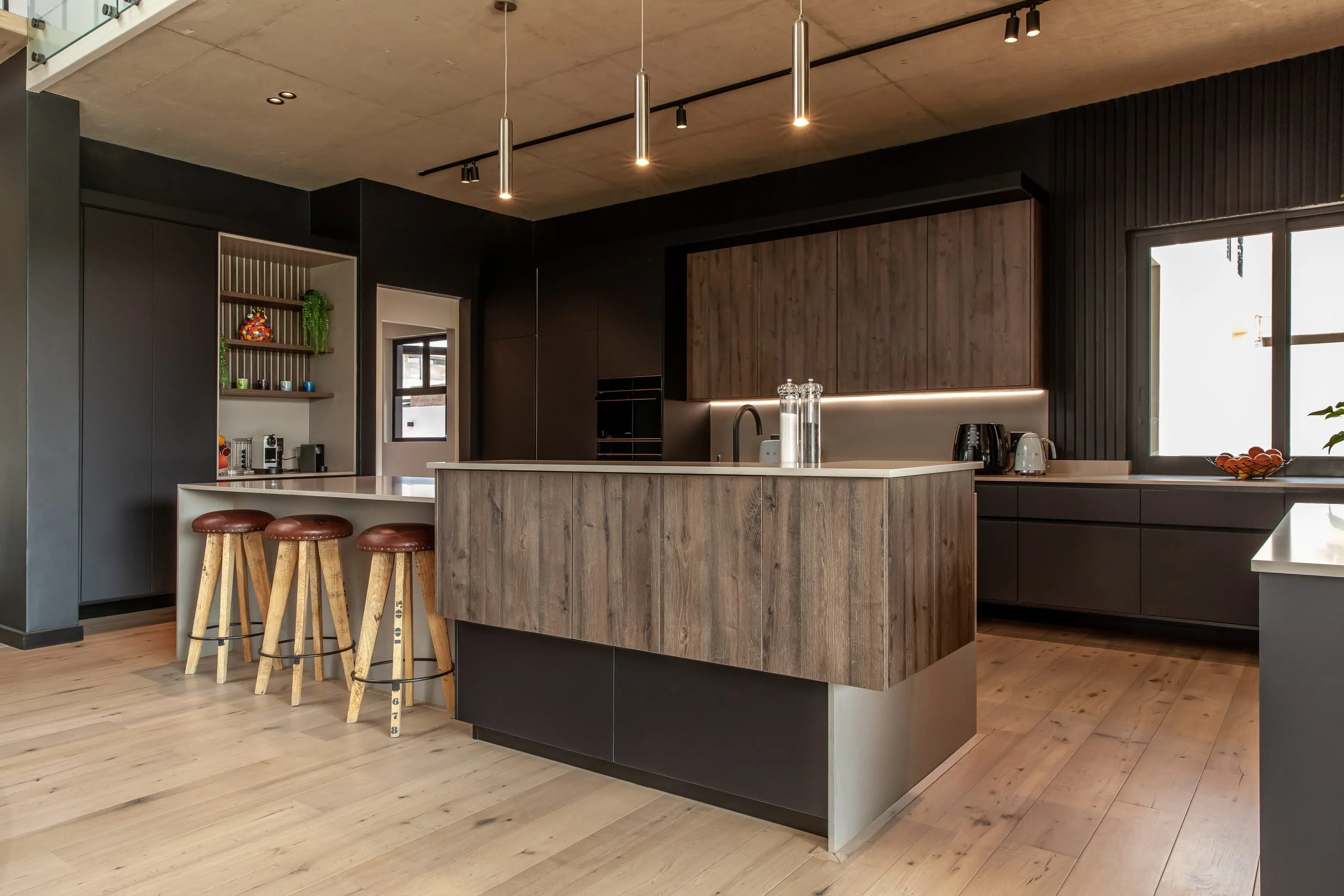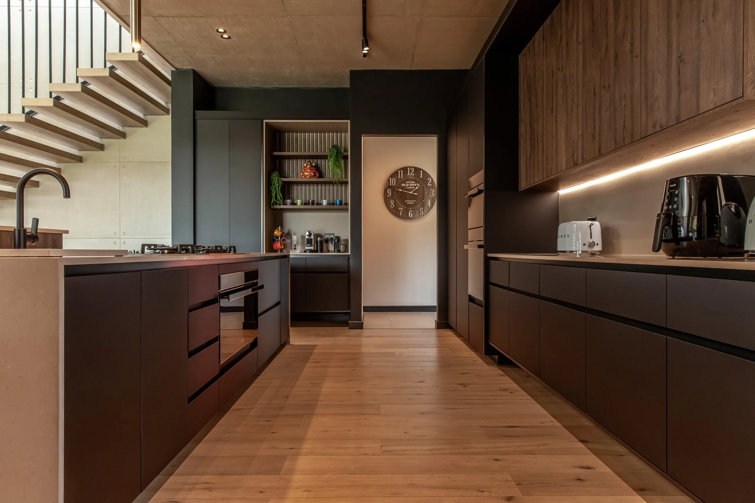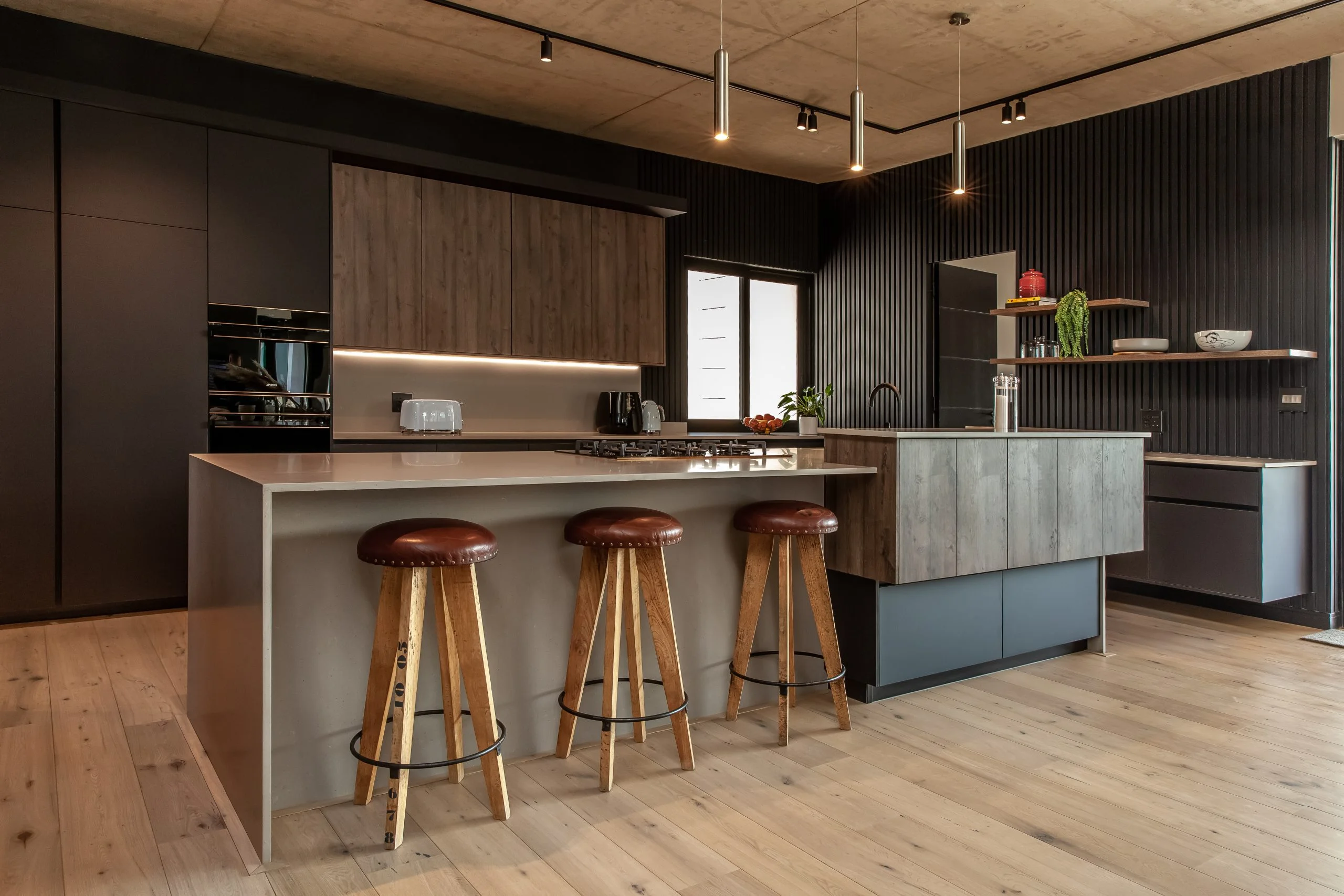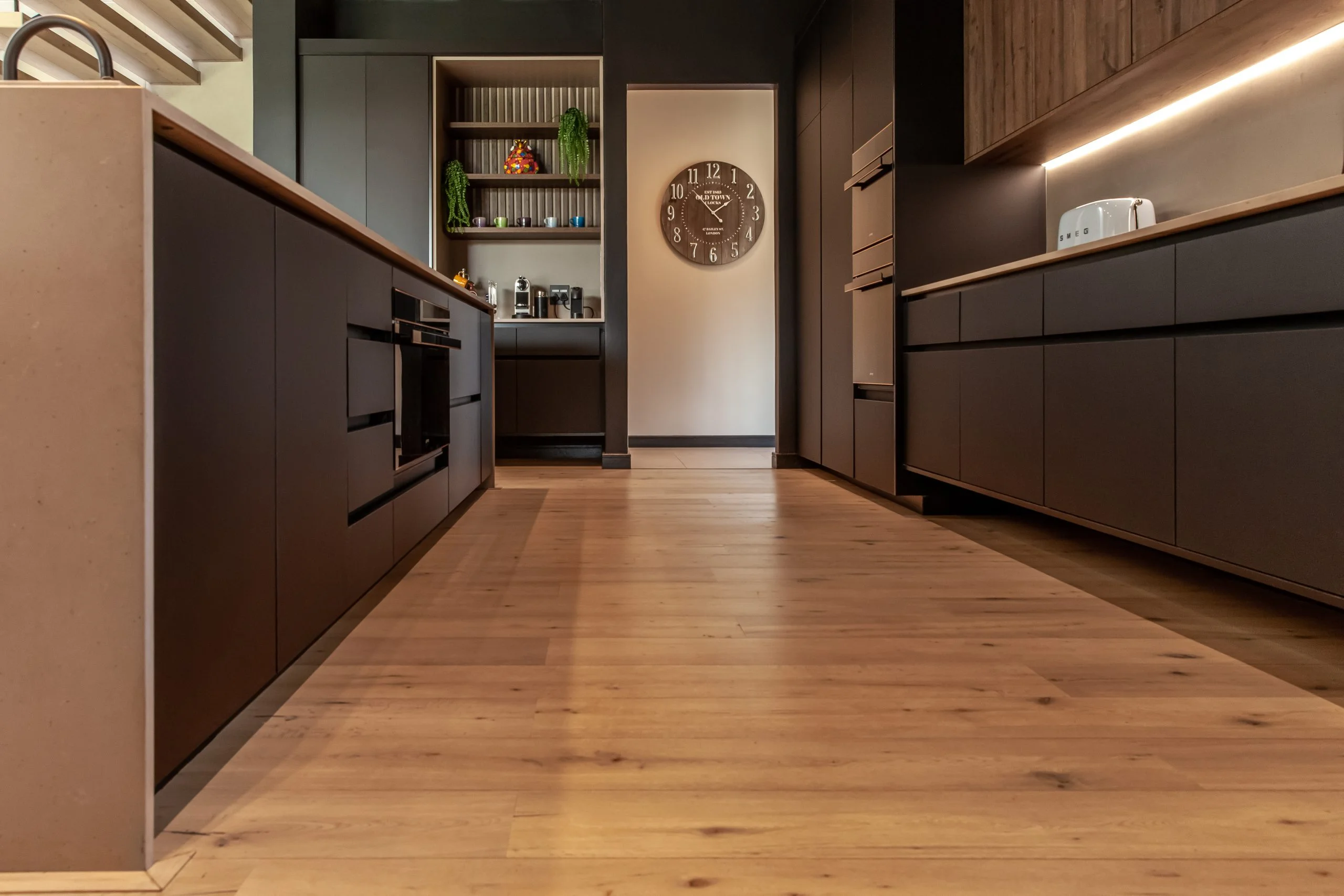 Together with an interior designer, we transformed a kitchen that simply didn’t work for the client, into one that functions and makes their lives easier! This modern kitchen uses elements of Seno Black Matt and Oak Historic Kent as well as Oak End Grain to give it a unique look, while the PG Bison Folkstone Grey ties everything together seamlessly. We used a variety of countertops to achieve the final look which includes Caesarstone Black Tempal and Wild Storm, Soda Lifestone, and Infinity Stone Milan. The entire home was designed using Blum’s BLUMOTION Onyx Tamdenbox runners and tip-on hinges as well as grip handles. The use of textures really give an inspired look and feel. For an extra touch of magic, we added Smeg’s Dolce Range to accompany their integrated appliances.