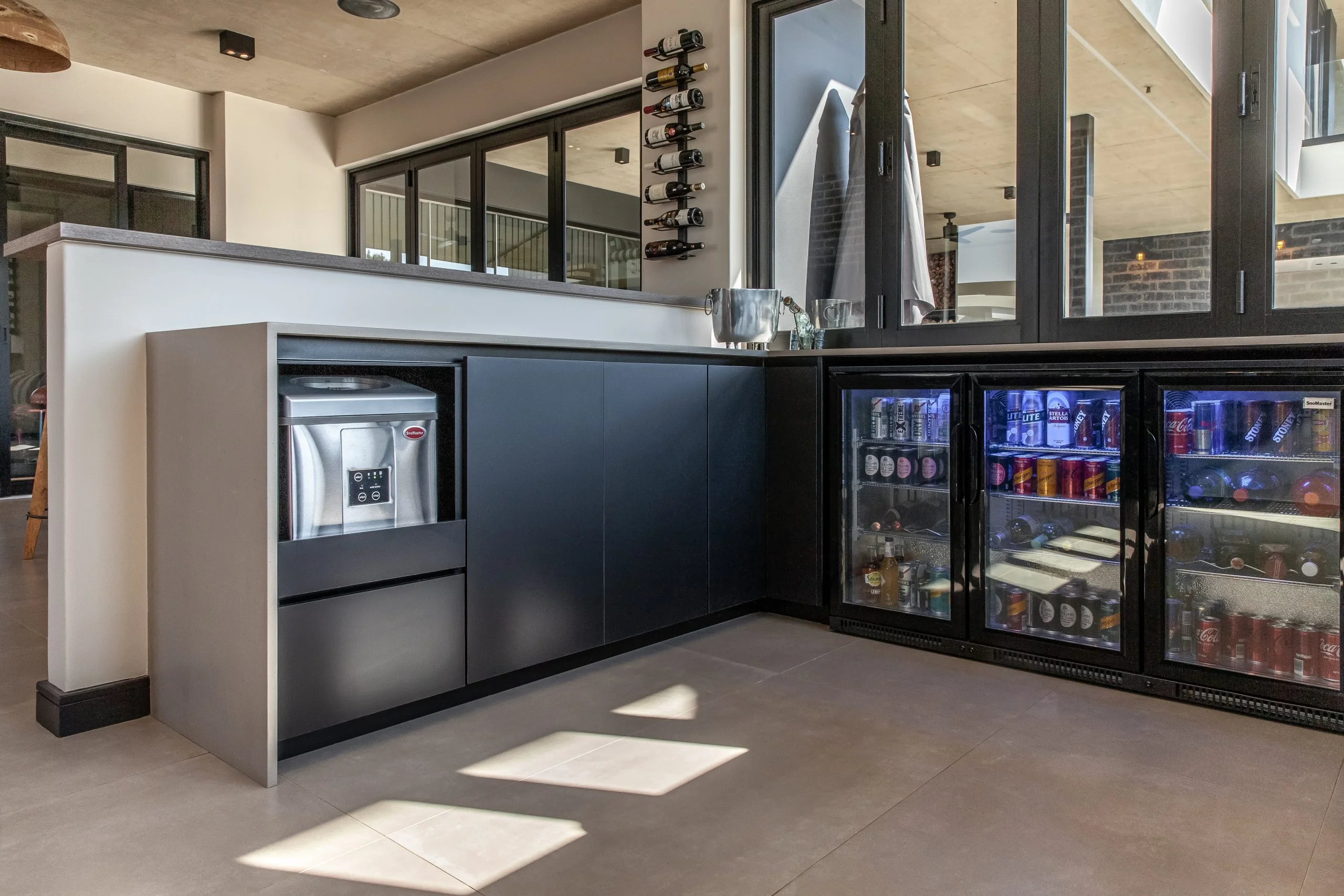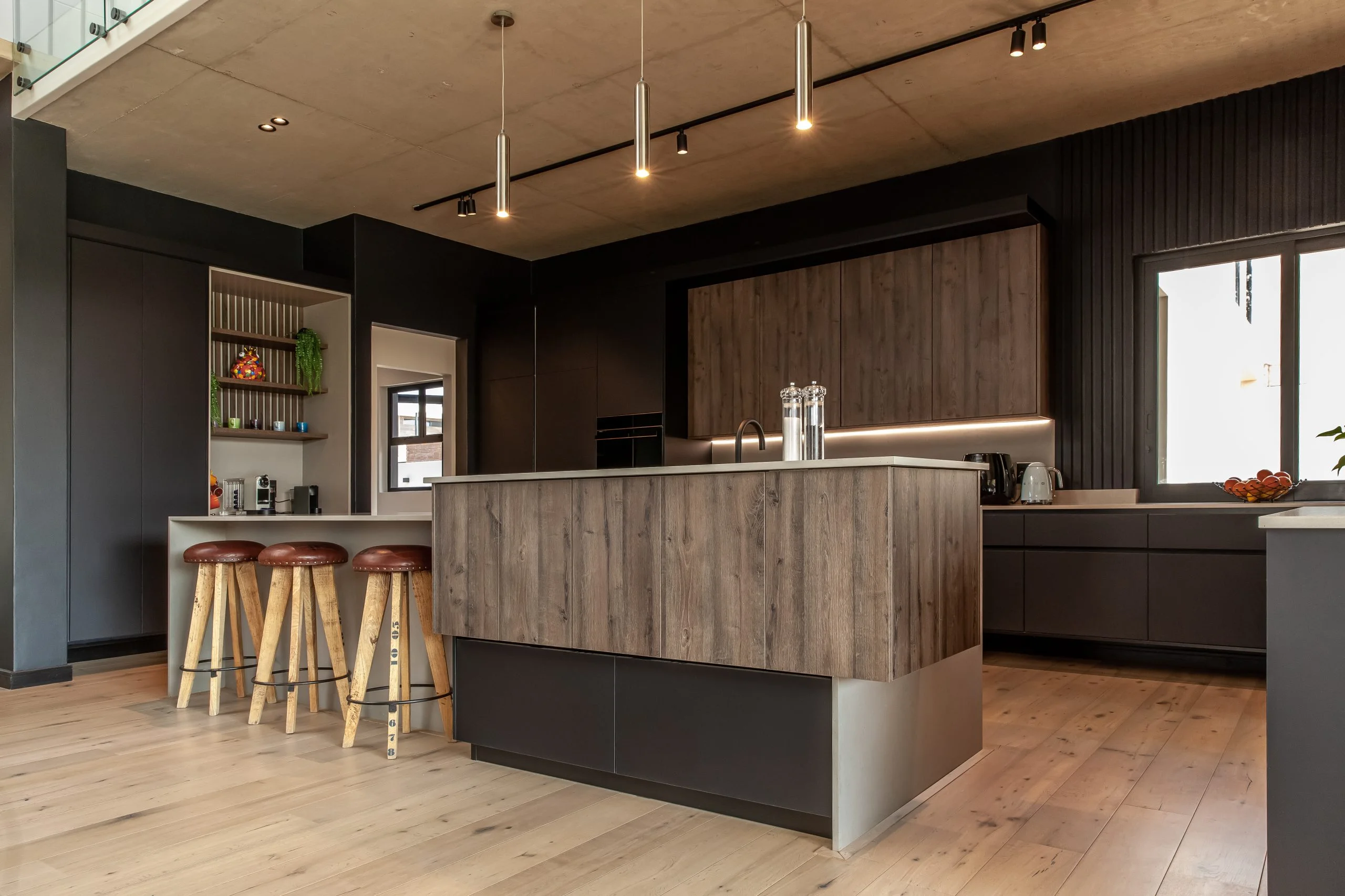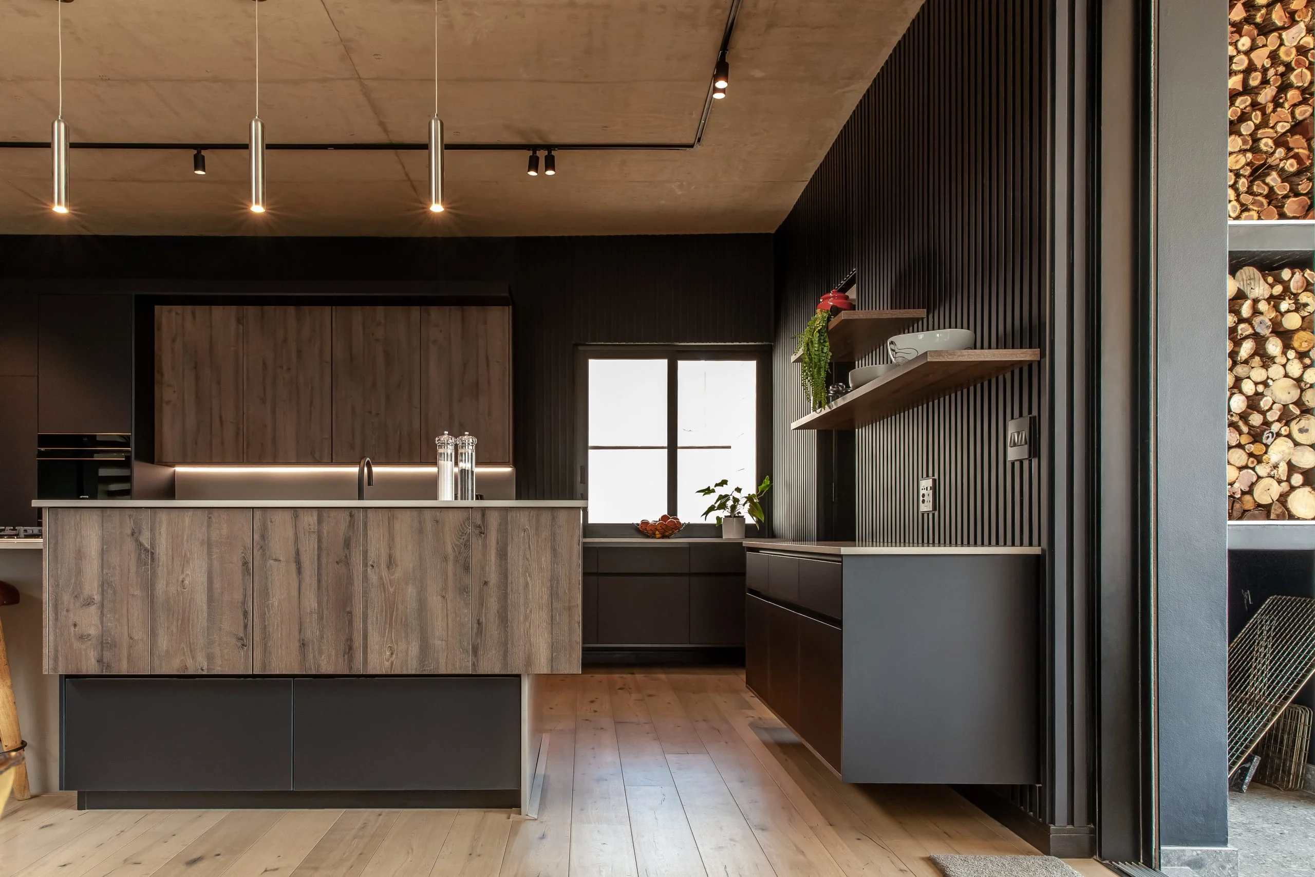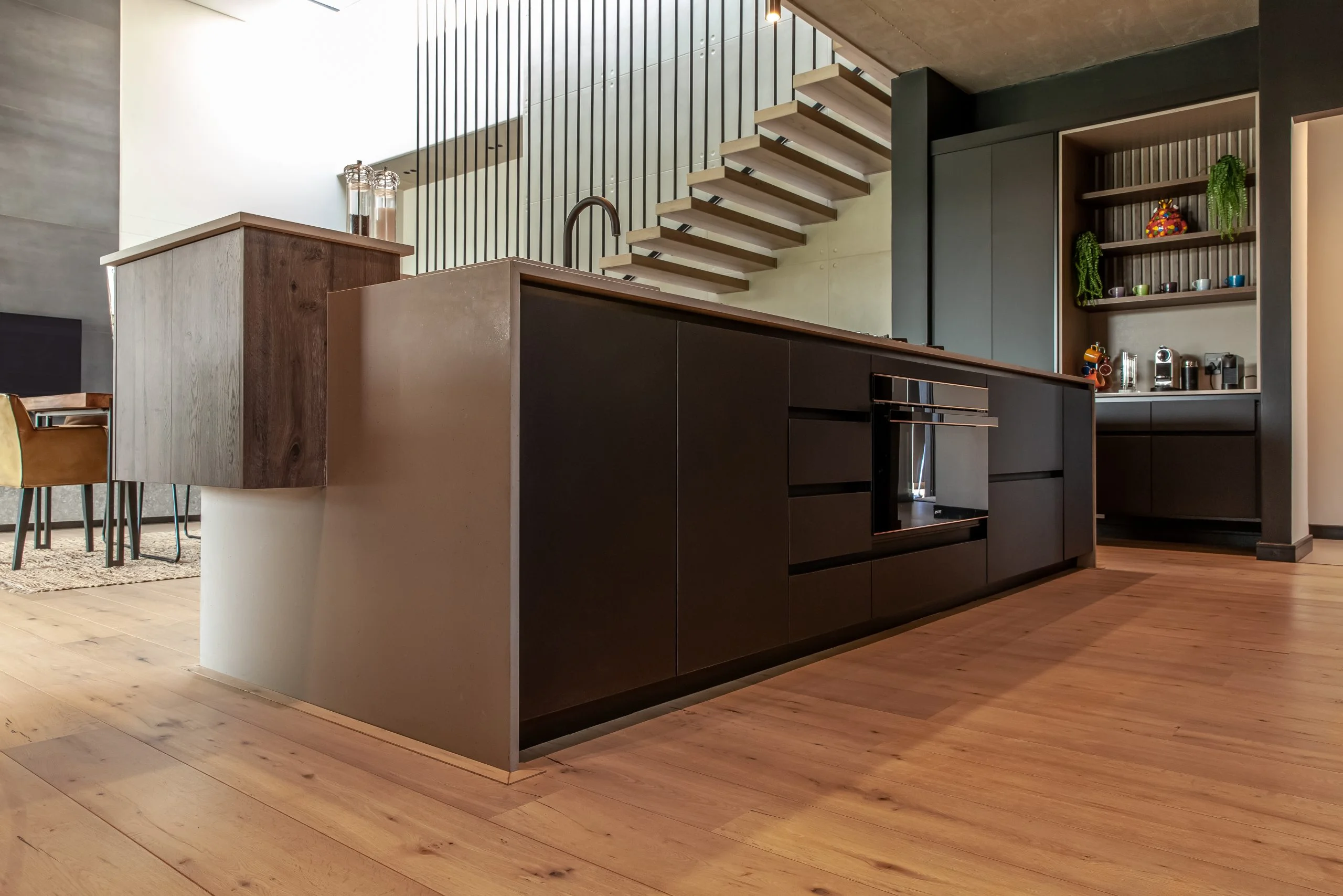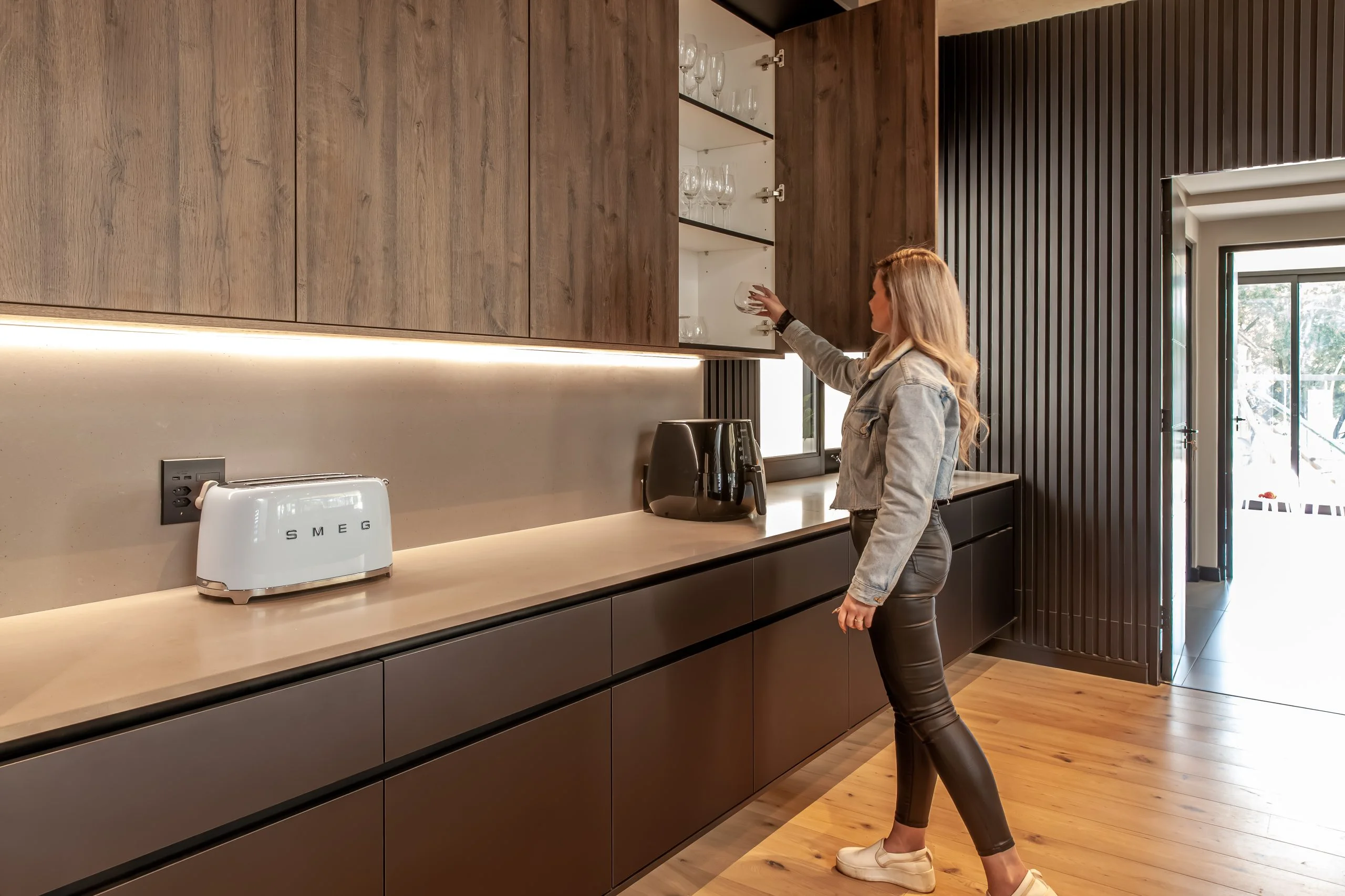 Together with an interior designer, we transformed a kitchen that simply didn’t work for the client, into one that functions and makes their lives easier! This modern kitchen uses elements of Seno Black Matt and Oak Historic Kent as well as Oak End Grain to give it a unique look, while the PG Bison Folkstone Grey ties everything together seamlessly. We used a variety of countertops to achieve the final look which includes Caesarstone Black Tempal and Wild Storm, Soda Lifestone, and Infinity Stone Milan. The entire home was designed using Blum’s BLUMOTION Onyx Tamdenbox runners and tip-on hinges as well as grip handles. The use of textures really give an inspired look and feel. For an extra touch of magic, we added Smeg’s Dolce Range to accompany their integrated appliances.
