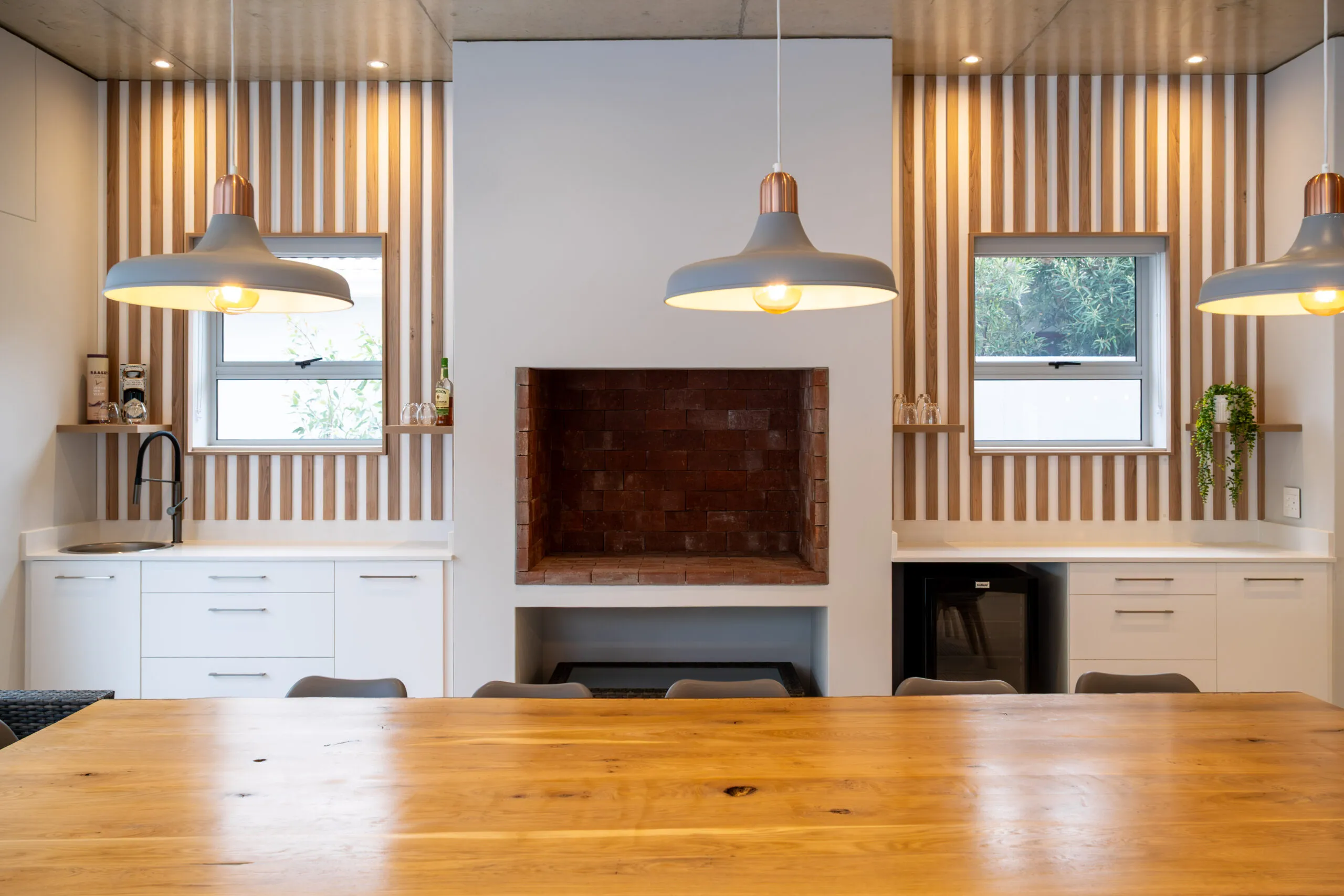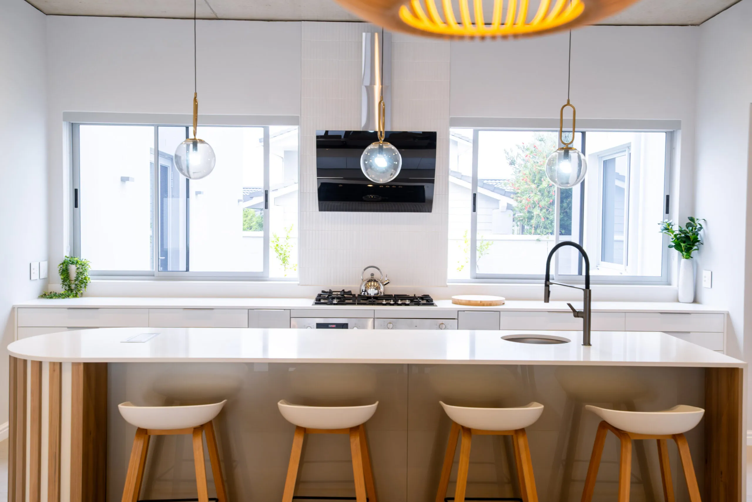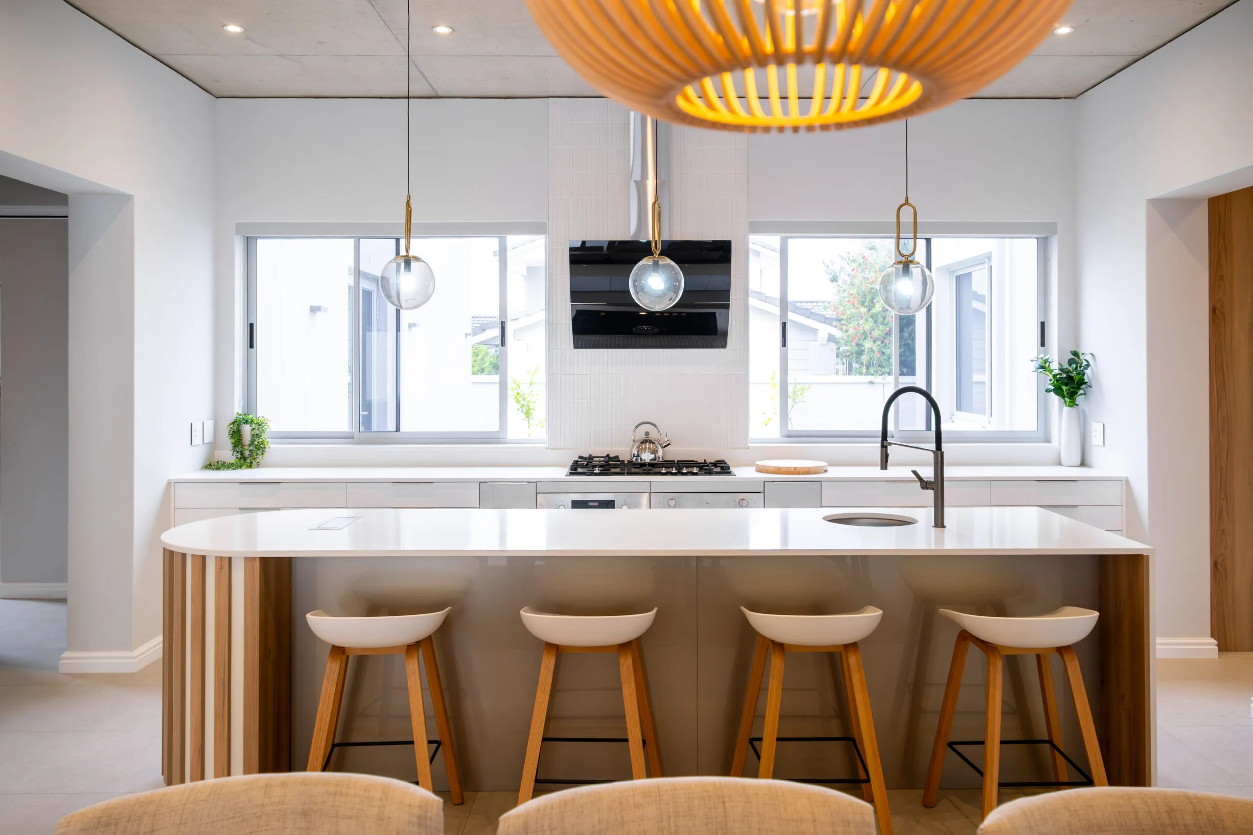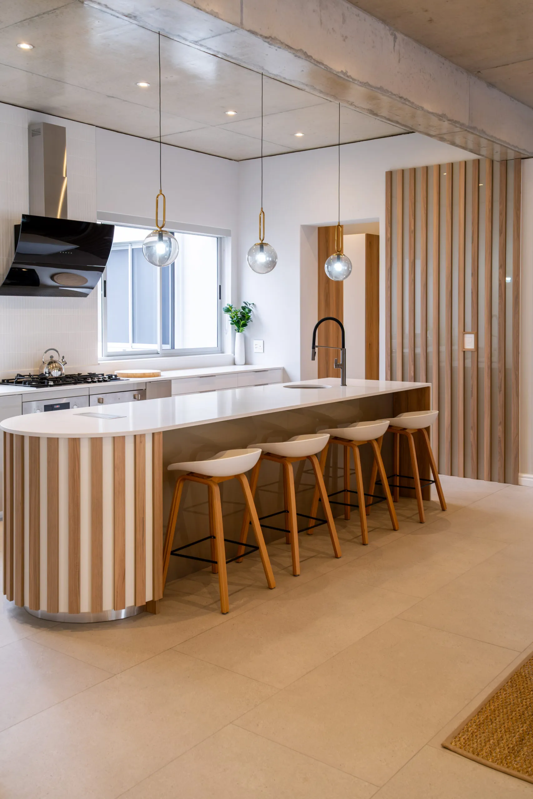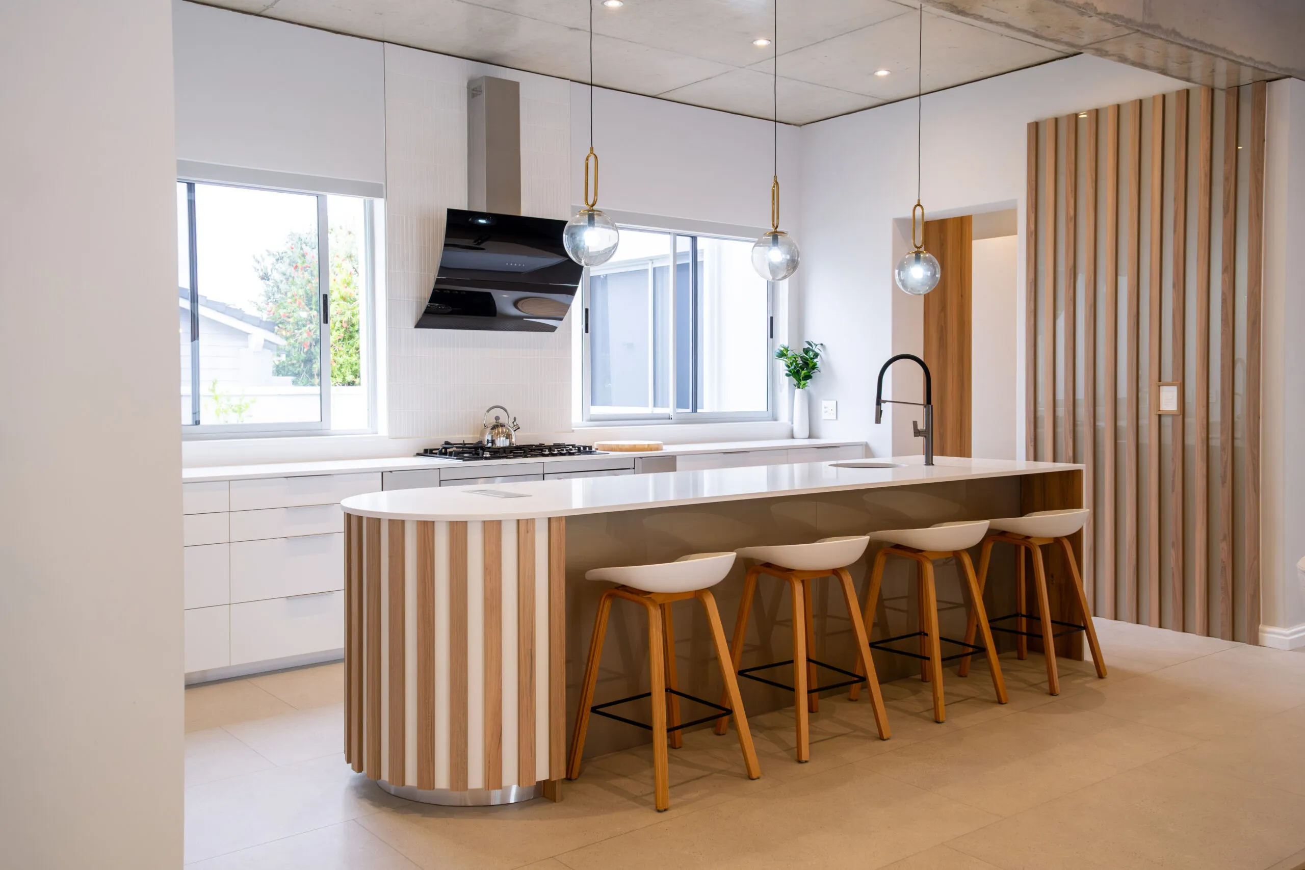 This modern kitchen blends clean lines with natural textures for a sleek, coastal feel. The curved island with timber slats and white countertop is a standout feature, paired with stylish barstools and pendant lighting. Large windows bring in natural light, while the black tap and extractor add a bold, contemporary touch.