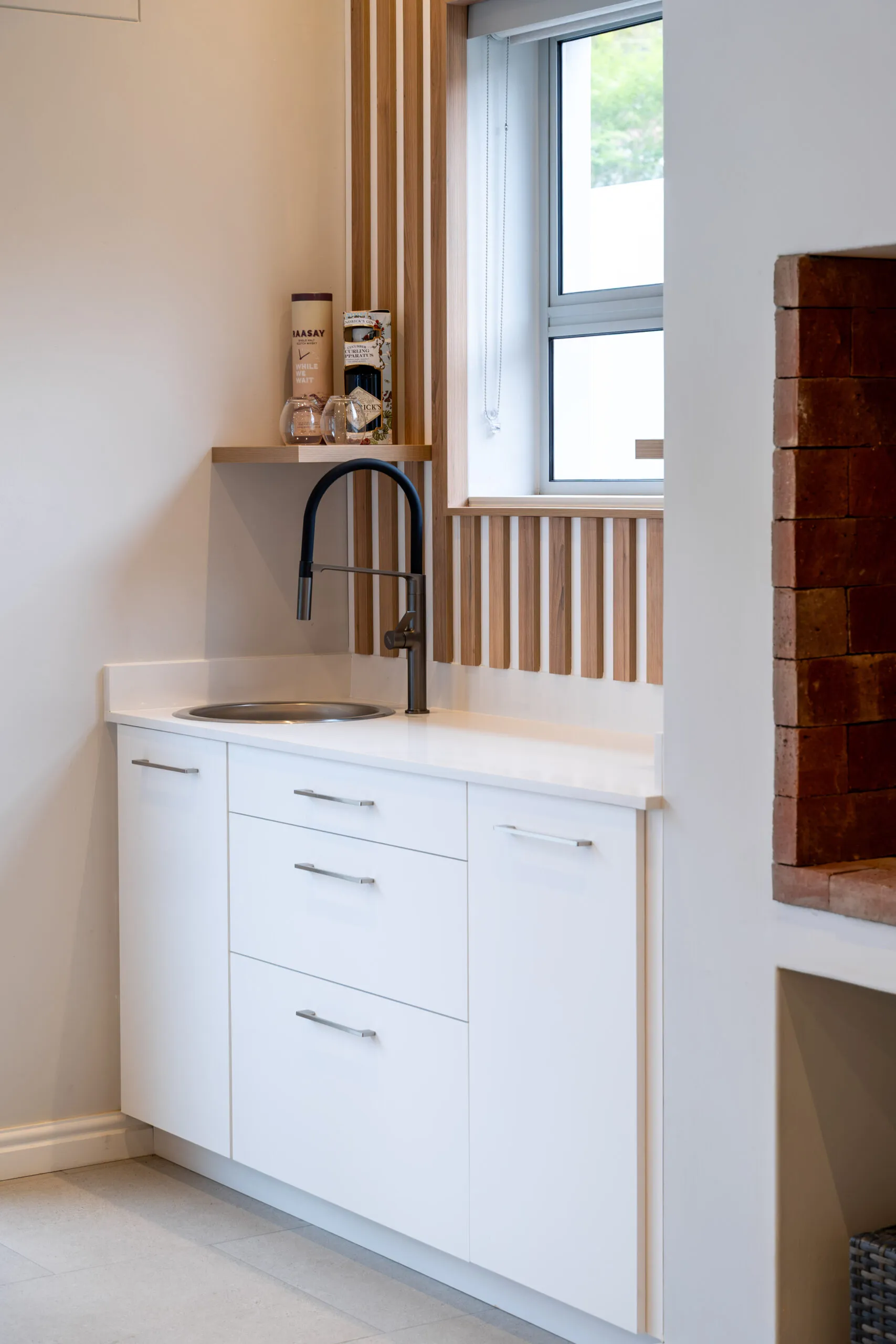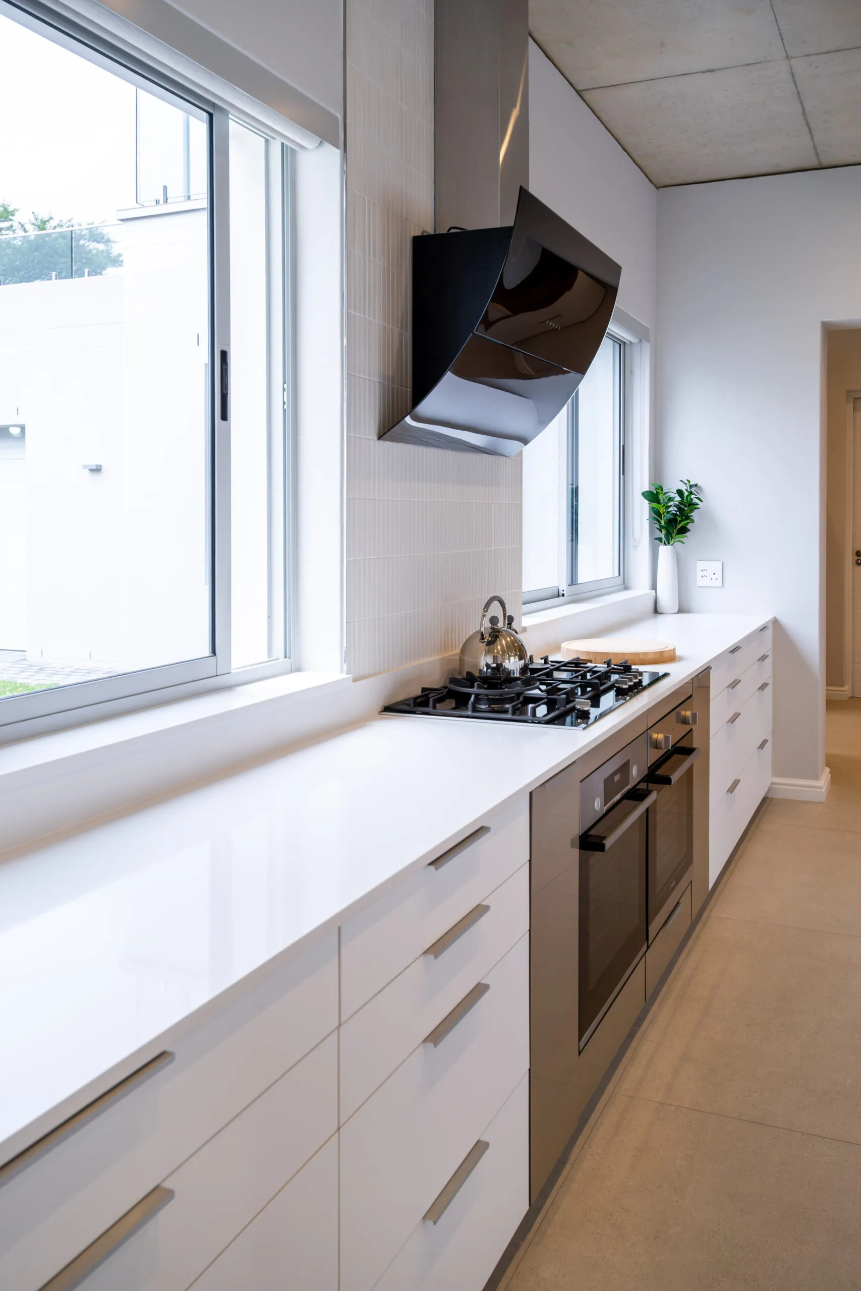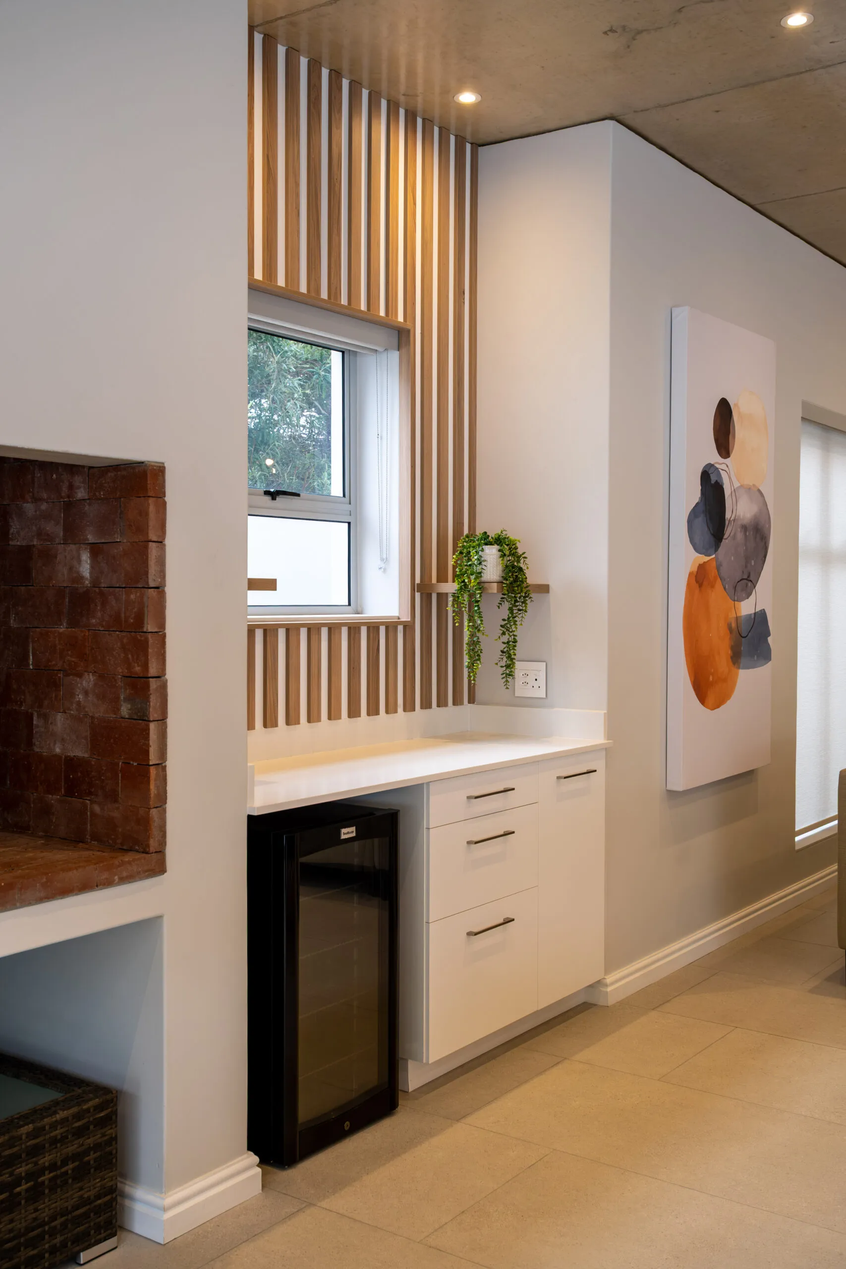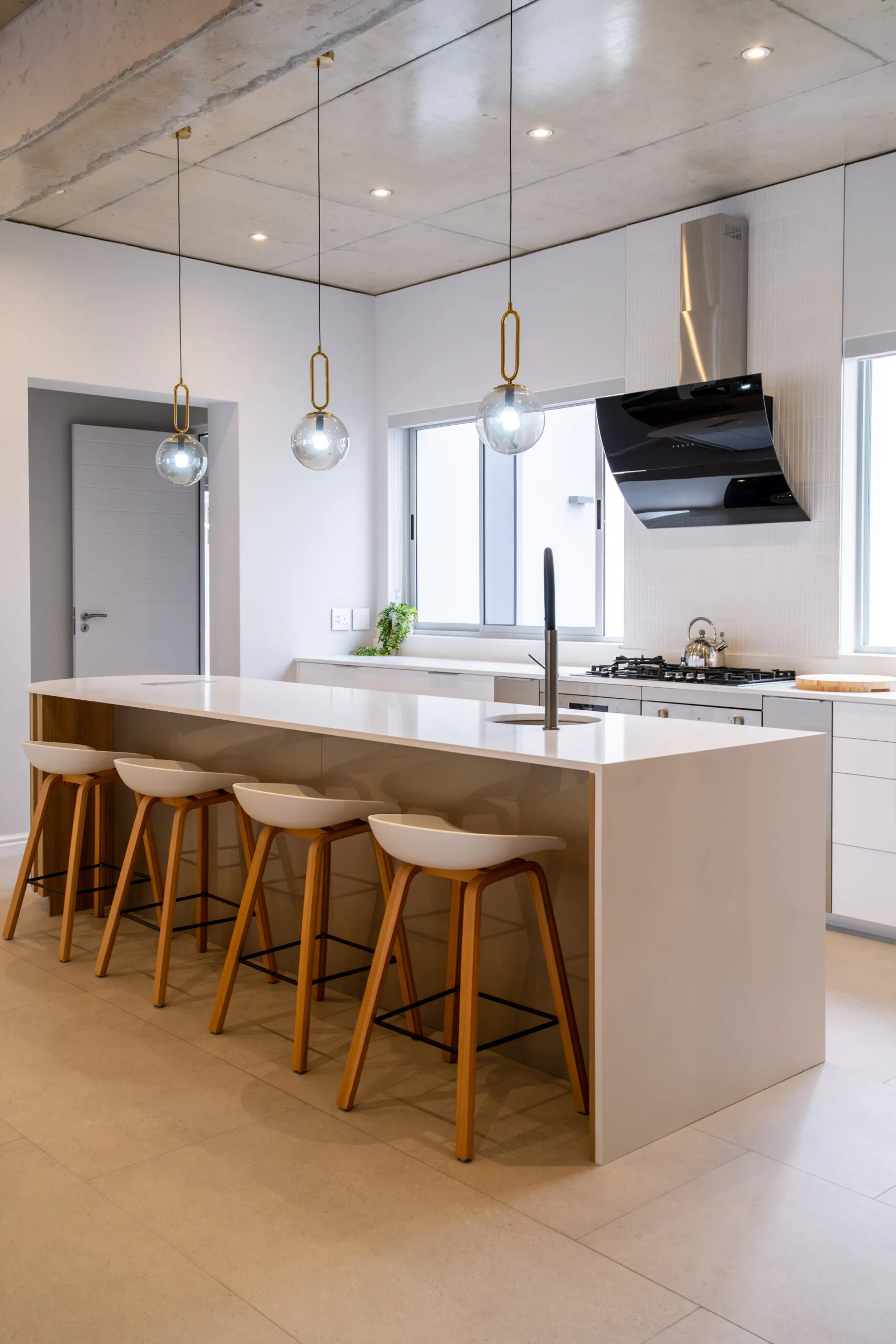 This modern kitchen blends clean lines with natural textures for a sleek, coastal feel. The curved island with timber slats and white countertop is a standout feature, paired with stylish barstools and pendant lighting. Large windows bring in natural light, while the black tap and extractor add a bold, contemporary touch.