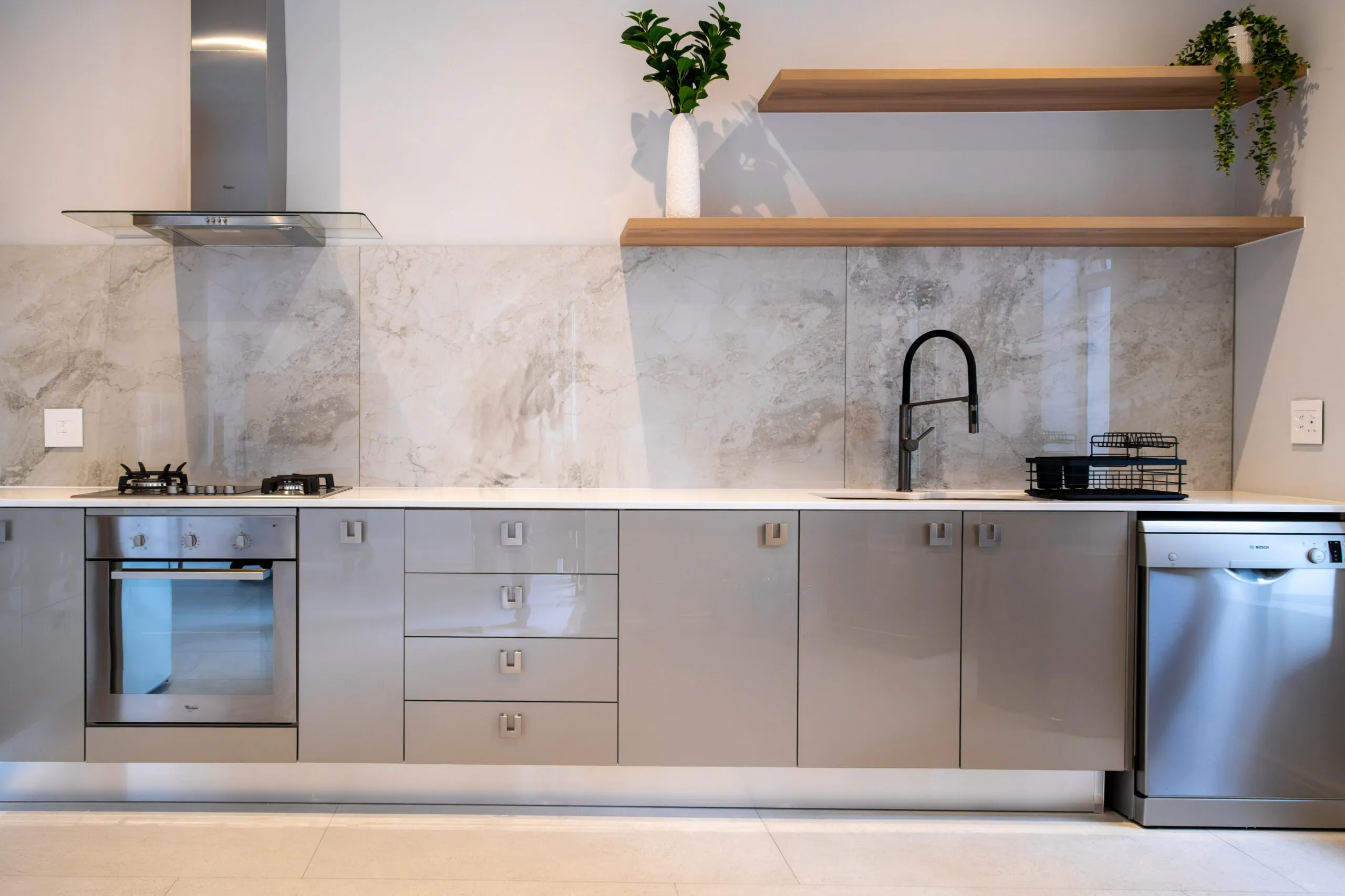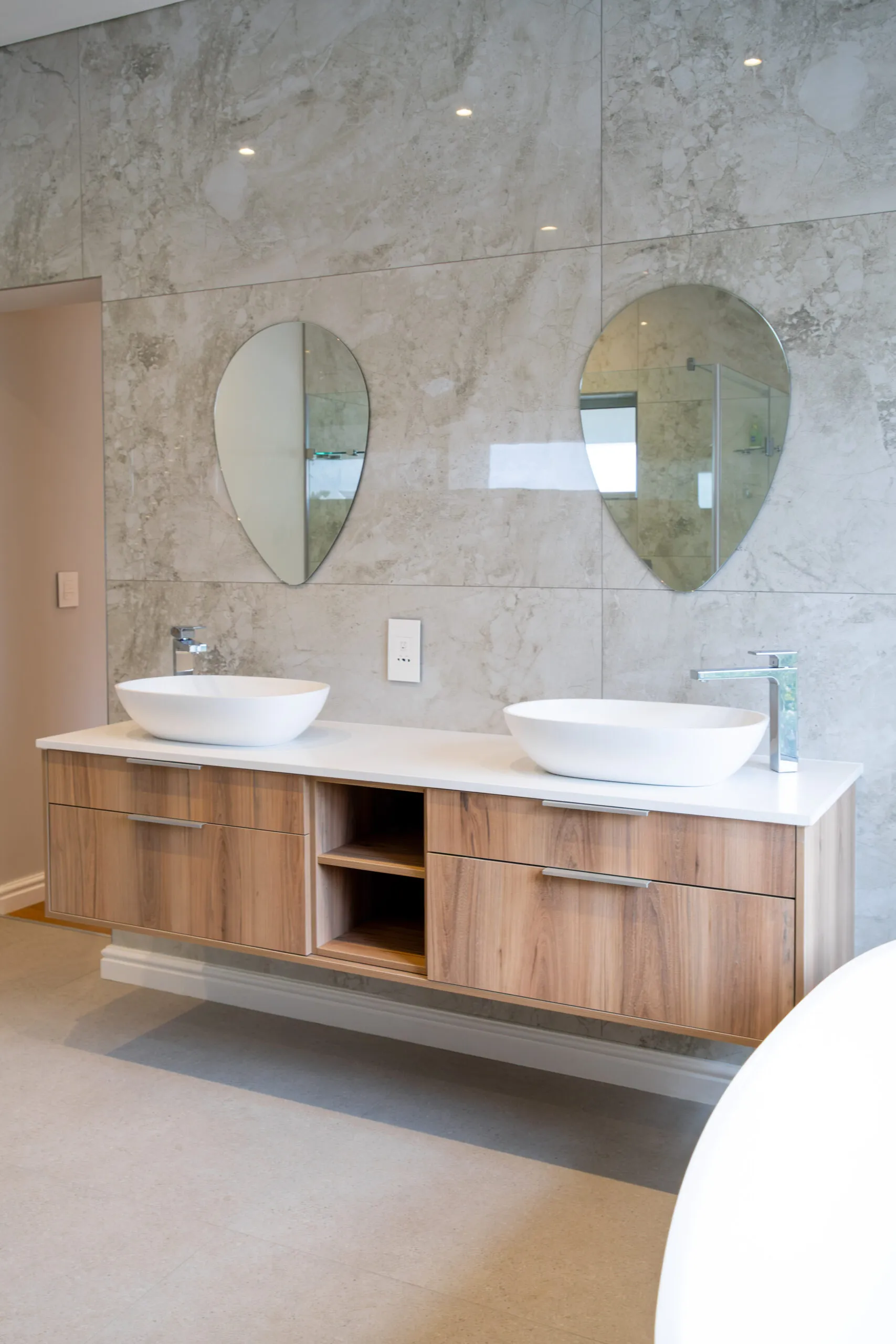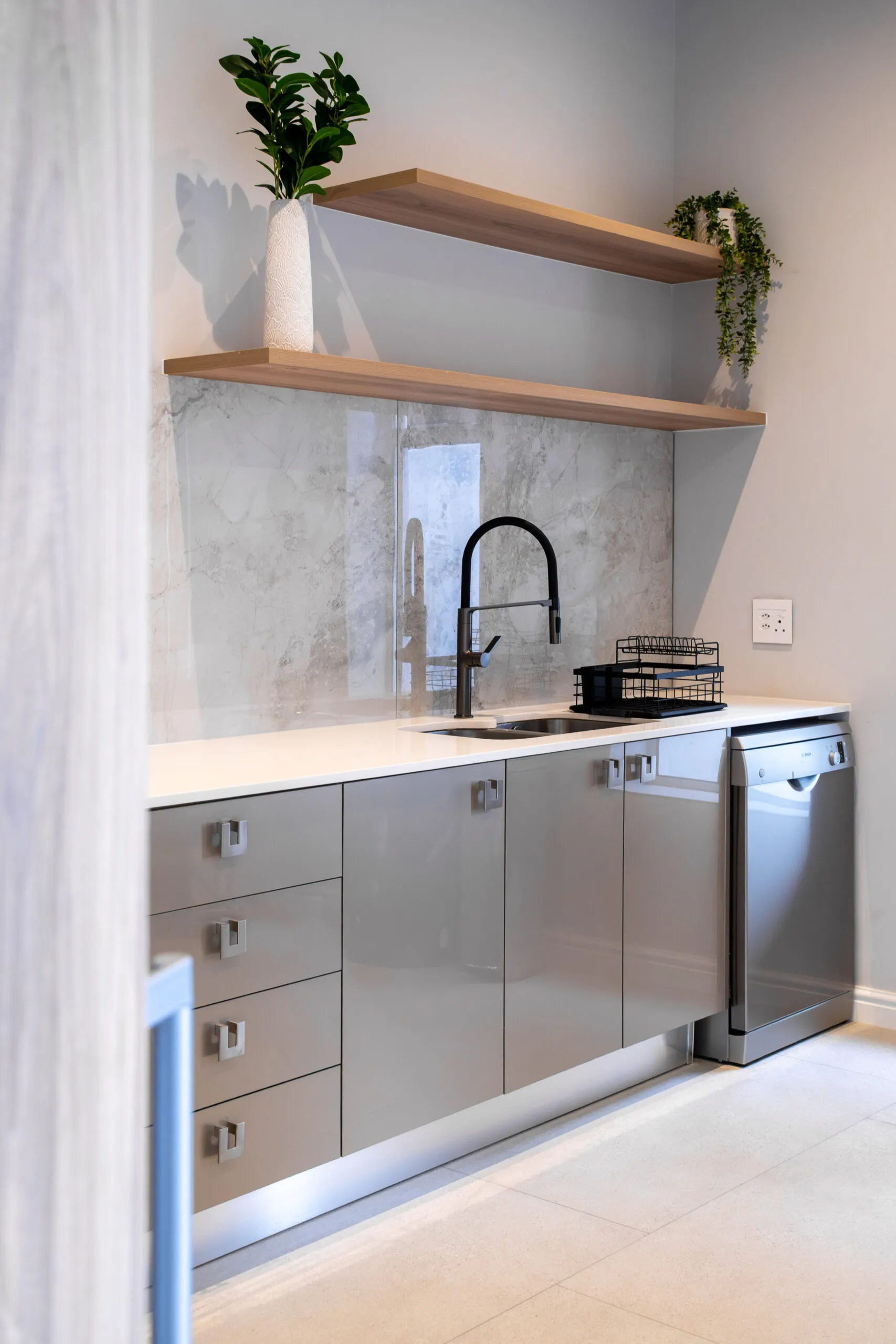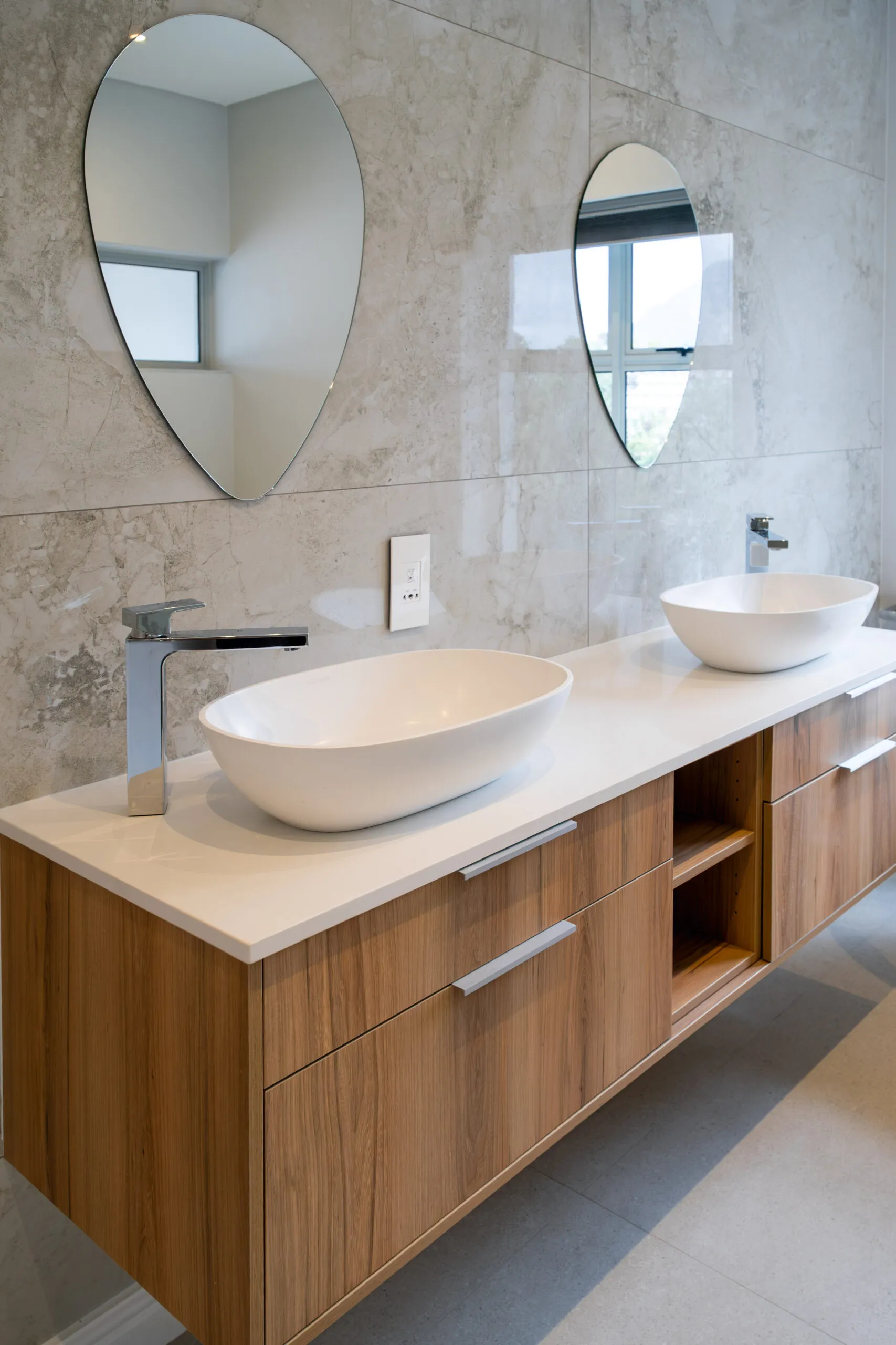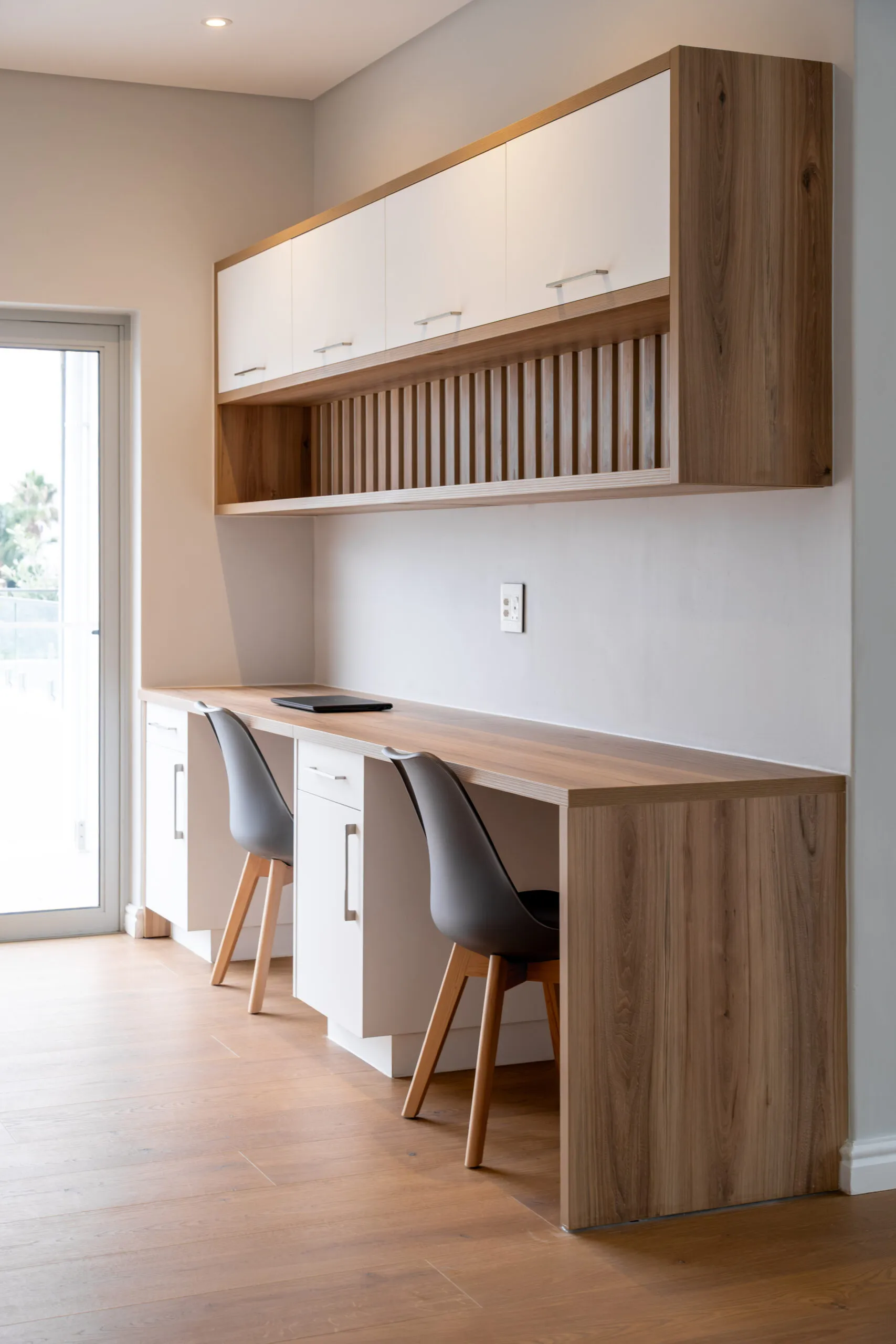 This modern kitchen blends clean lines with natural textures for a sleek, coastal feel. The curved island with timber slats and white countertop is a standout feature, paired with stylish barstools and pendant lighting. Large windows bring in natural light, while the black tap and extractor add a bold, contemporary touch.
