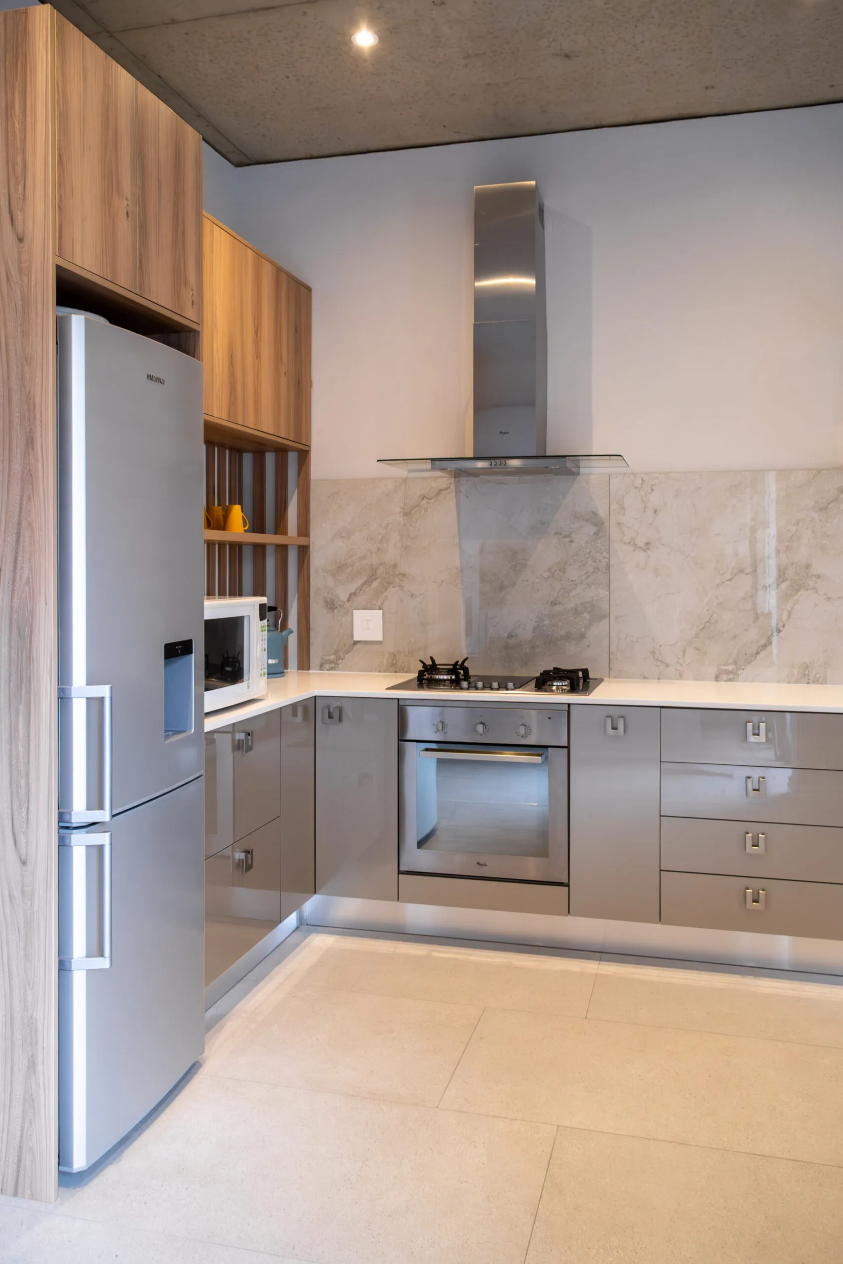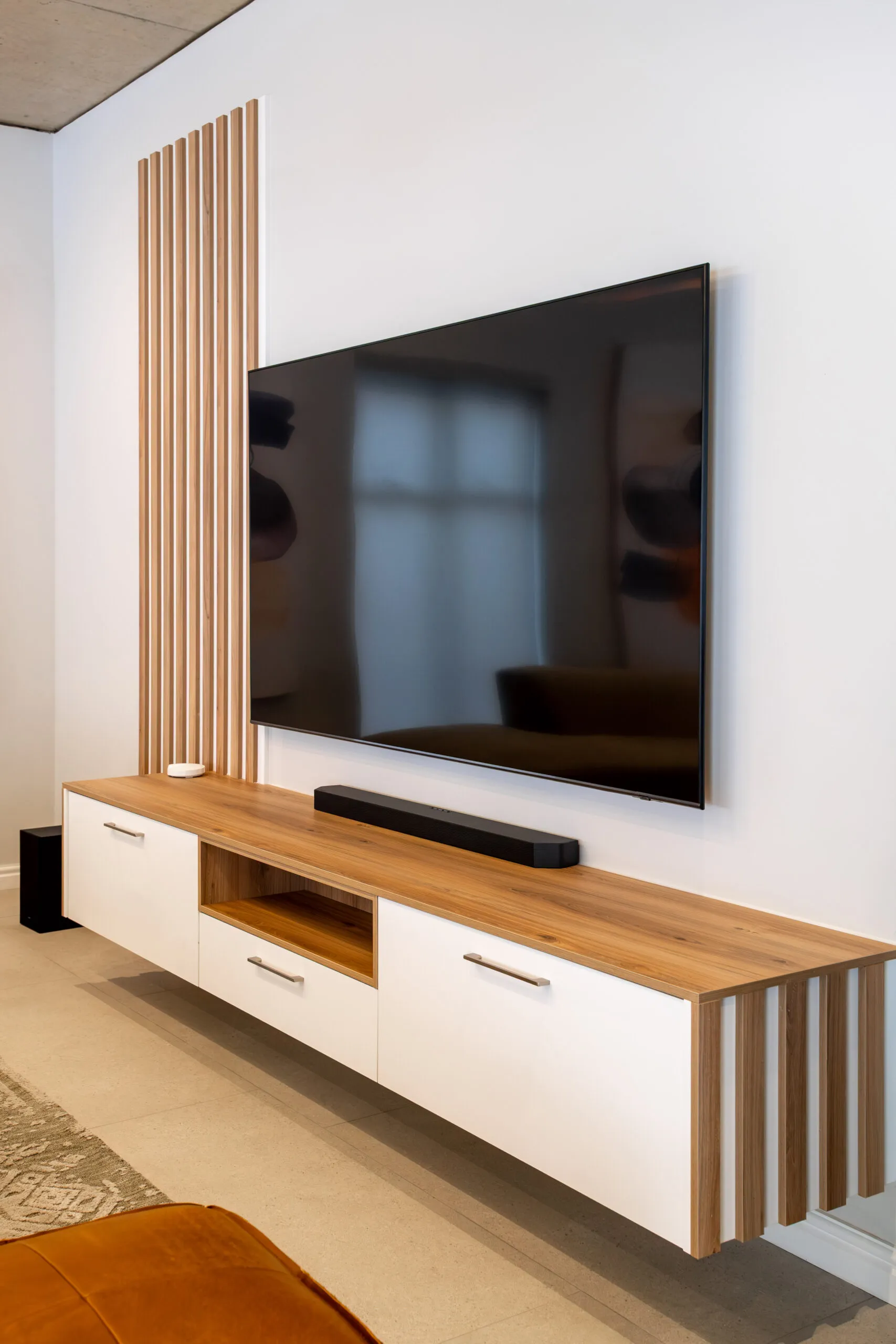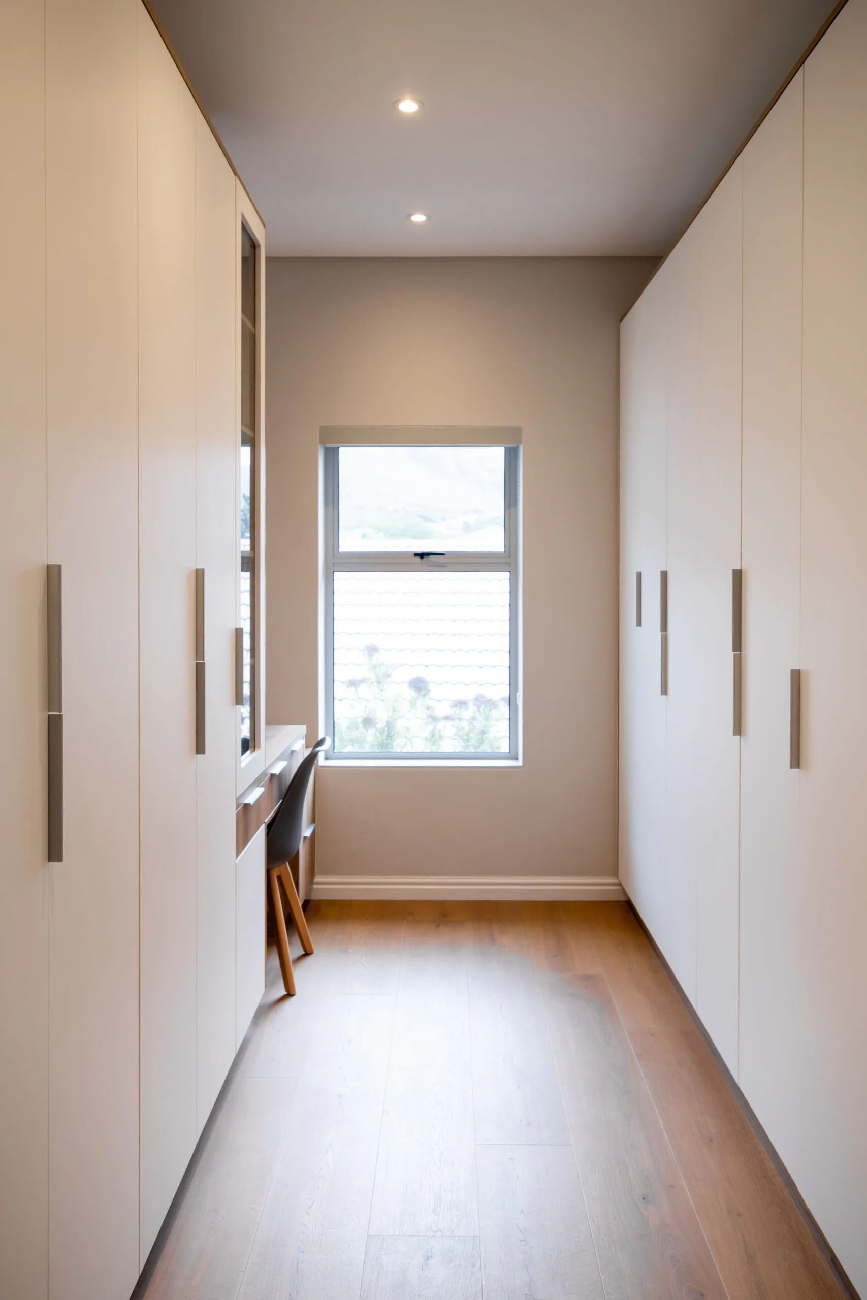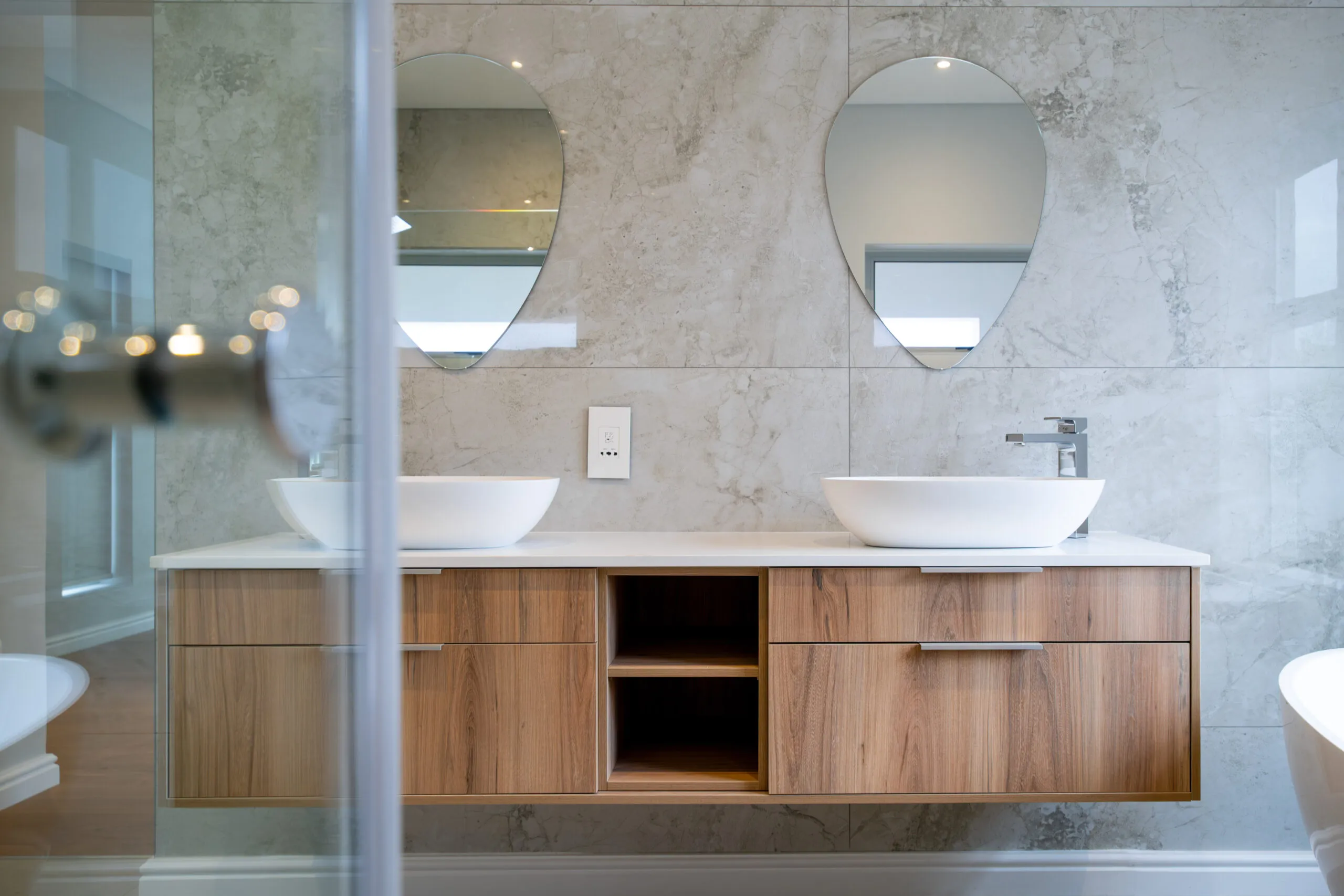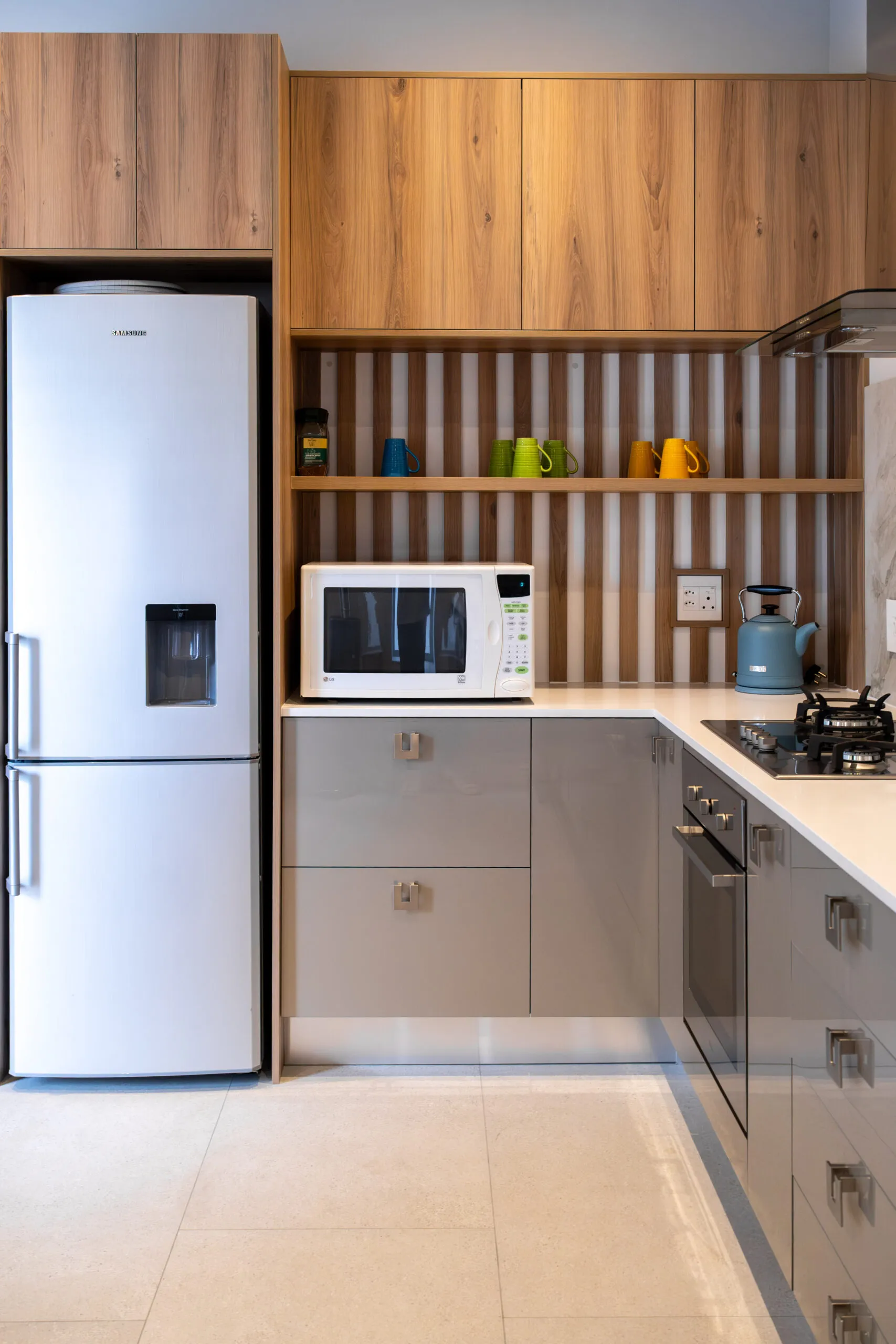 This modern kitchen blends clean lines with natural textures for a sleek, coastal feel. The curved island with timber slats and white countertop is a standout feature, paired with stylish barstools and pendant lighting. Large windows bring in natural light, while the black tap and extractor add a bold, contemporary touch.