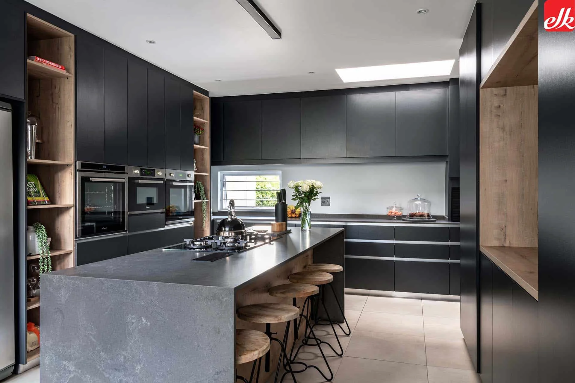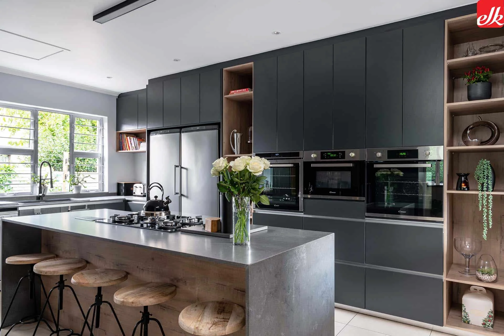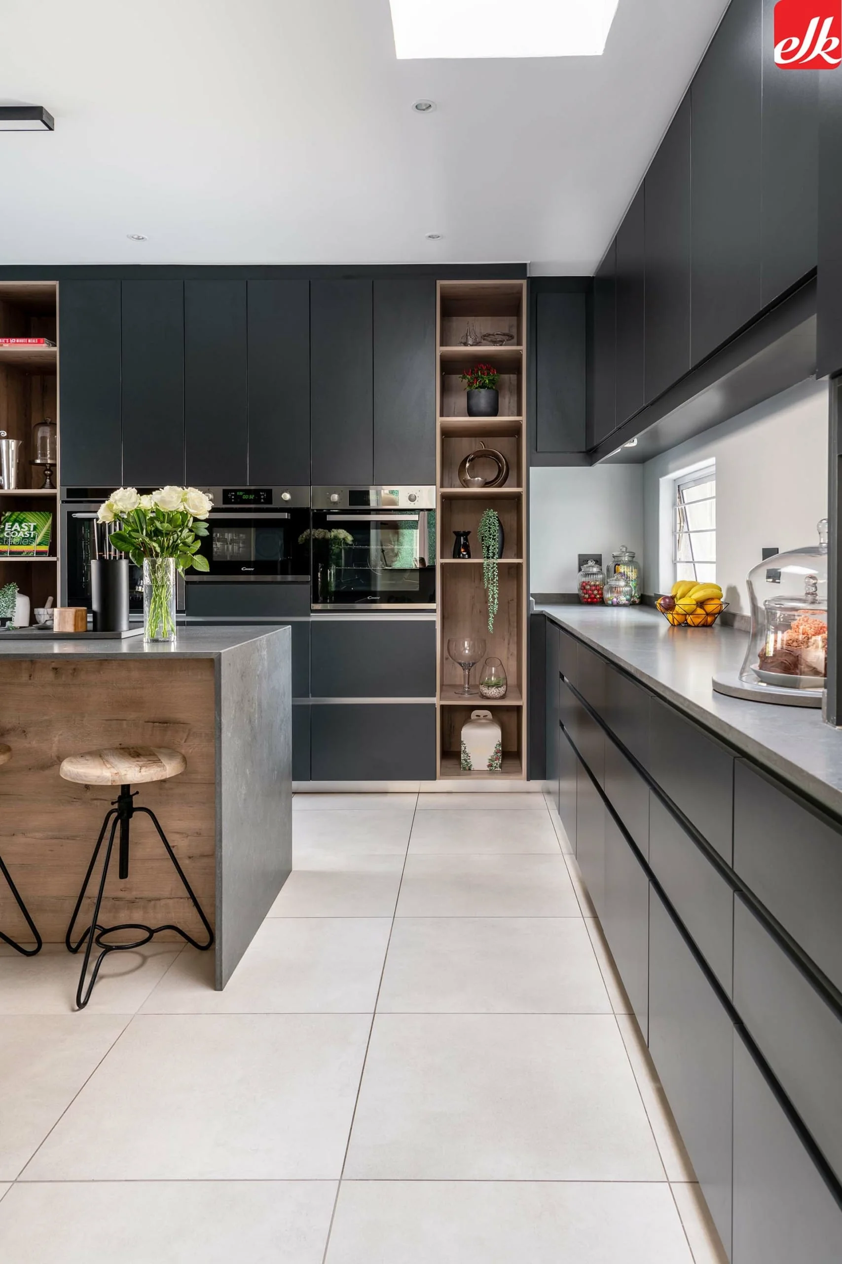 PG Bison Kalapana Peen and Brookhill Fusion give this kitchen a sleek look. Caesarstone tops bring out the Franke Fragranite onyx sink and matching mixer, while Gola systems continue to add to the sleek appeal.