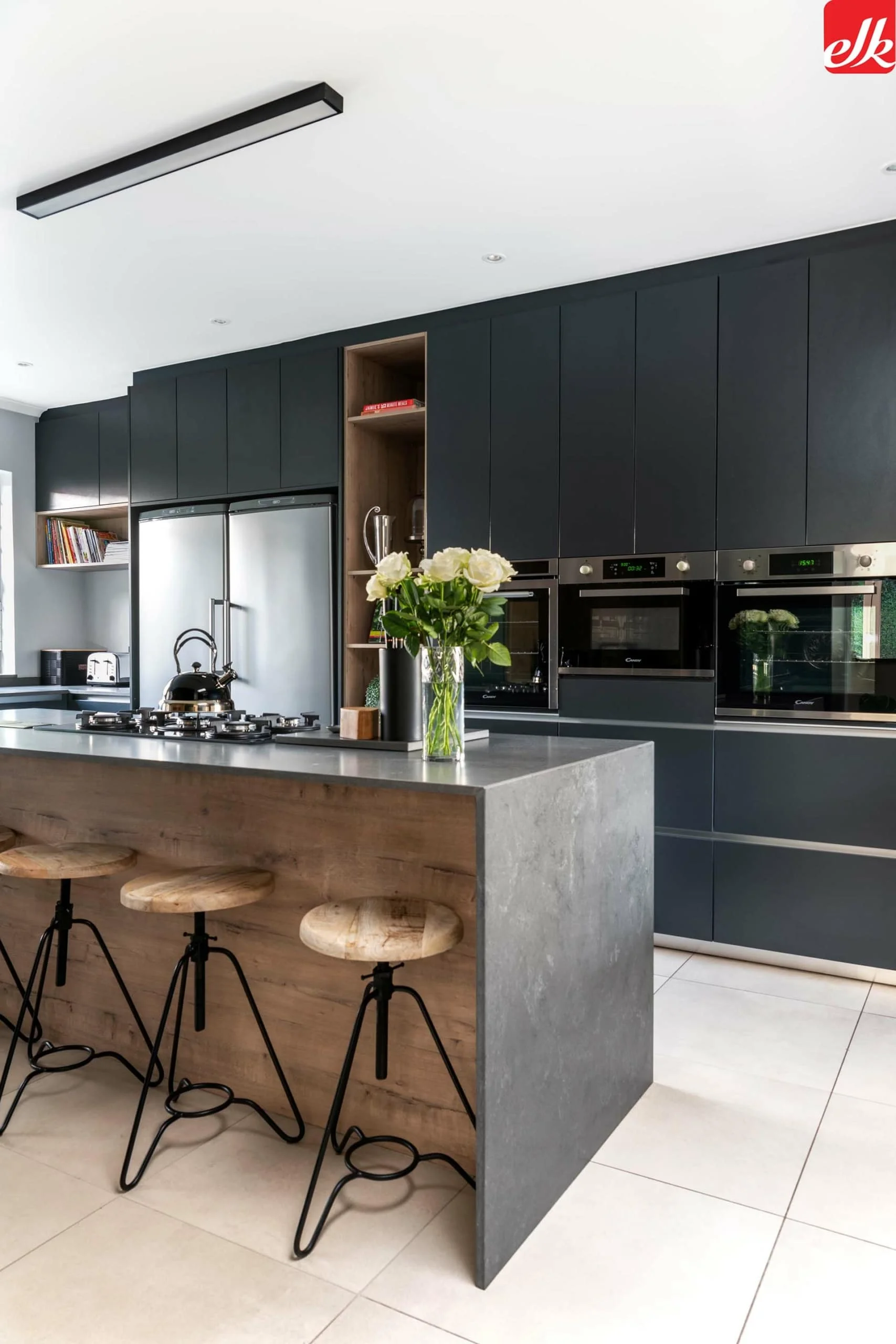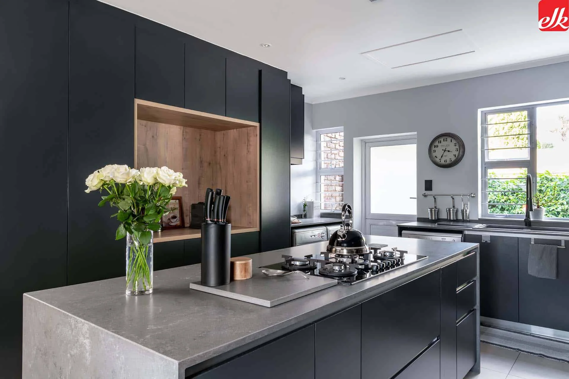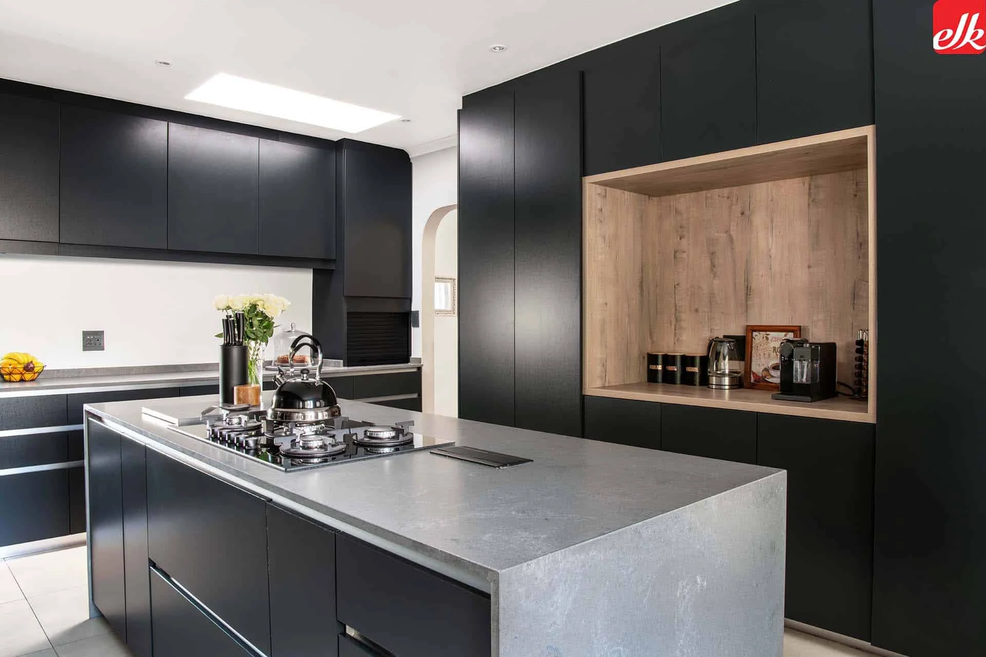 PG Bison Kalapana Peen and Brookhill Fusion give this kitchen a sleek look. Caesarstone tops bring out the Franke Fragranite onyx sink and matching mixer, while Gola systems continue to add to the sleek appeal.