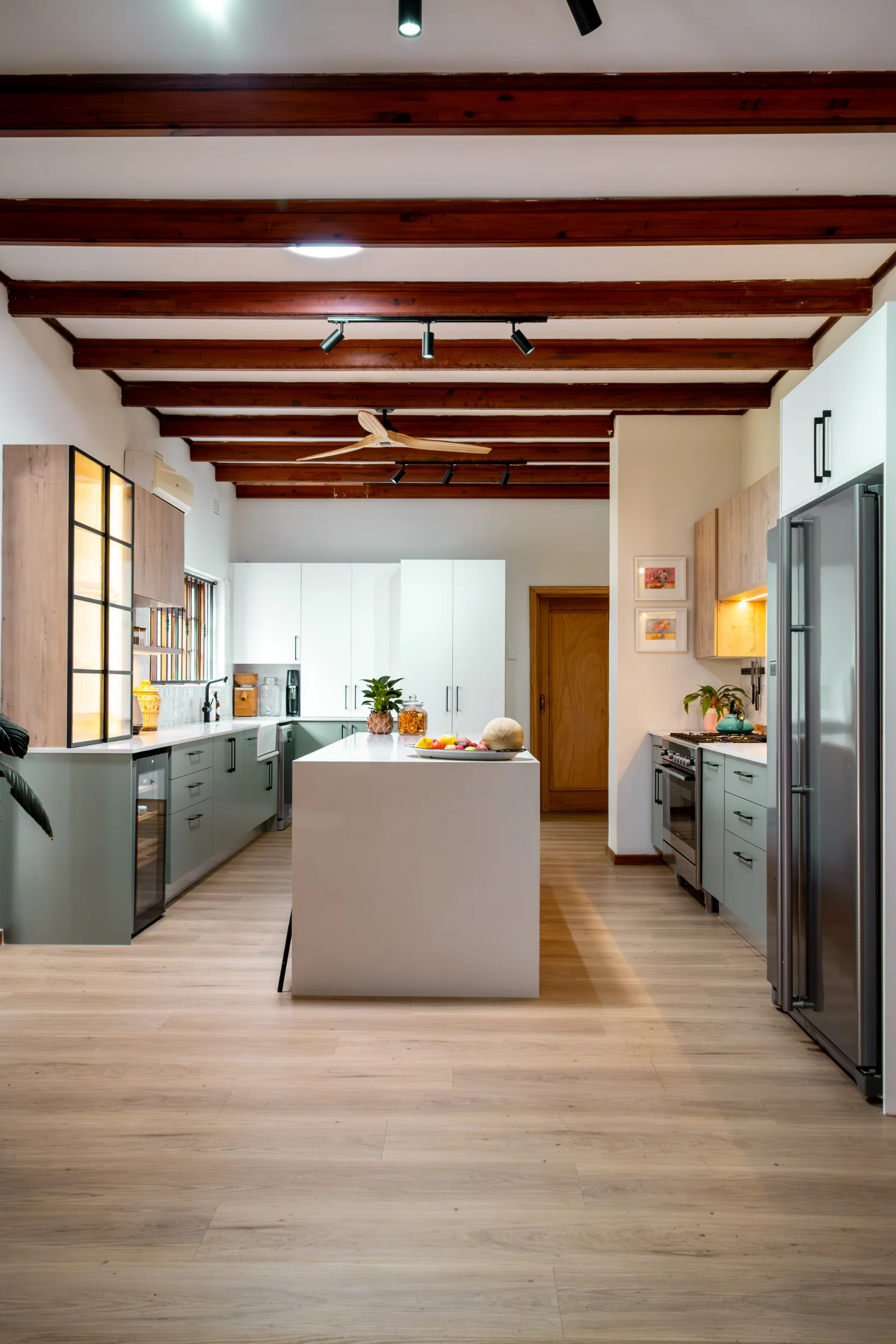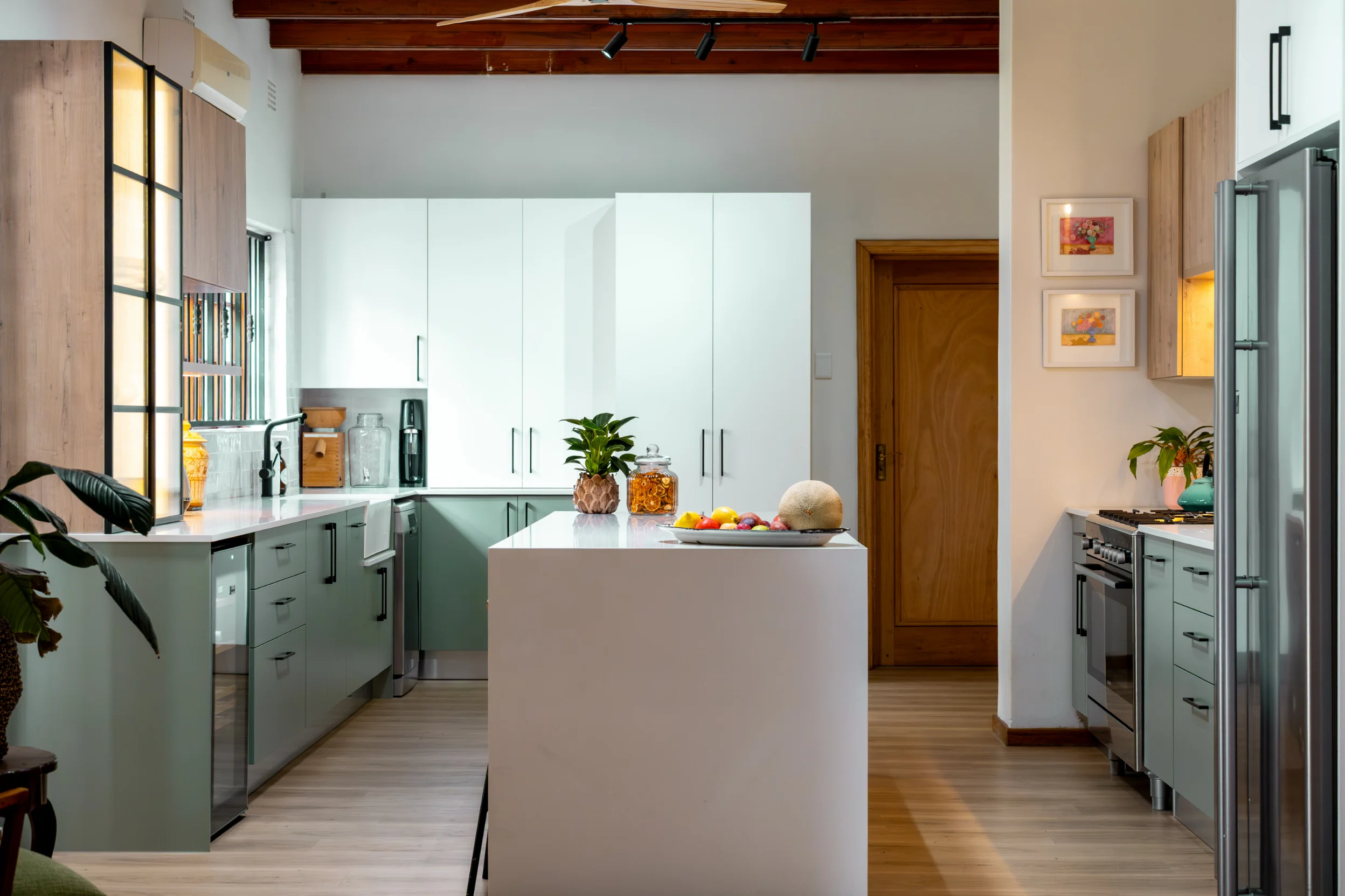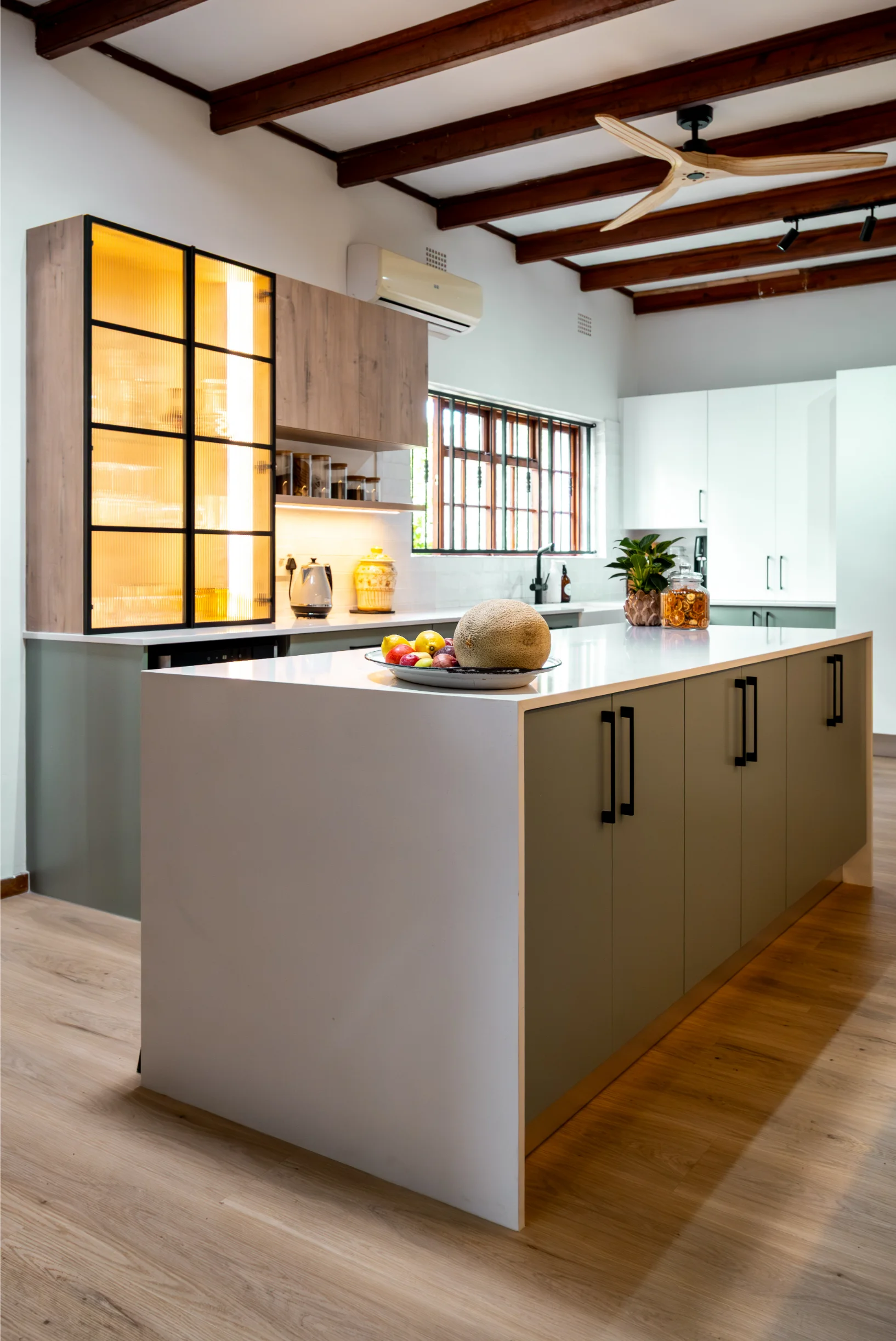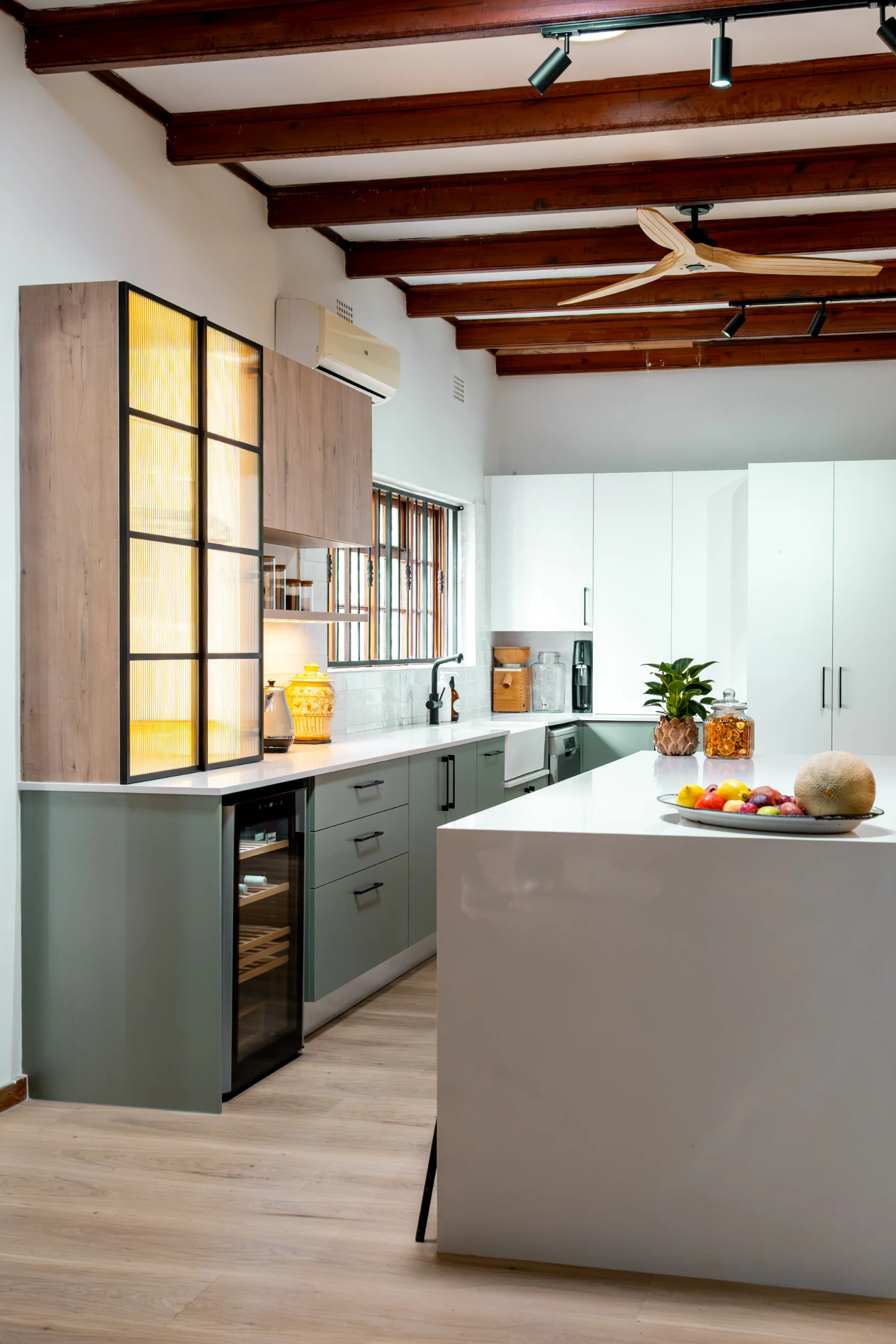 Industrial-inspired touches, like the black-framed glass display and bold hardware, add a modern edge, beautifully contrasted by the natural textures of the exposed wooden ceiling beams and statement fan. Pops of colour from décor and fresh produce infuse energy into the space, making it as inspiring as it is practical. Designed in collaboration with Easylife Kitchens, this kitchen is the perfect blend of Funky Ouma’s signature flair and exceptional craftsmanship.