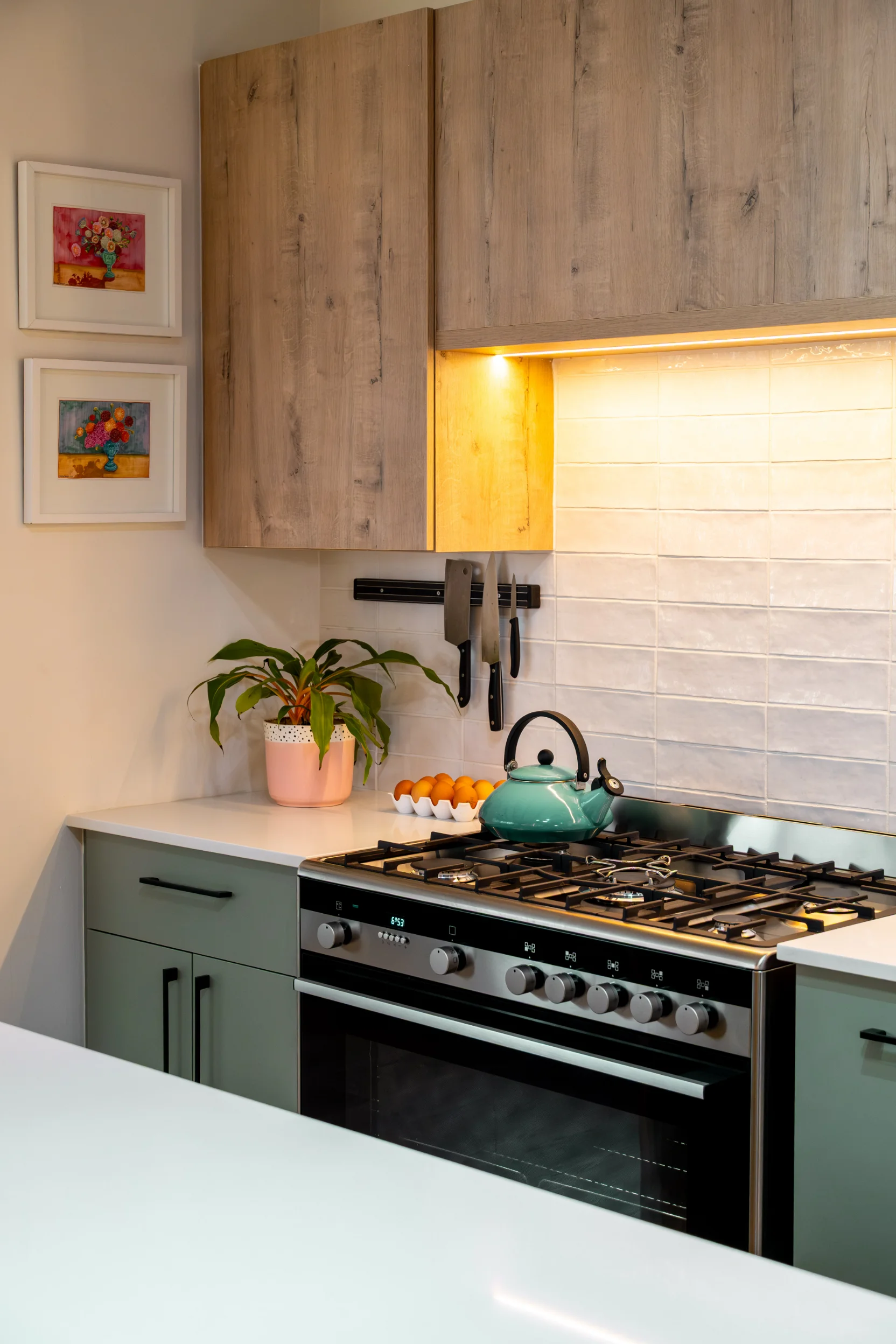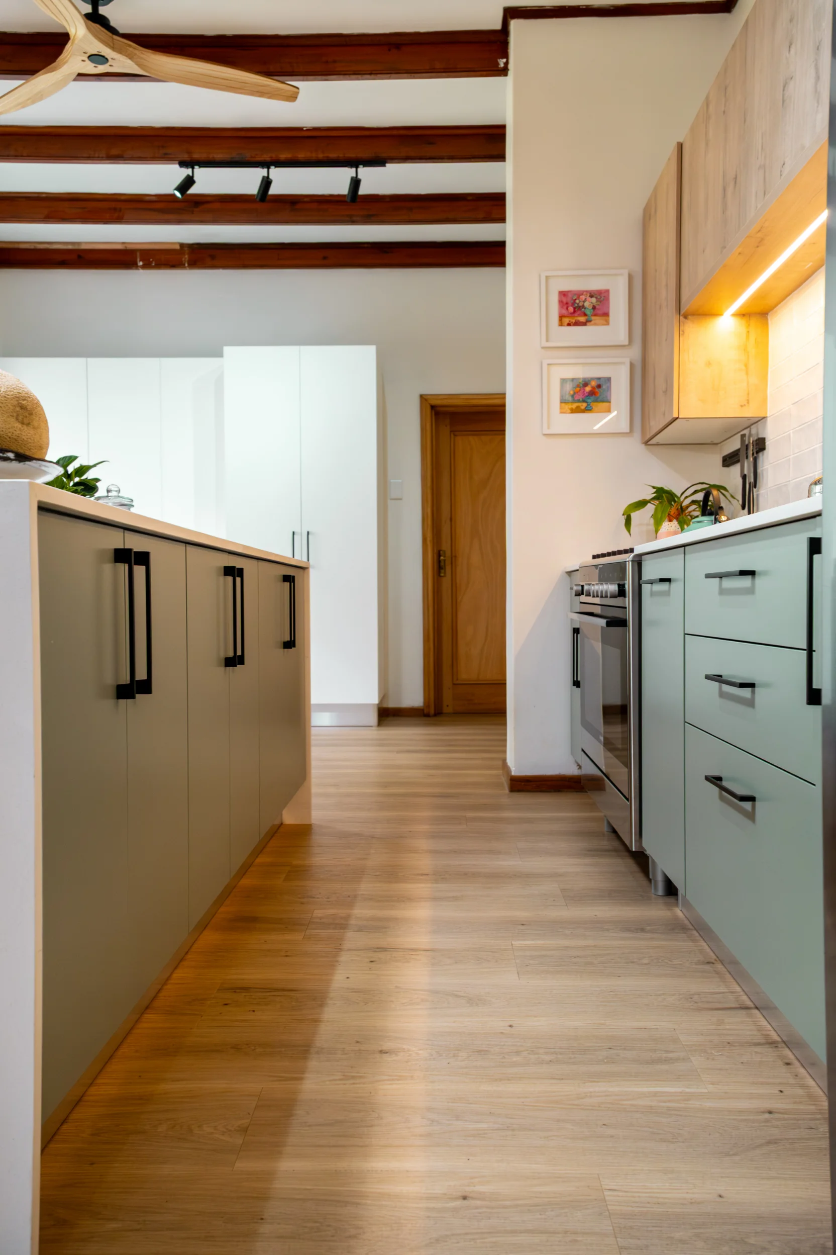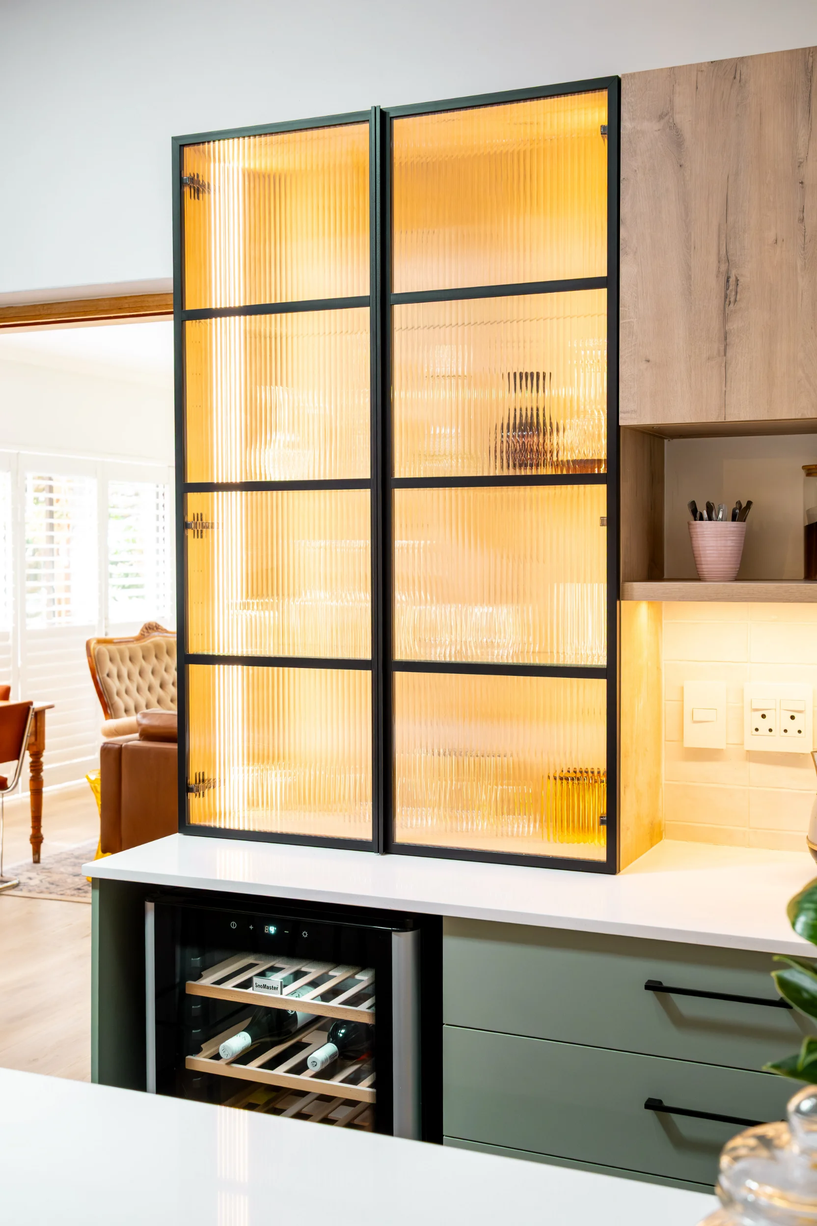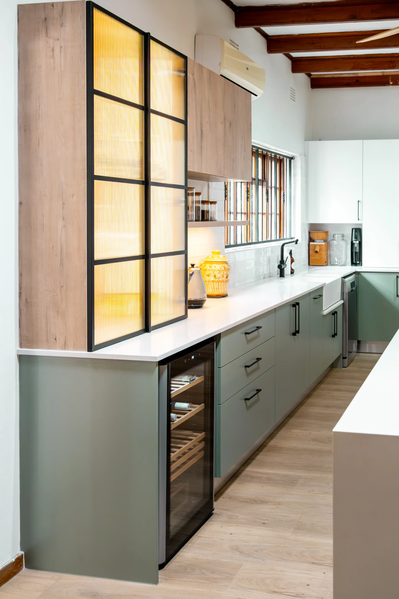 Industrial-inspired touches, like the black-framed glass display and bold hardware, add a modern edge, beautifully contrasted by the natural textures of the exposed wooden ceiling beams and statement fan. Pops of colour from décor and fresh produce infuse energy into the space, making it as inspiring as it is practical. Designed in collaboration with Easylife Kitchens, this kitchen is the perfect blend of Funky Ouma’s signature flair and exceptional craftsmanship.