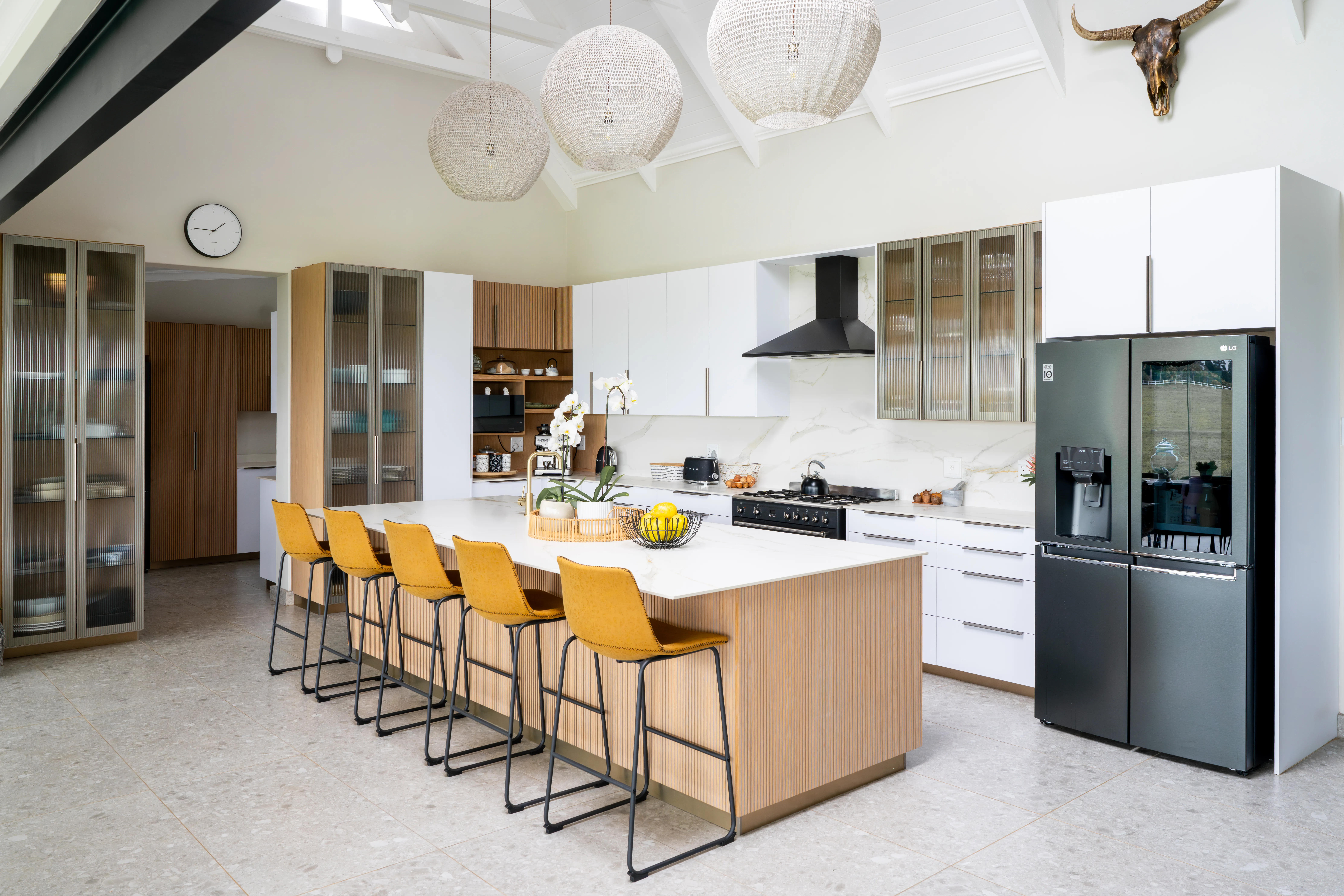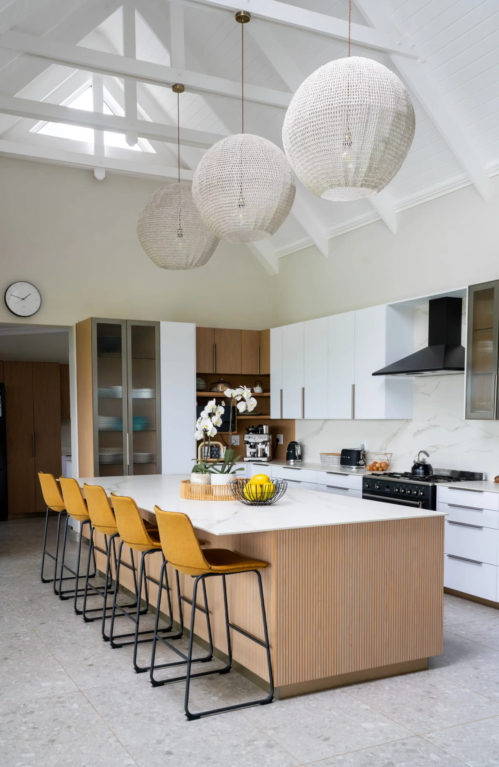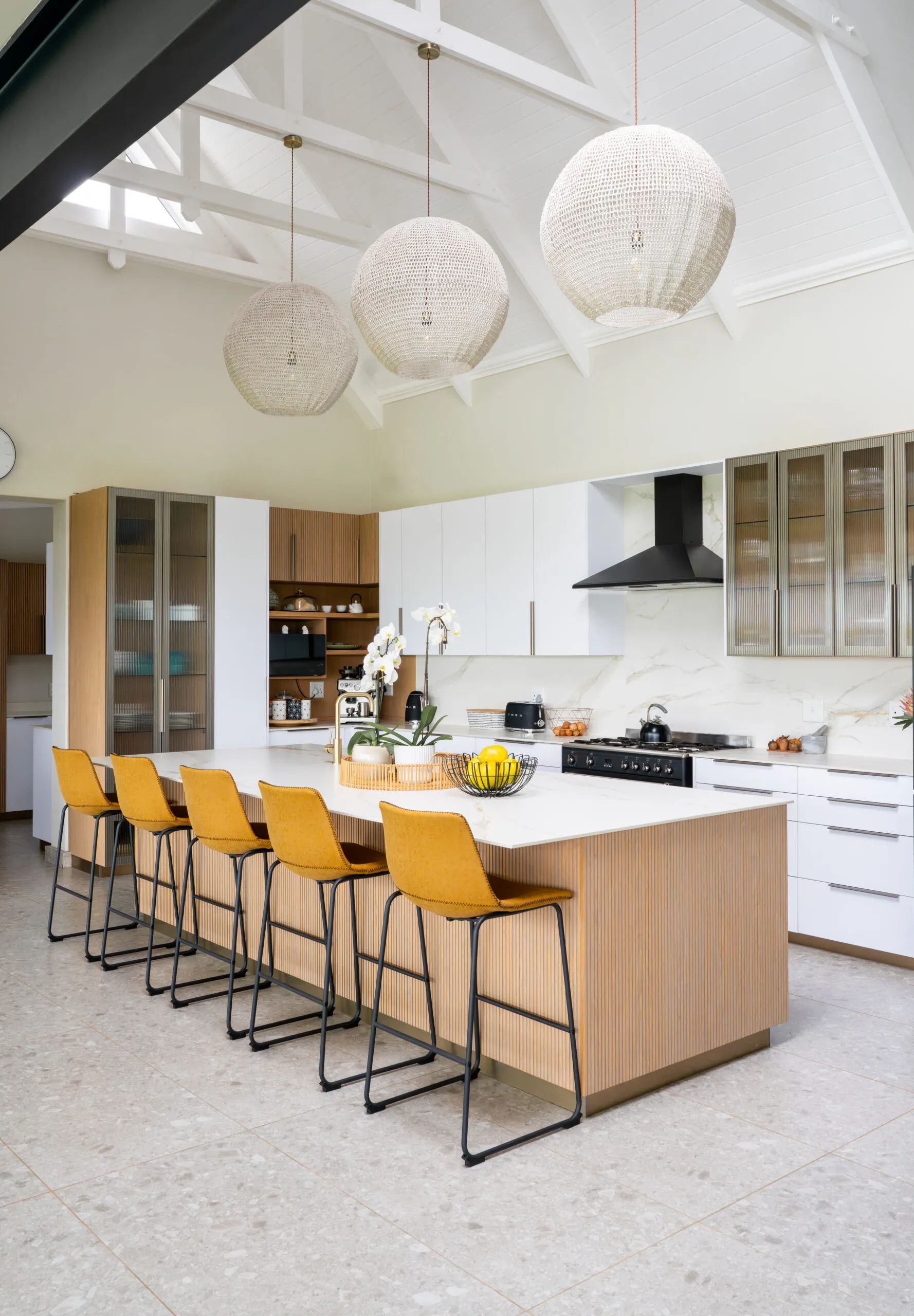 This kitchen design is a perfect blend of natural textures and modern functionality. Featuring clean white cabinetry paired with fluted wood finishes, this space is accented by bold mustard bar stools for a pop of warmth and personality. Glass display cabinets add a touch of elegance, while oversized woven pendant lights create a soft, inviting atmosphere. With ample workspace and open flow, this kitchen is designed for both entertaining and everyday living, exuding style and comfort in equal measure.