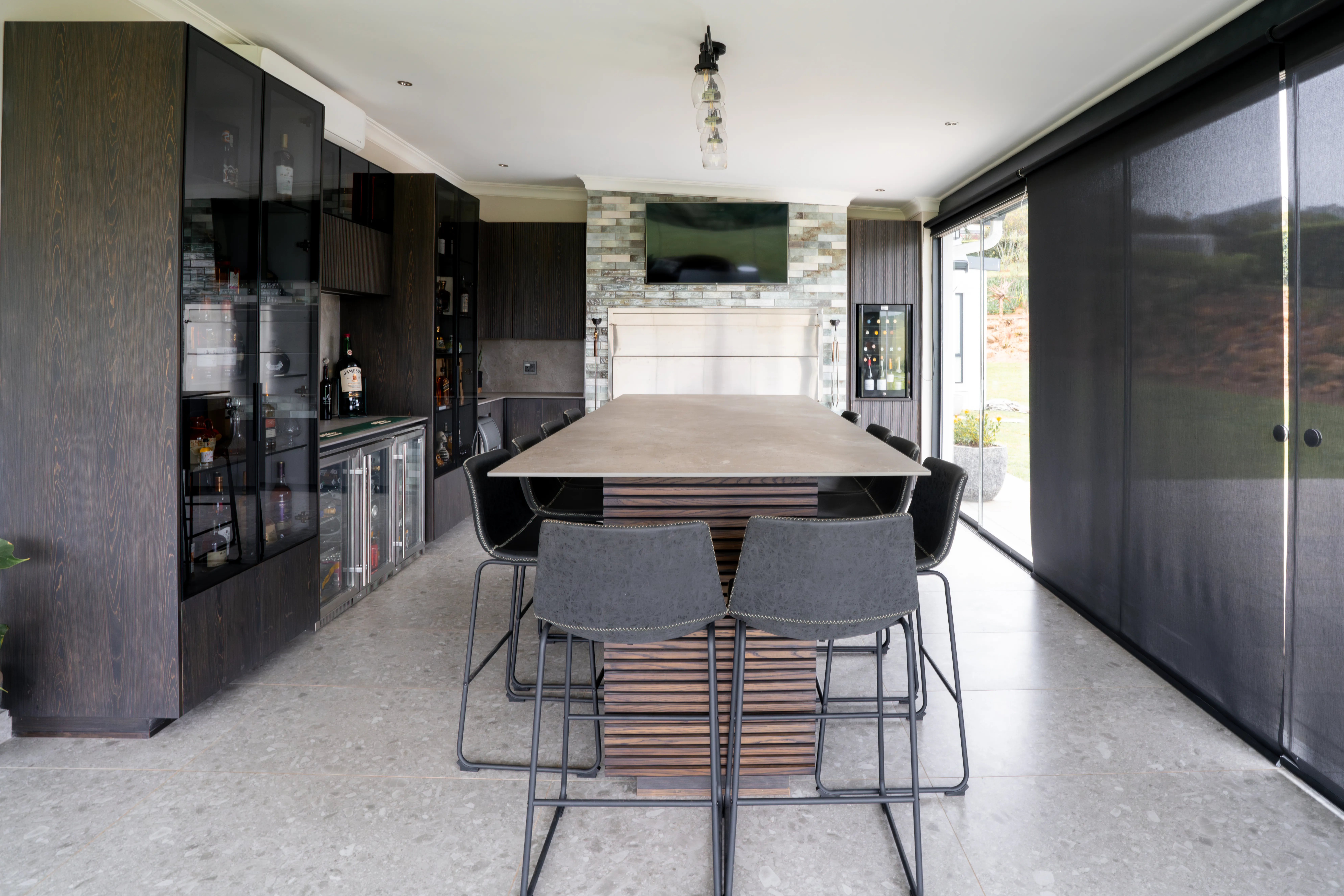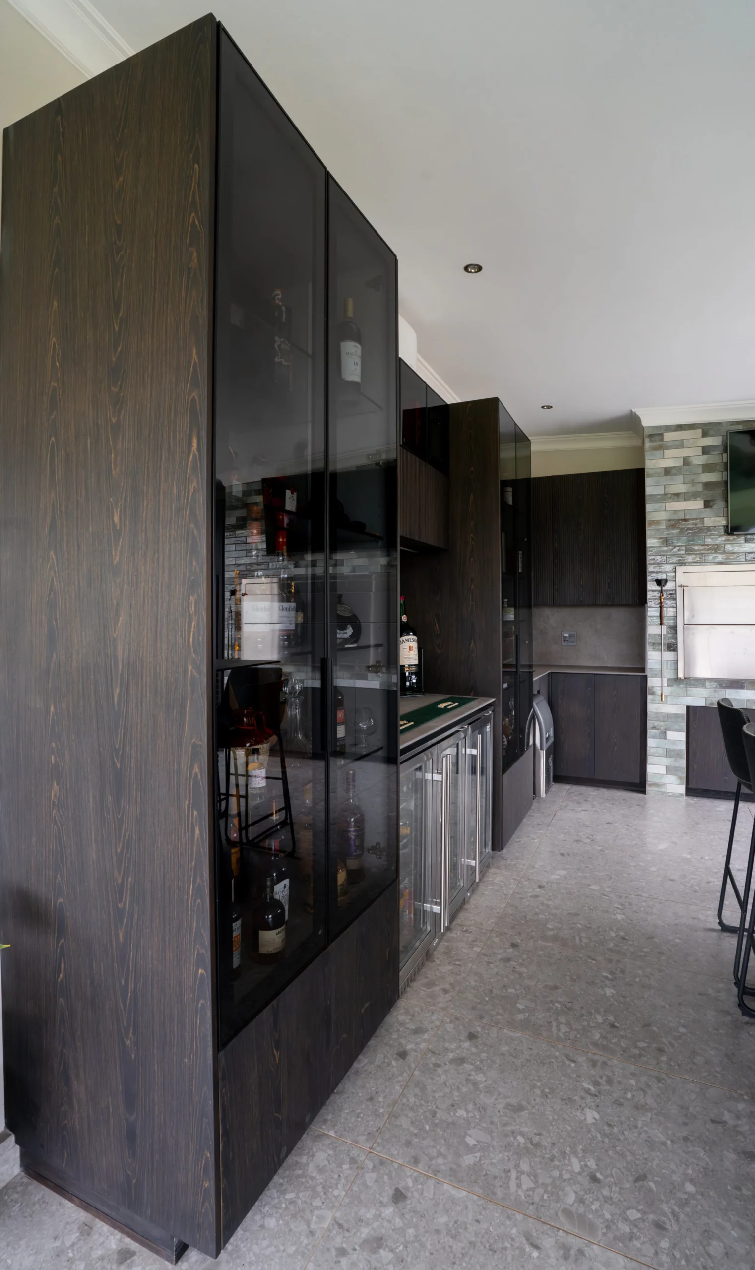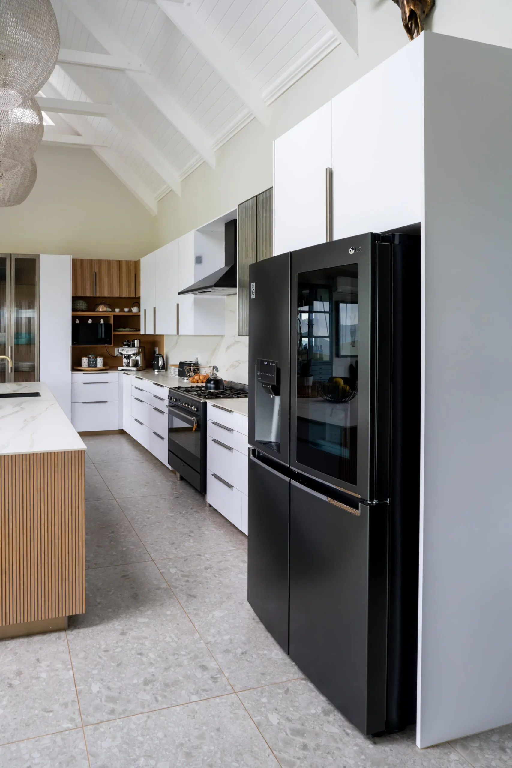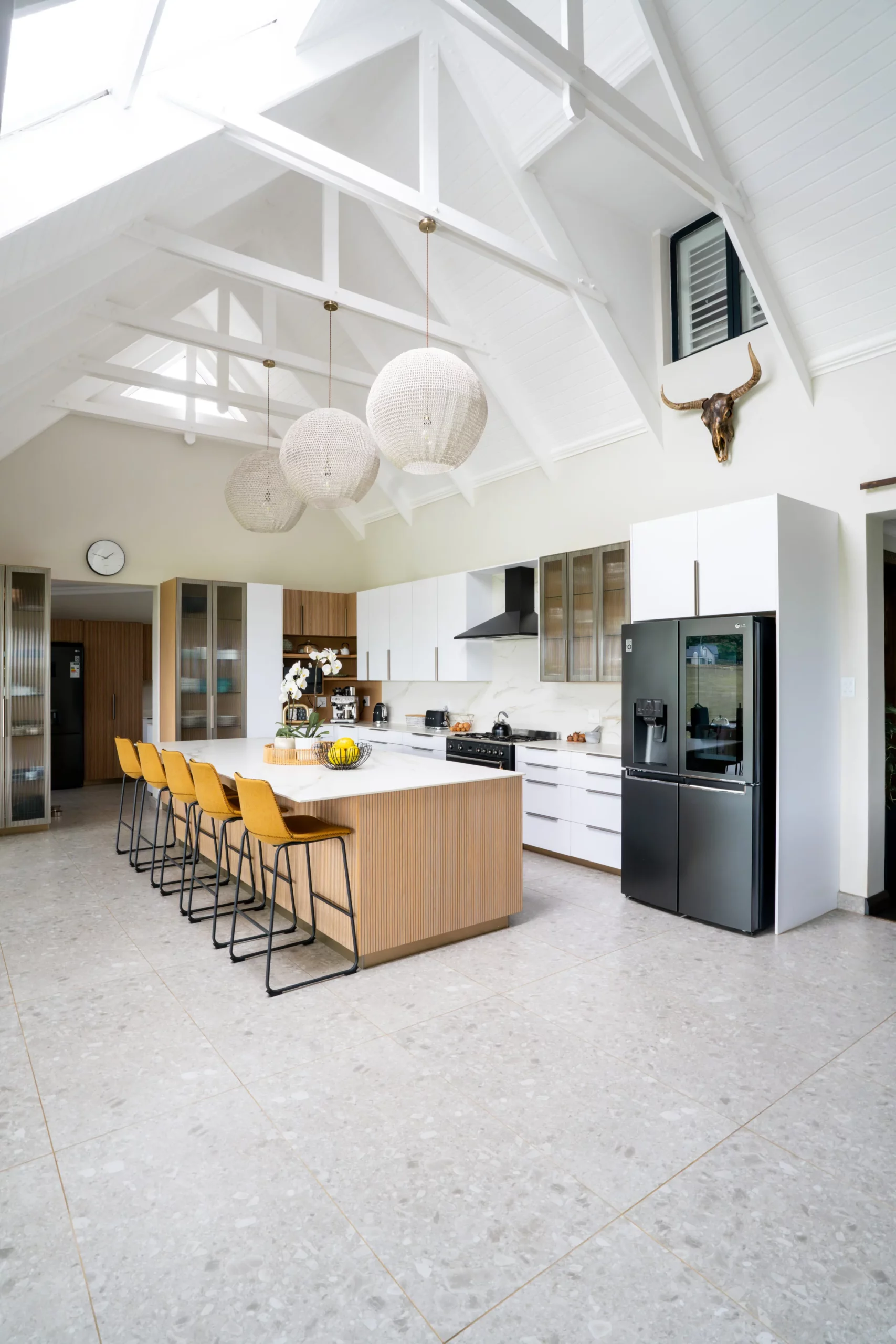 This kitchen design is a perfect blend of natural textures and modern functionality. Featuring clean white cabinetry paired with fluted wood finishes, this space is accented by bold mustard bar stools for a pop of warmth and personality. Glass display cabinets add a touch of elegance, while oversized woven pendant lights create a soft, inviting atmosphere. With ample workspace and open flow, this kitchen is designed for both entertaining and everyday living, exuding style and comfort in equal measure.