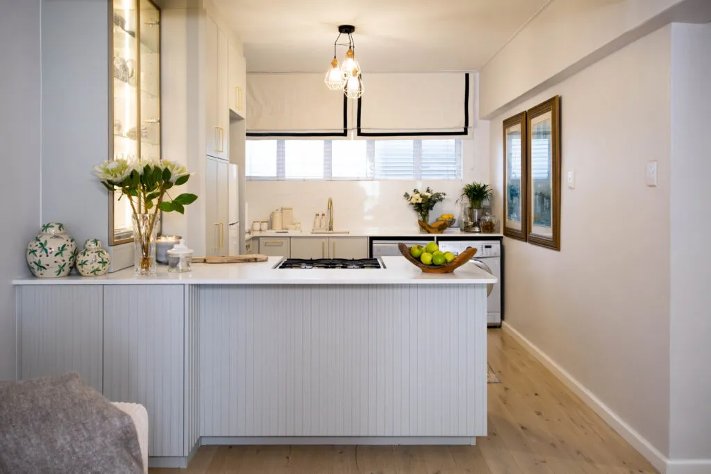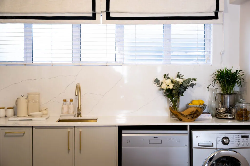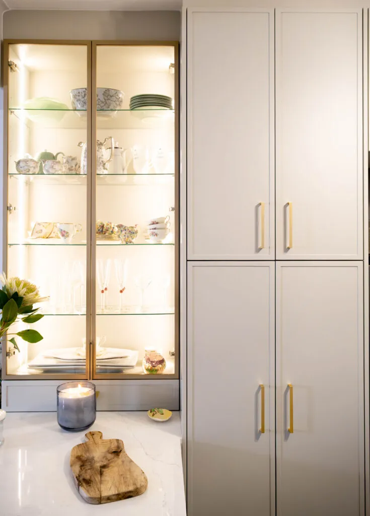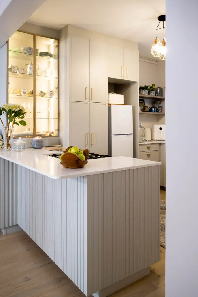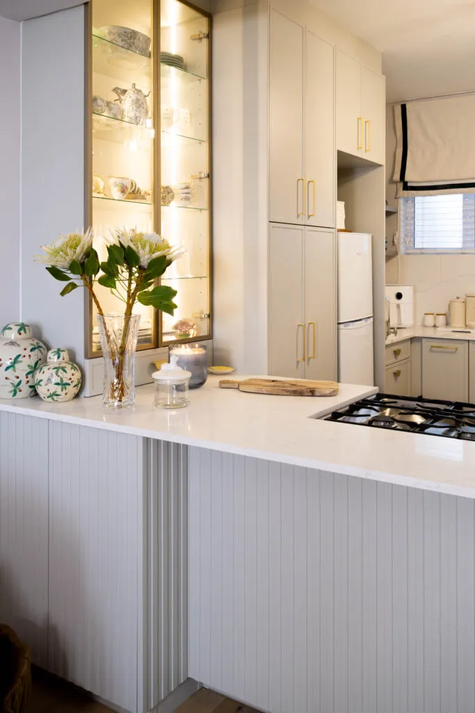 This is Marc Buckner’s kitchen – a refined and elegant space that perfectly balances contemporary design with timeless charm. Soft, neutral cabinetry paired with gold hardware creates a sophisticated yet inviting atmosphere, while the vertical panelling on the island adds subtle texture and visual interest. The white countertops and splashback enhance the sense of light and openness, making the space feel airy and uncluttered.