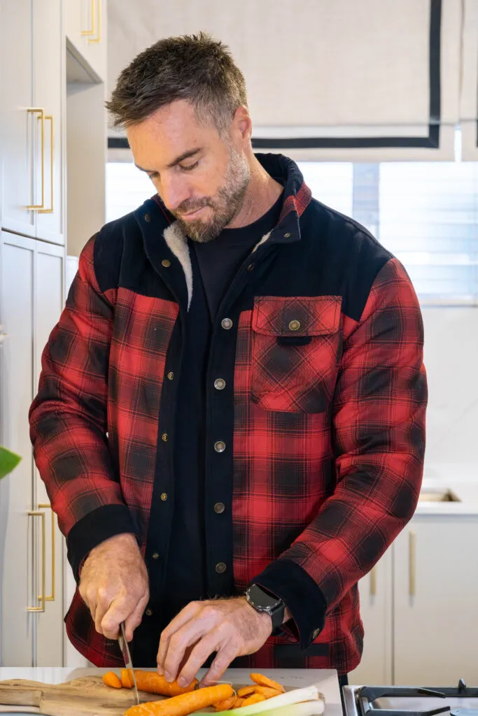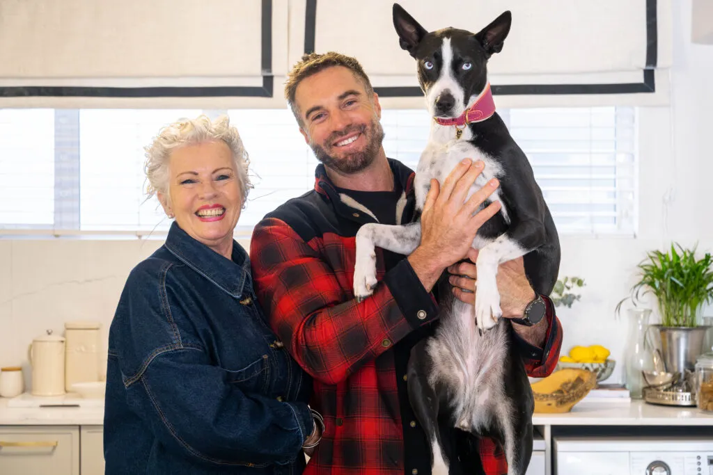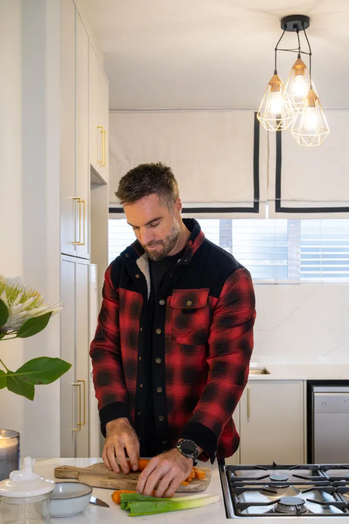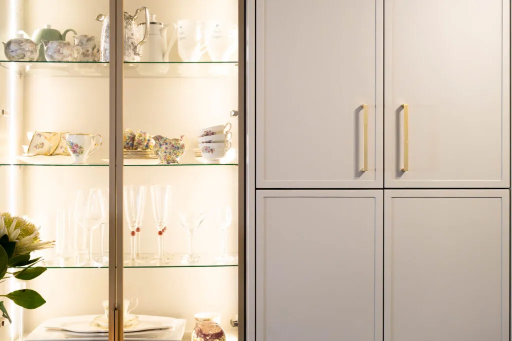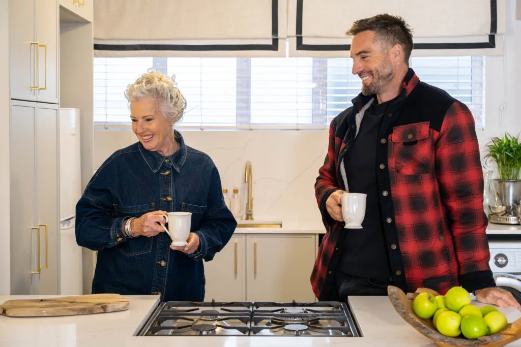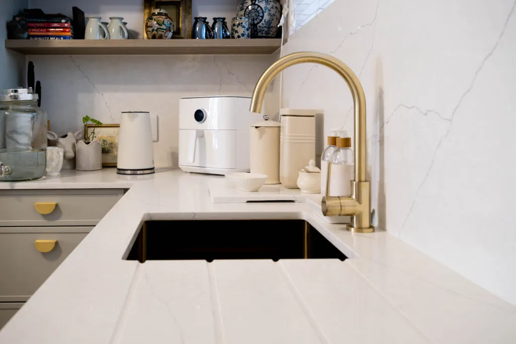 This is Marc Buckner’s kitchen – a refined and elegant space that perfectly balances contemporary design with timeless charm. Soft, neutral cabinetry paired with gold hardware creates a sophisticated yet inviting atmosphere, while the vertical panelling on the island adds subtle texture and visual interest. The white countertops and splashback enhance the sense of light and openness, making the space feel airy and uncluttered.
