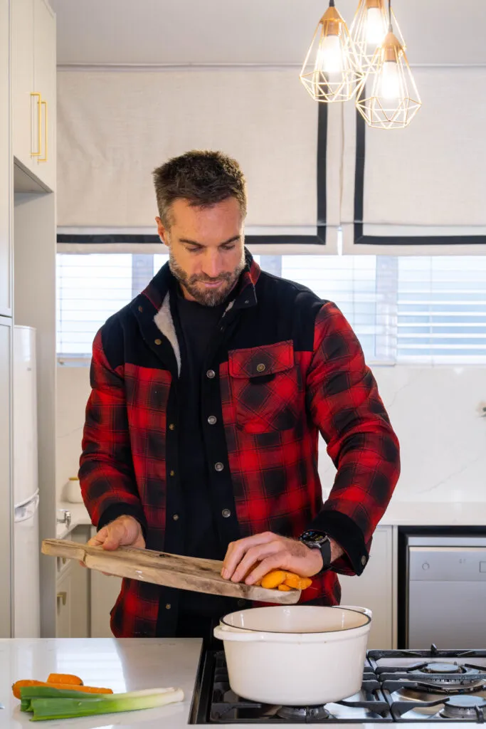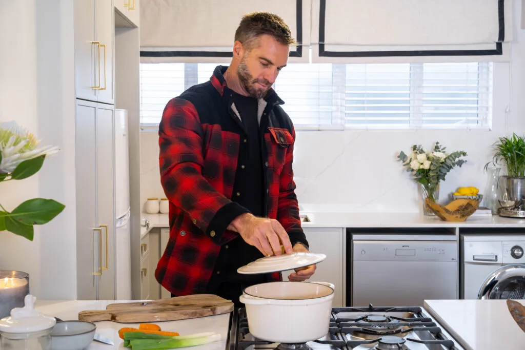 Thoughtfully styled with fresh flowers, natural wood accents, and decorative ceramics, the kitchen reflects Marc’s eye for detail and love for curated living. The central island, equipped with a built-in hob, offers a practical workspace that also serves as a focal point for cooking and socialising. Designed in collaboration with Easylife Kitchens, this kitchen embodies understated luxury, functionality, and personalised style.