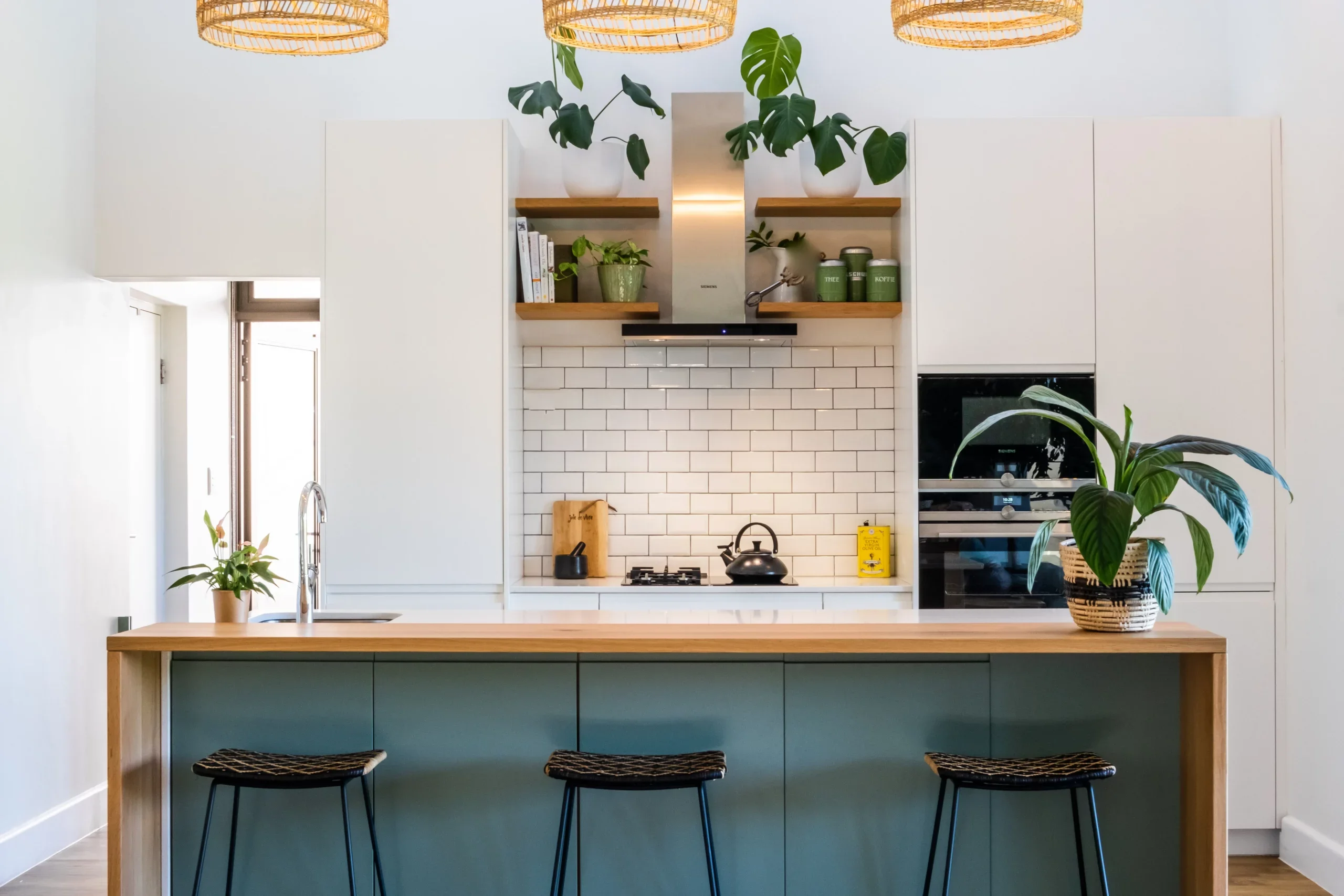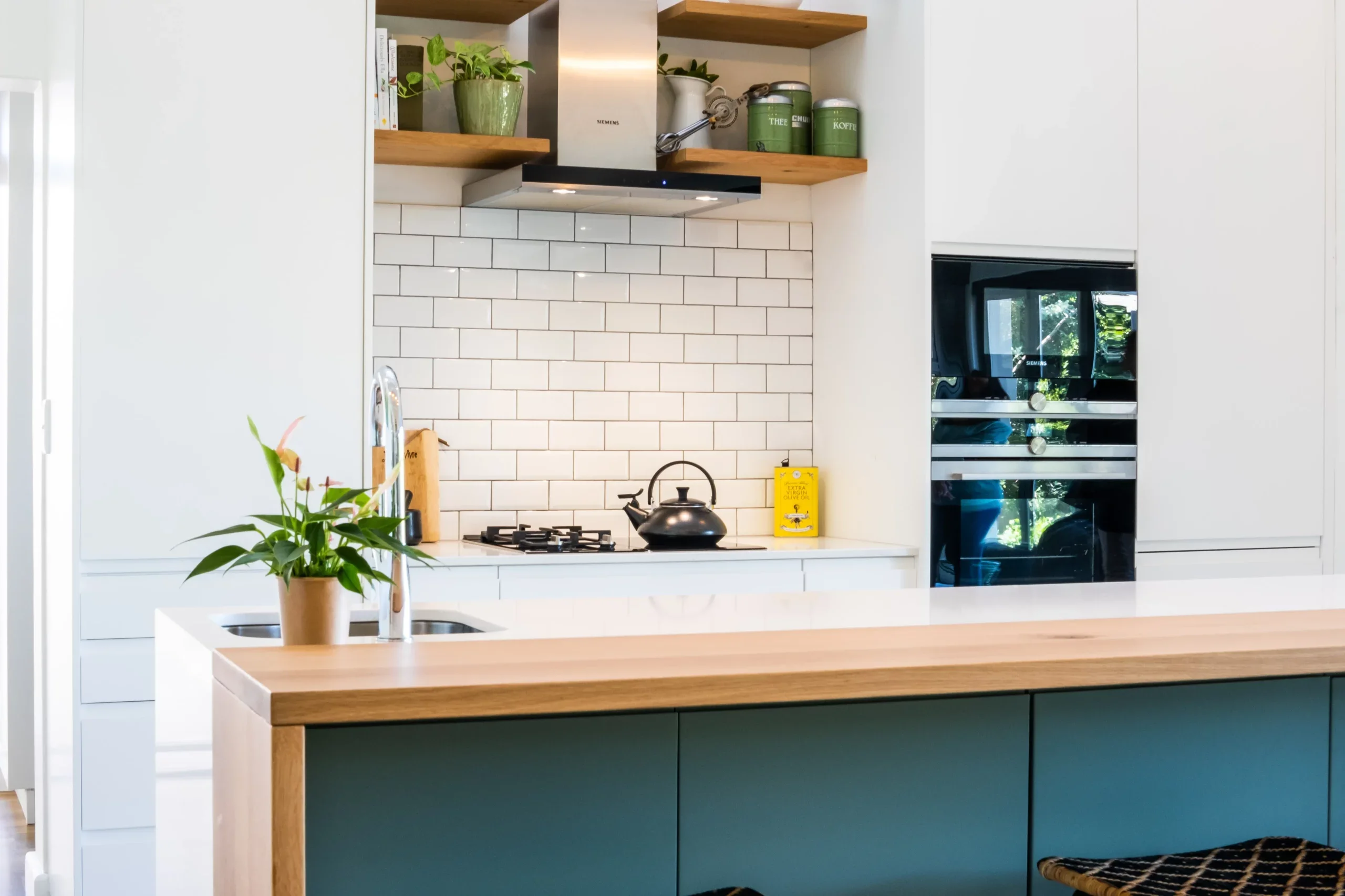This kitchen boasts a modern design that incorporates clean lines and sleek hidden appliances. This open-plan area creates a warm, welcoming space for the family. The materials used include White Duco, reverse finger grip doors; solid White Oak wrap-around nook, floating shelves, and Blum Intivo soft-close drawer runners. The earthy wooden elements and white tones create a calmness, making working in this kitchen an absolute dream.