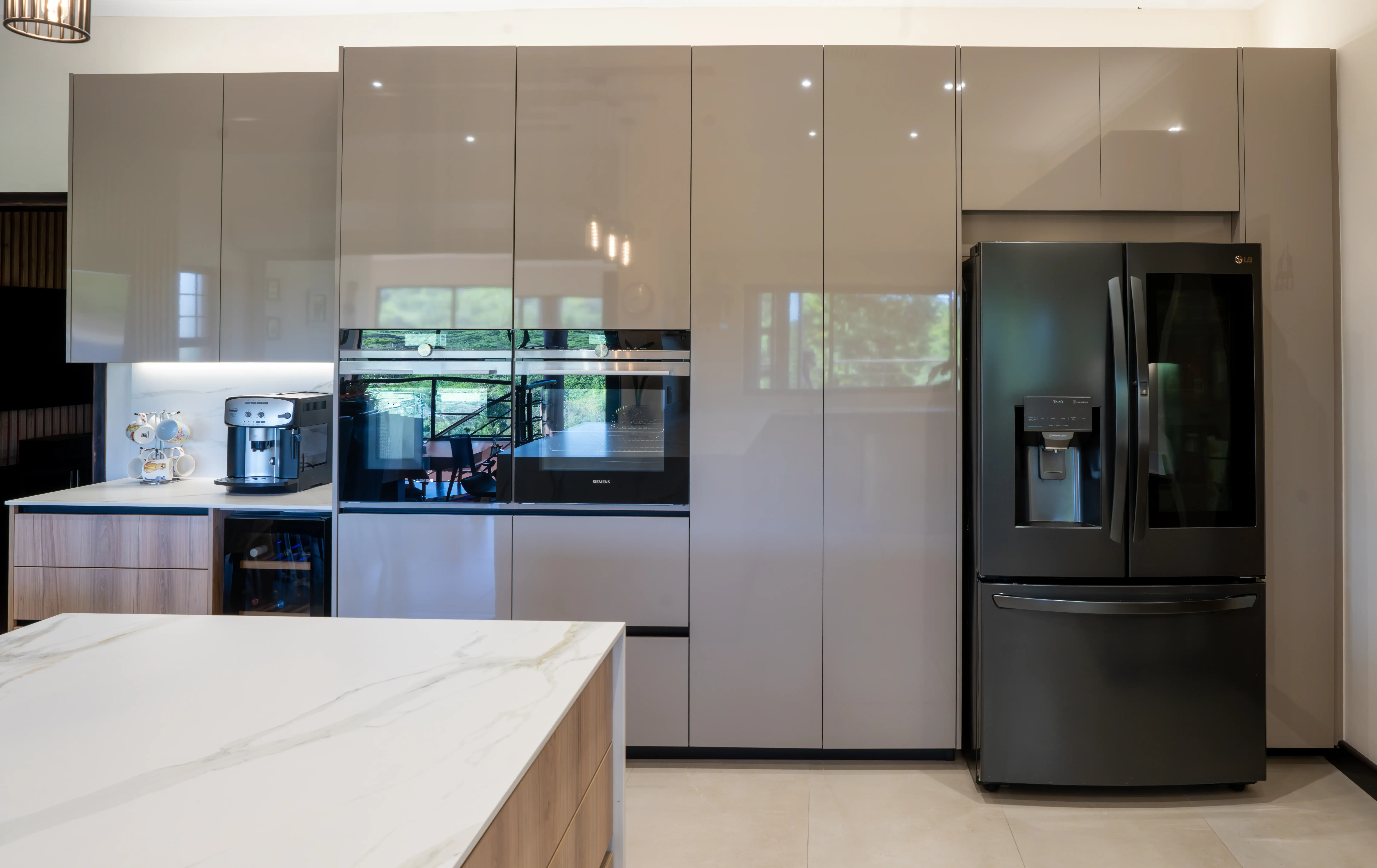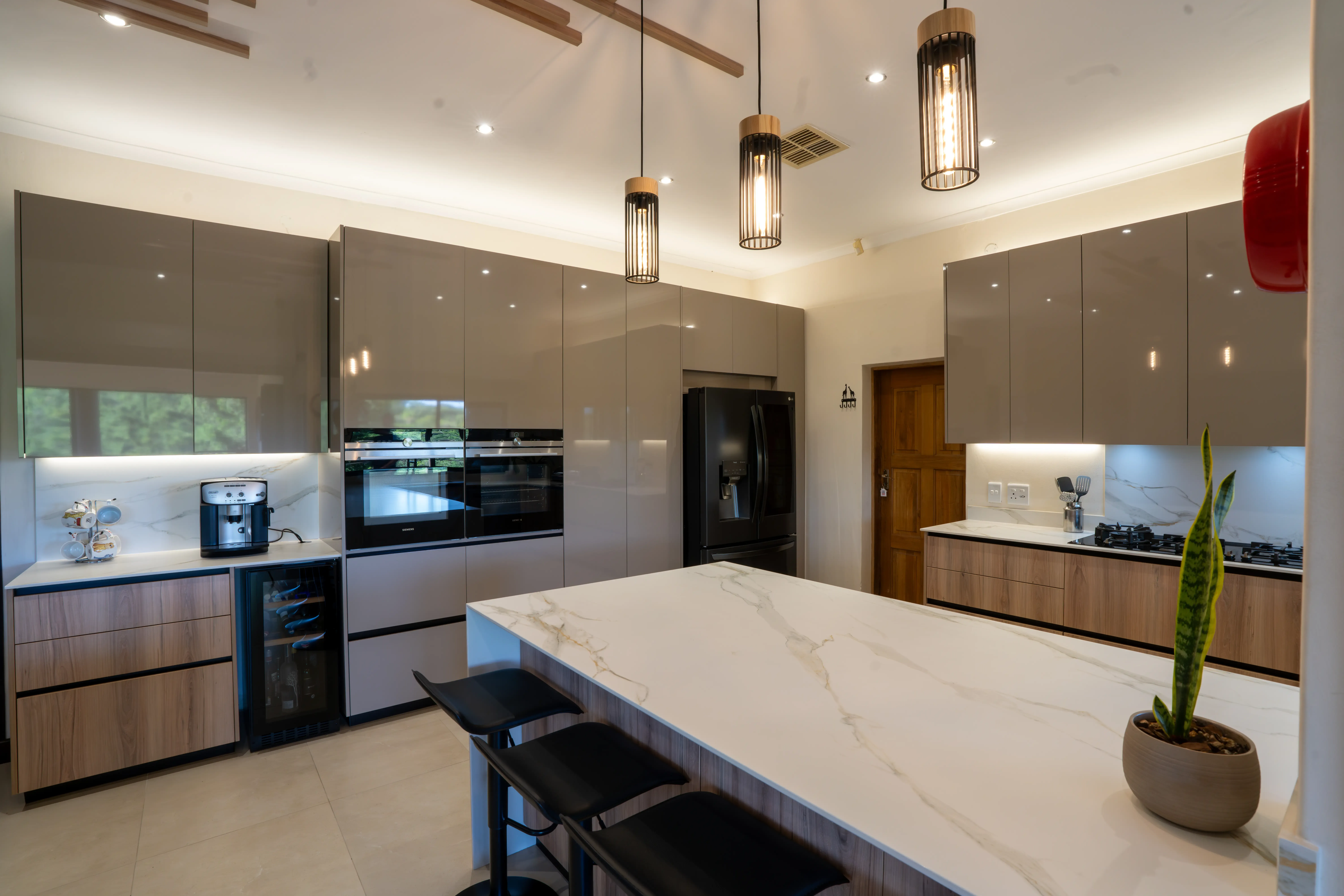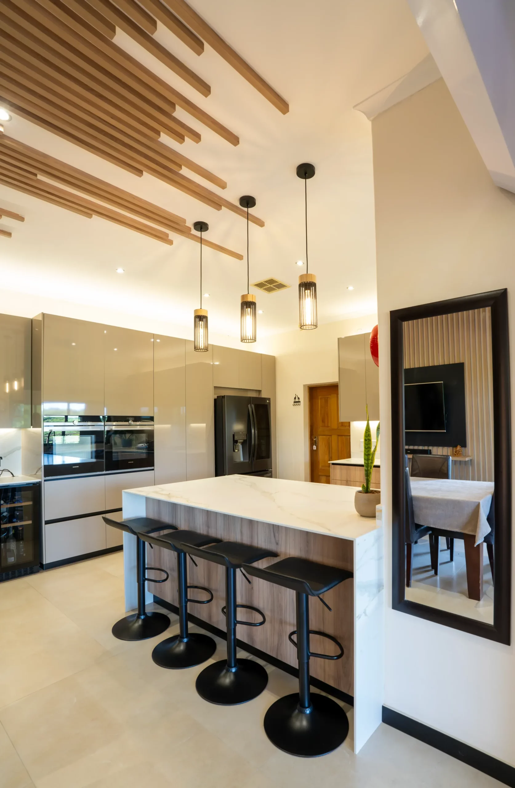 The kitchen embodies understated elegance with a harmonious blend of textures and tones. Featuring wood grain cabinetry paired with high-gloss surfaces and a stunning marble-look island, this space combines natural warmth with contemporary sophistication. Unique pendant lights and wooden ceiling accents create a visually striking focal point, while the open layout ensures a functional and inviting atmosphere. Perfect for modern living with a touch of organic charm.