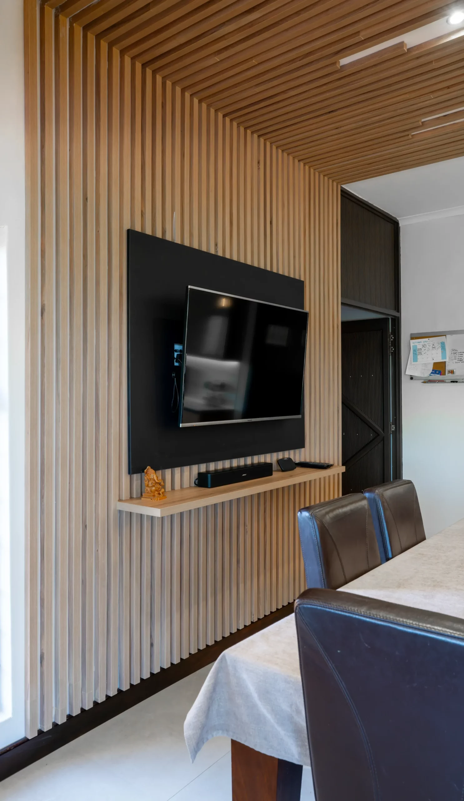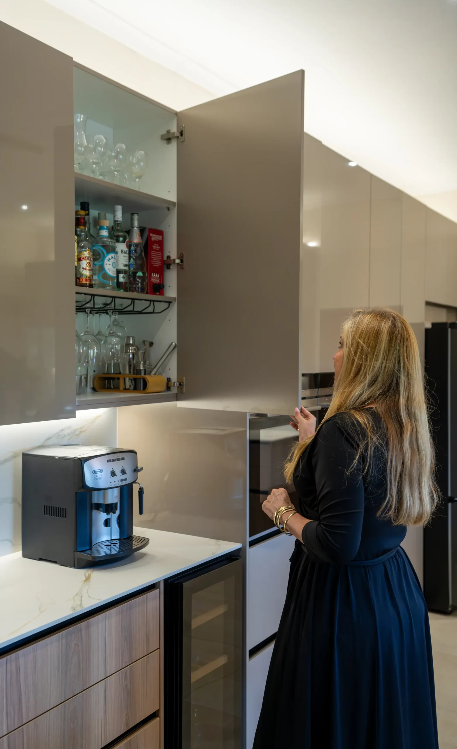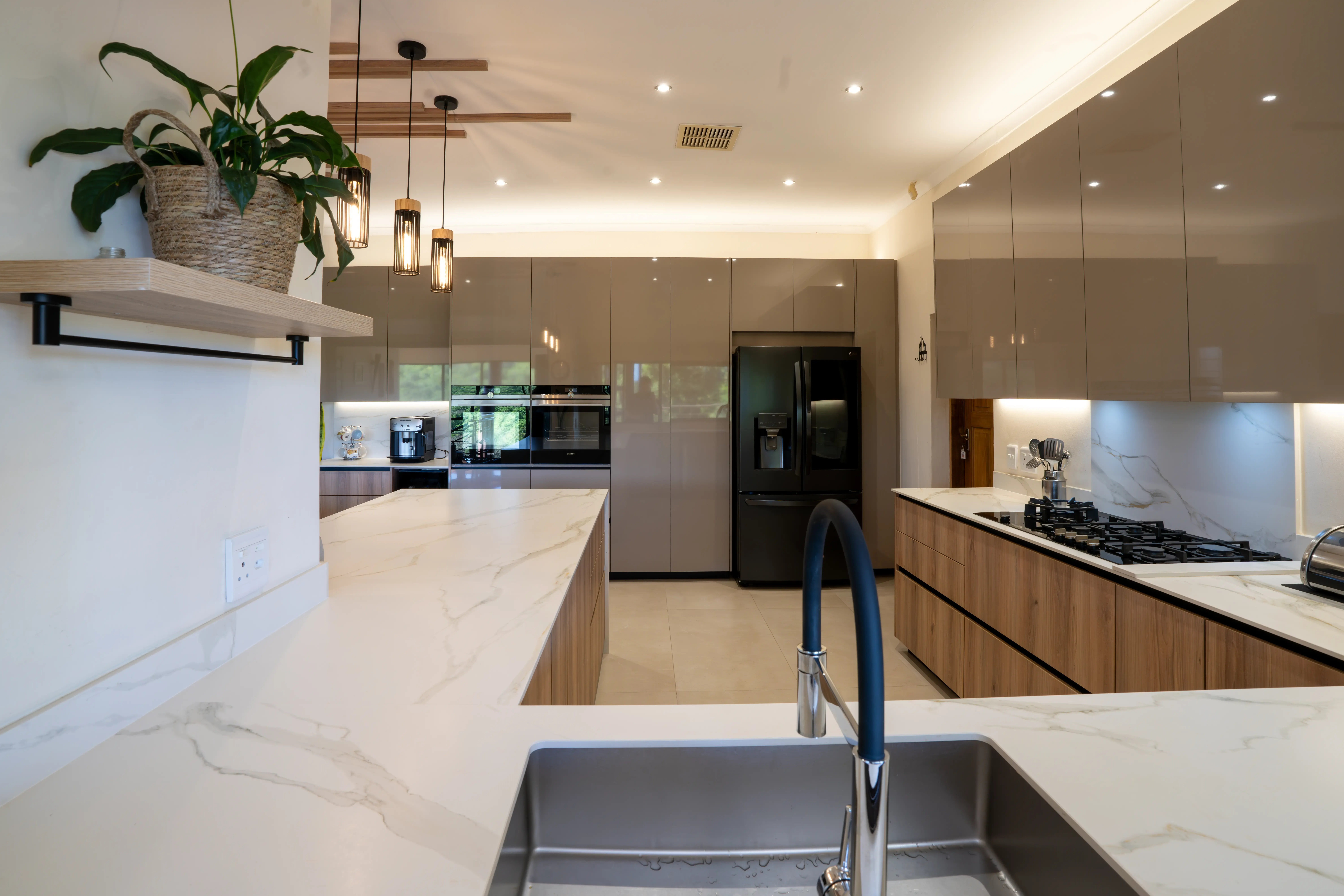 The kitchen embodies understated elegance with a harmonious blend of textures and tones. Featuring wood grain cabinetry paired with high-gloss surfaces and a stunning marble-look island, this space combines natural warmth with contemporary sophistication. Unique pendant lights and wooden ceiling accents create a visually striking focal point, while the open layout ensures a functional and inviting atmosphere. Perfect for modern living with a touch of organic charm.