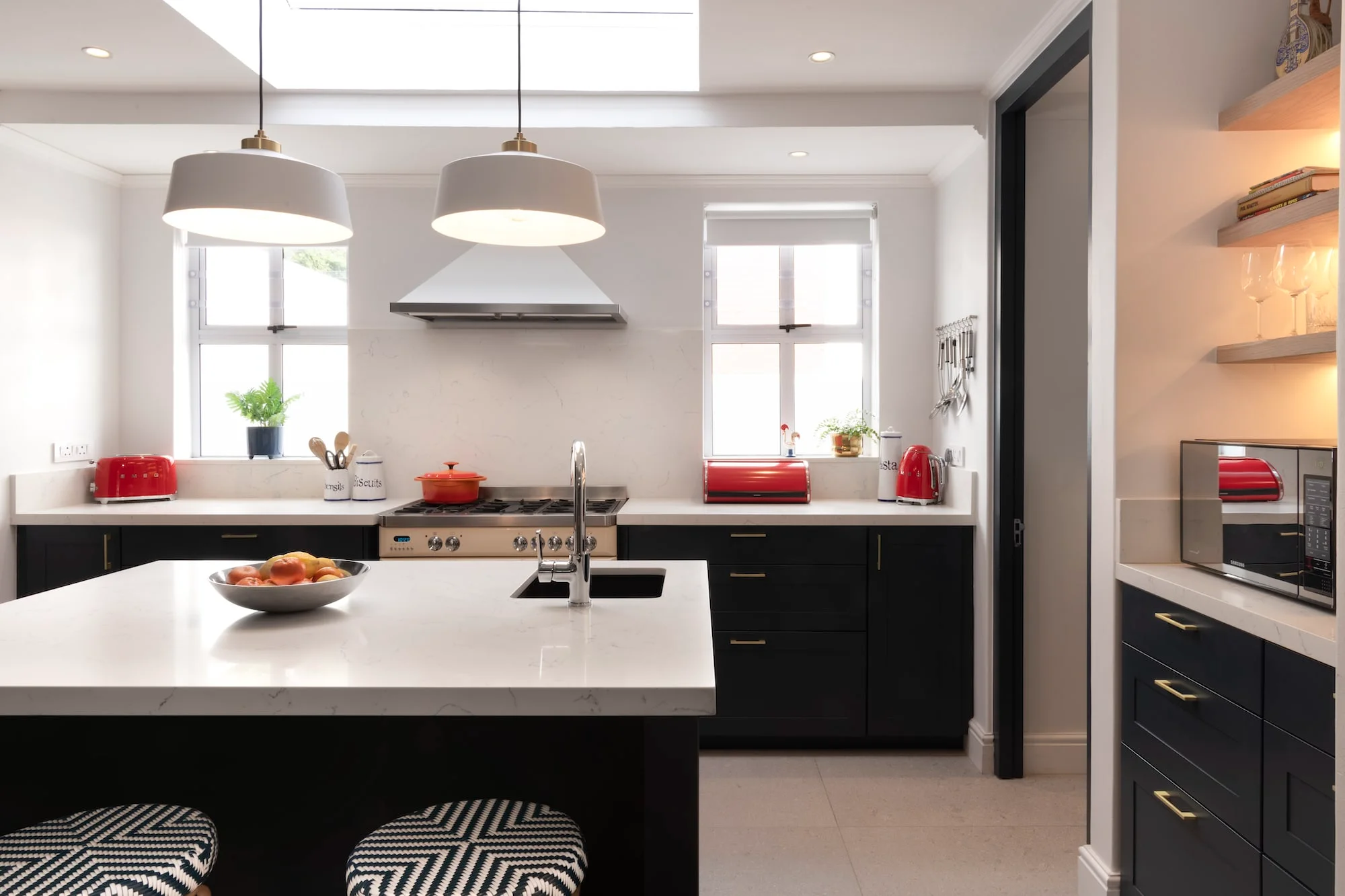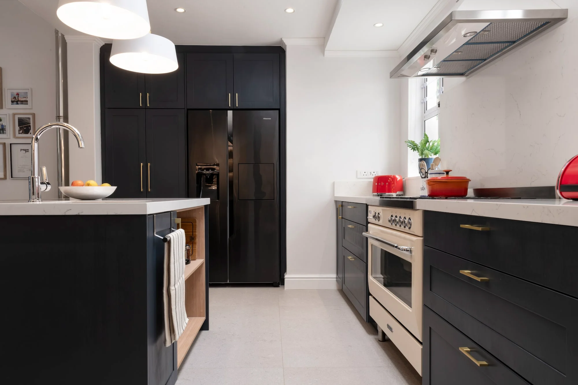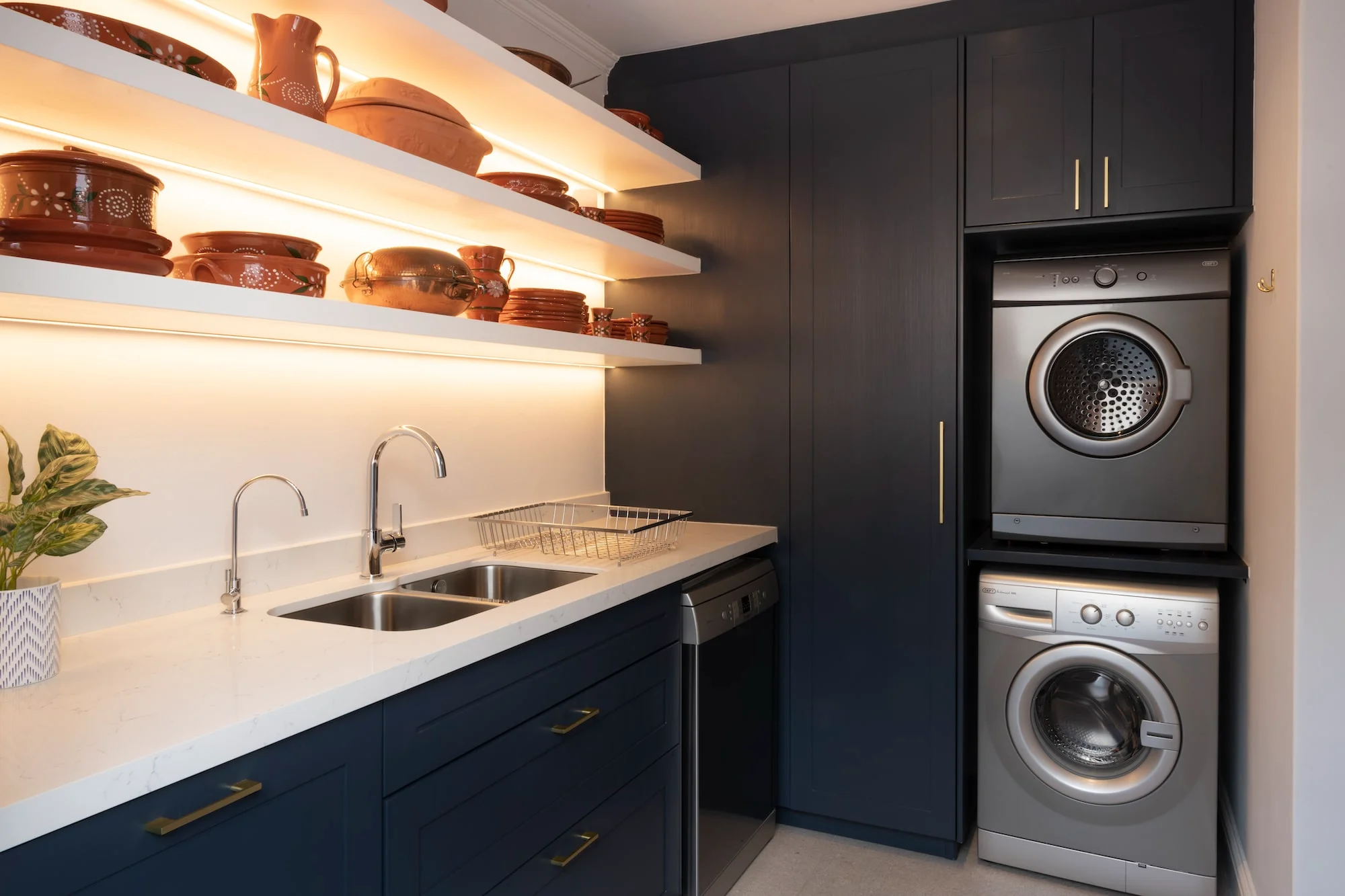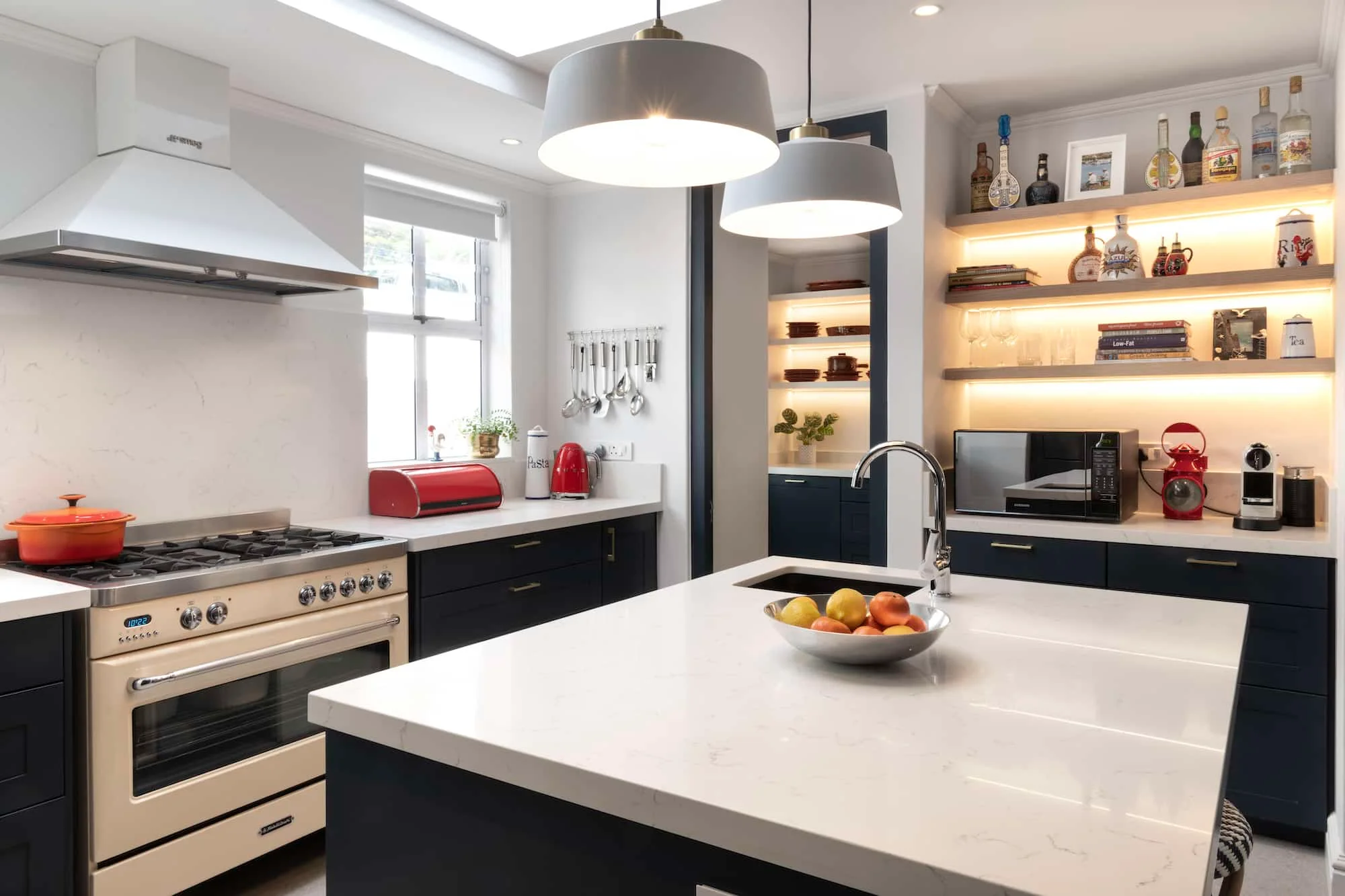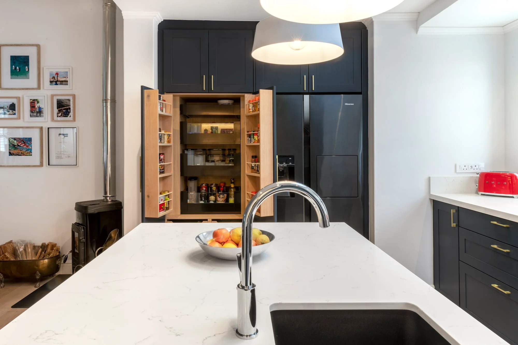 A classic and timeless kitchen design. Featuring Navy Blue shades, marble pops, and hints of wood with hand painted Navy Blue doors and shaker panels with Oak floating shelves. Eezi Quartz Whisper countertops pair eloquently with high splashbacks and oven cladding. The SMEG extractor fan in white with undermount stainless steel sinks to tie together the appliances.