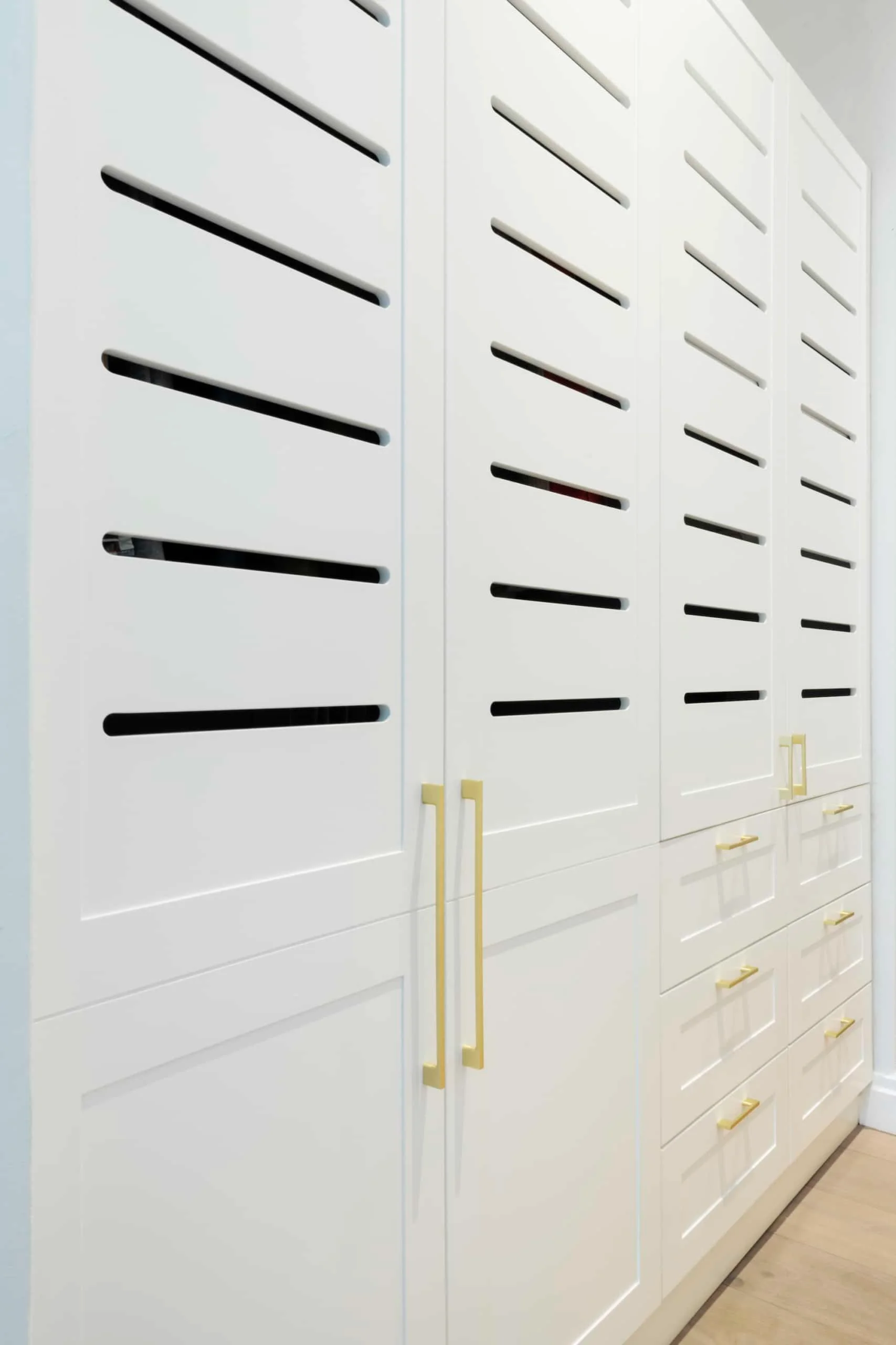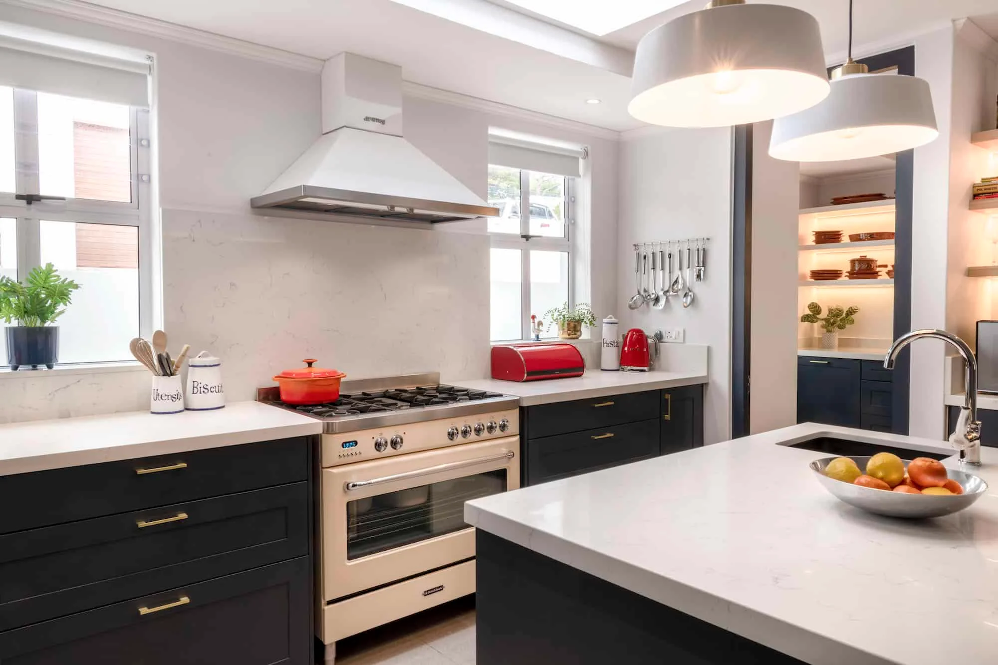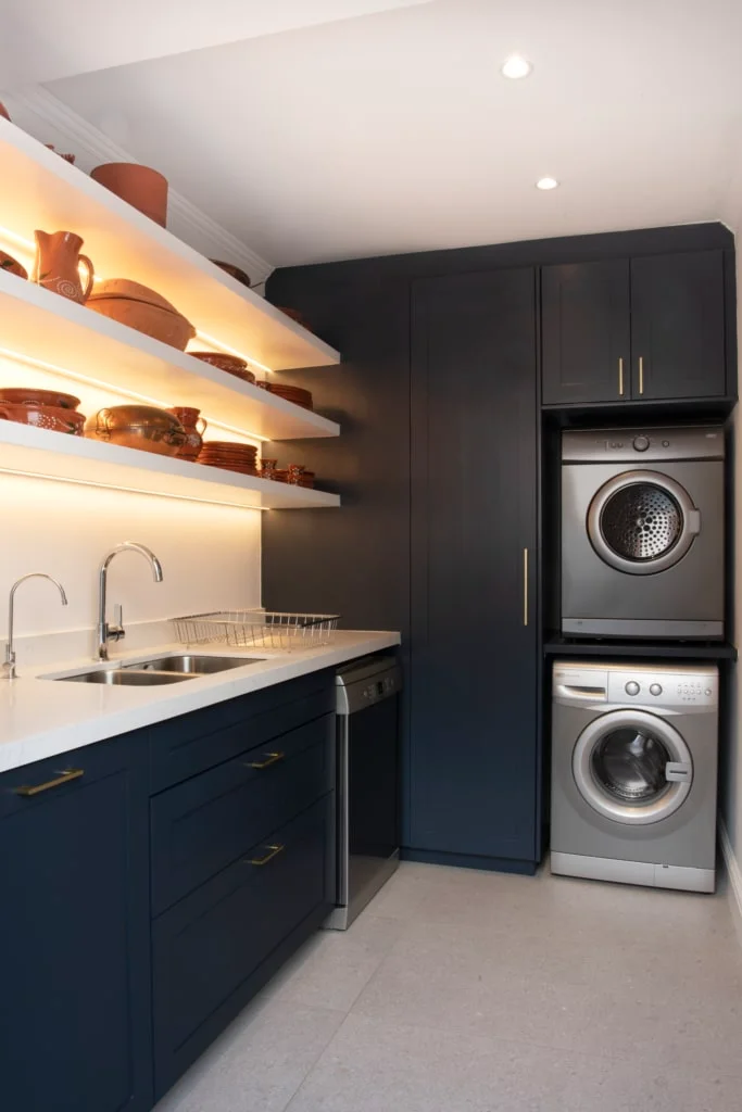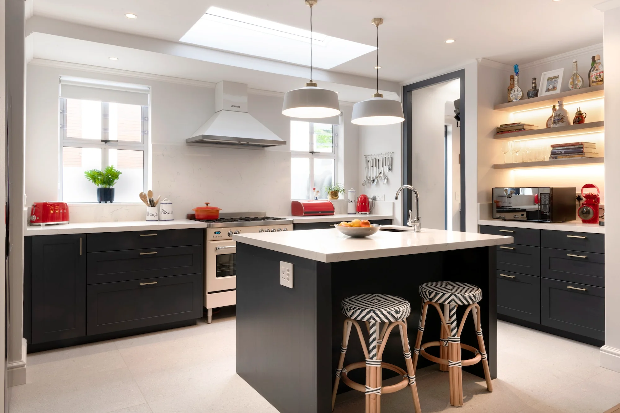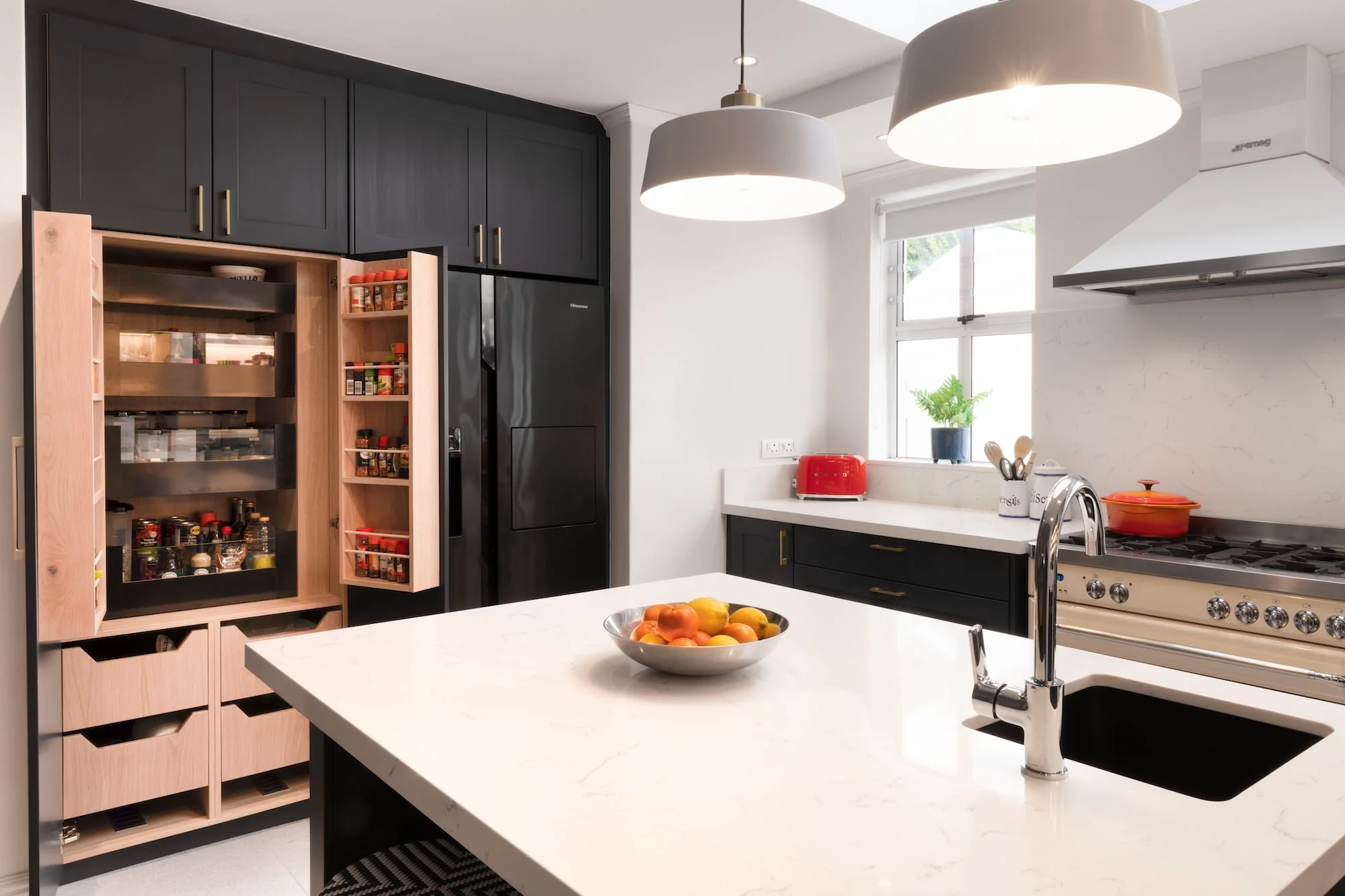A classic and timeless kitchen design. Featuring Navy Blue shades, marble pops, and hints of wood with hand painted Navy Blue doors and shaker panels with Oak floating shelves. Eezi Quartz Whisper countertops pair eloquently with high splashbacks and oven cladding. The SMEG extractor fan in white with undermount stainless steel sinks to tie together the appliances.