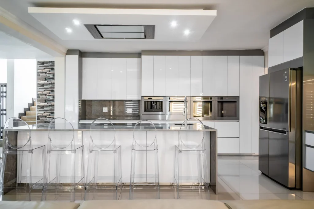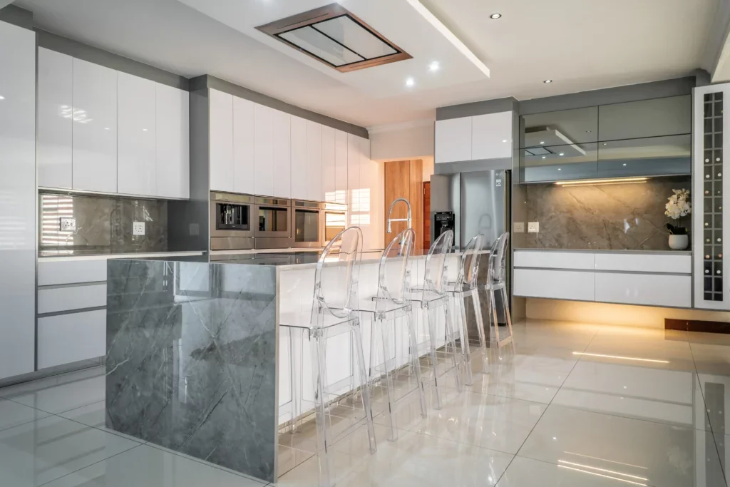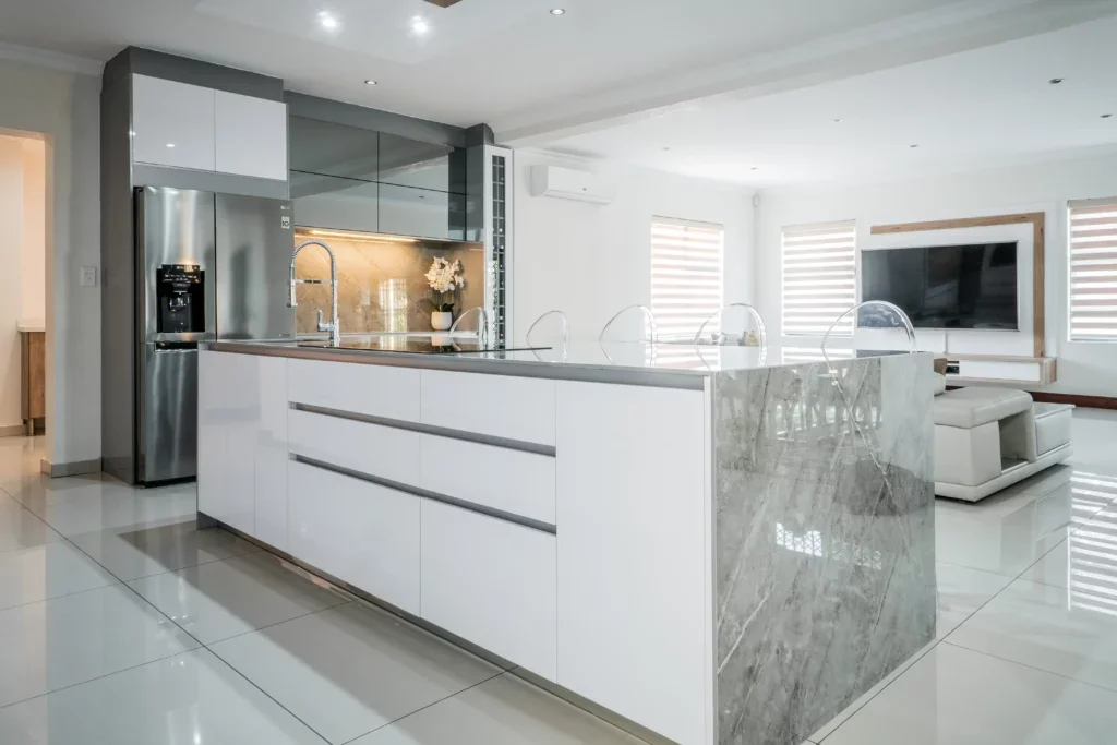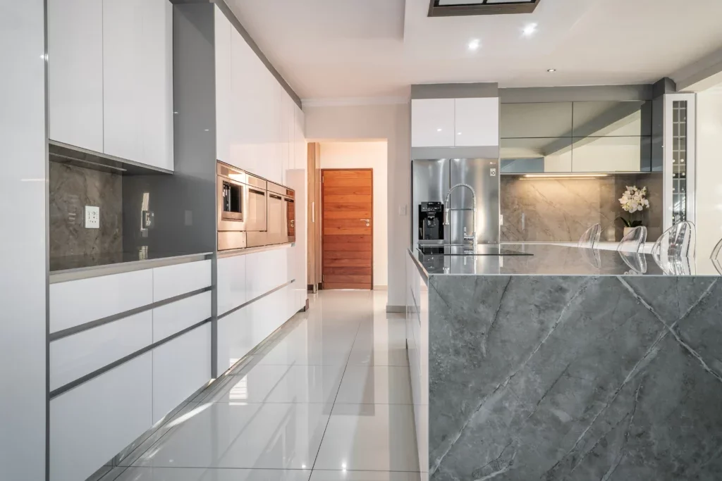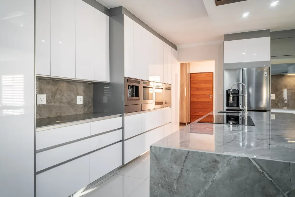 Neutral and natural are two words to describe this stunning kitchen design! Iceberg White and Grey were combined to create a unified look and feel for this project. The client chose to make use of glossy finishes for this kitchen.