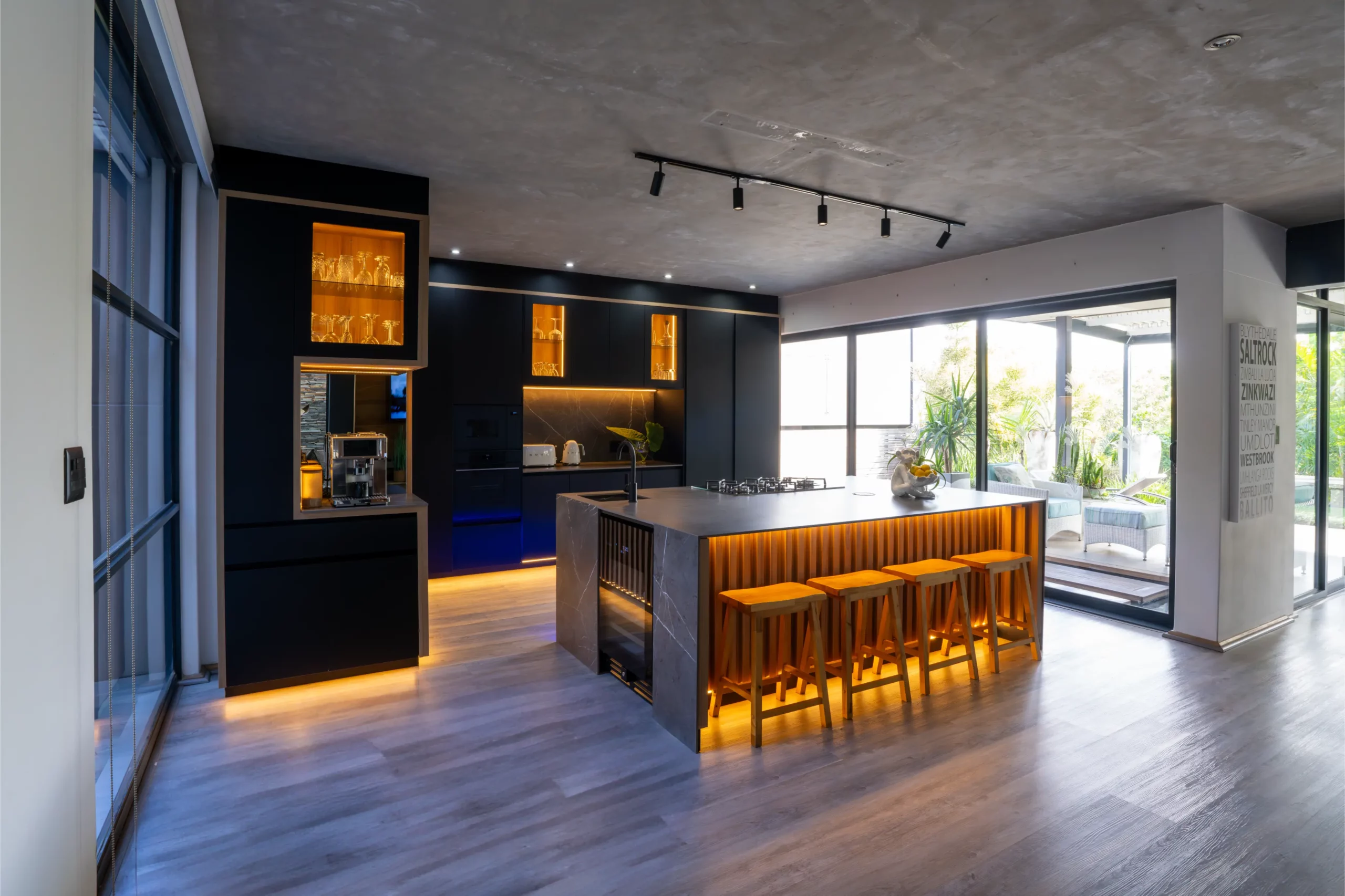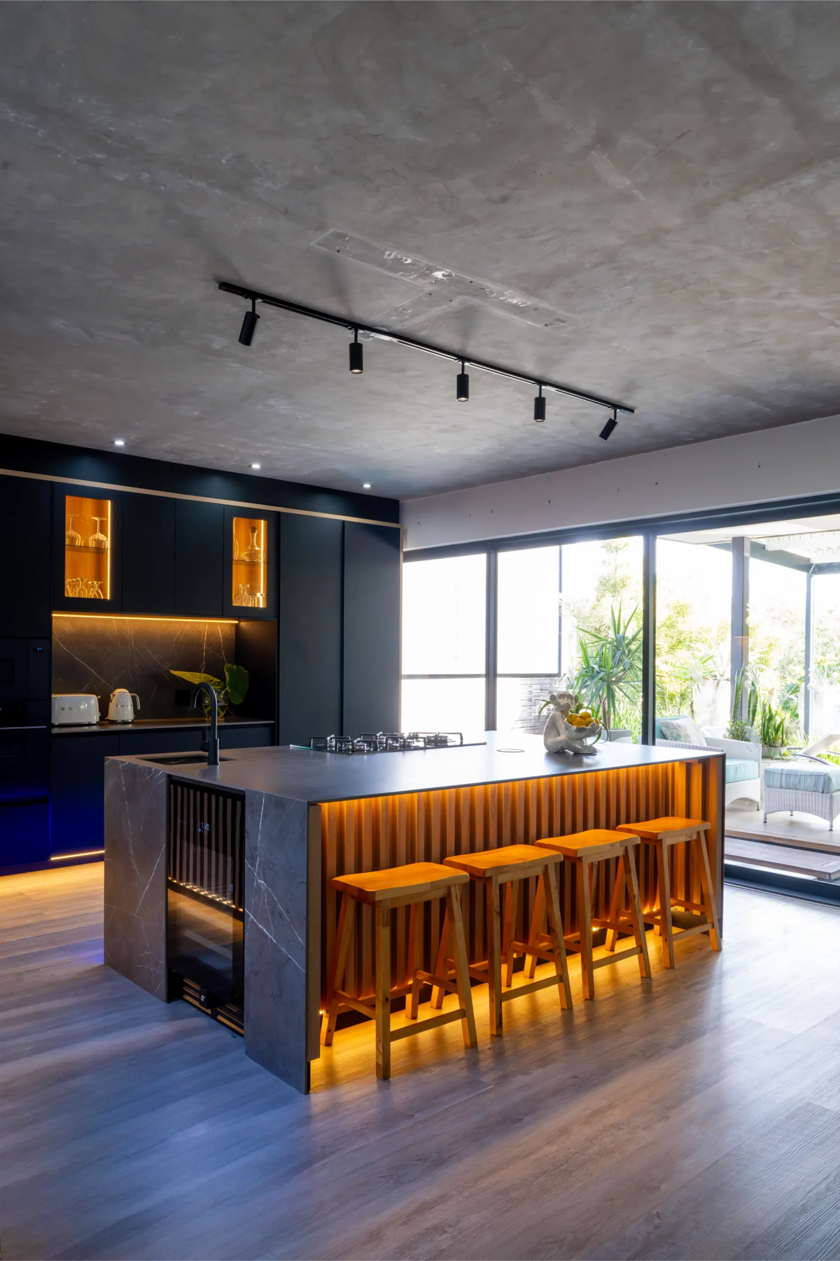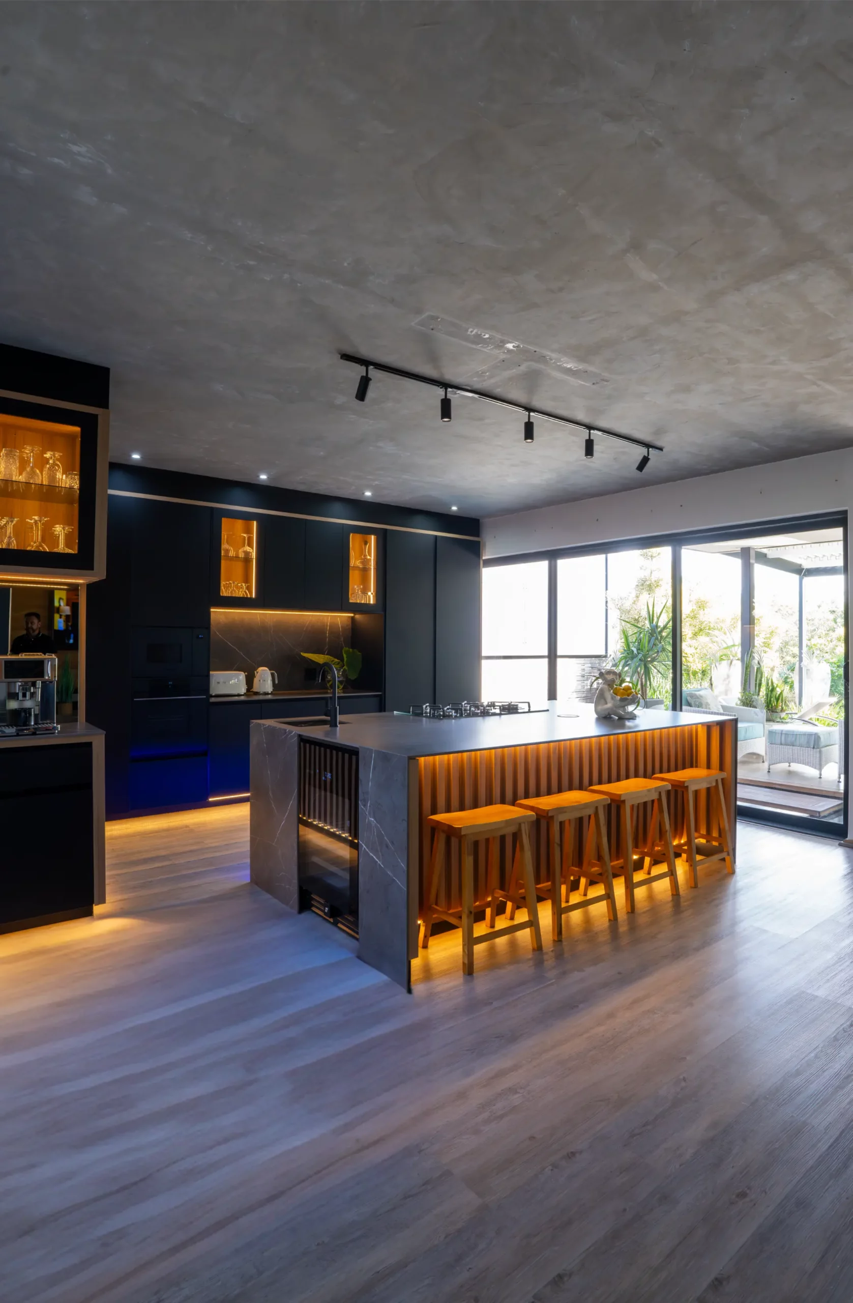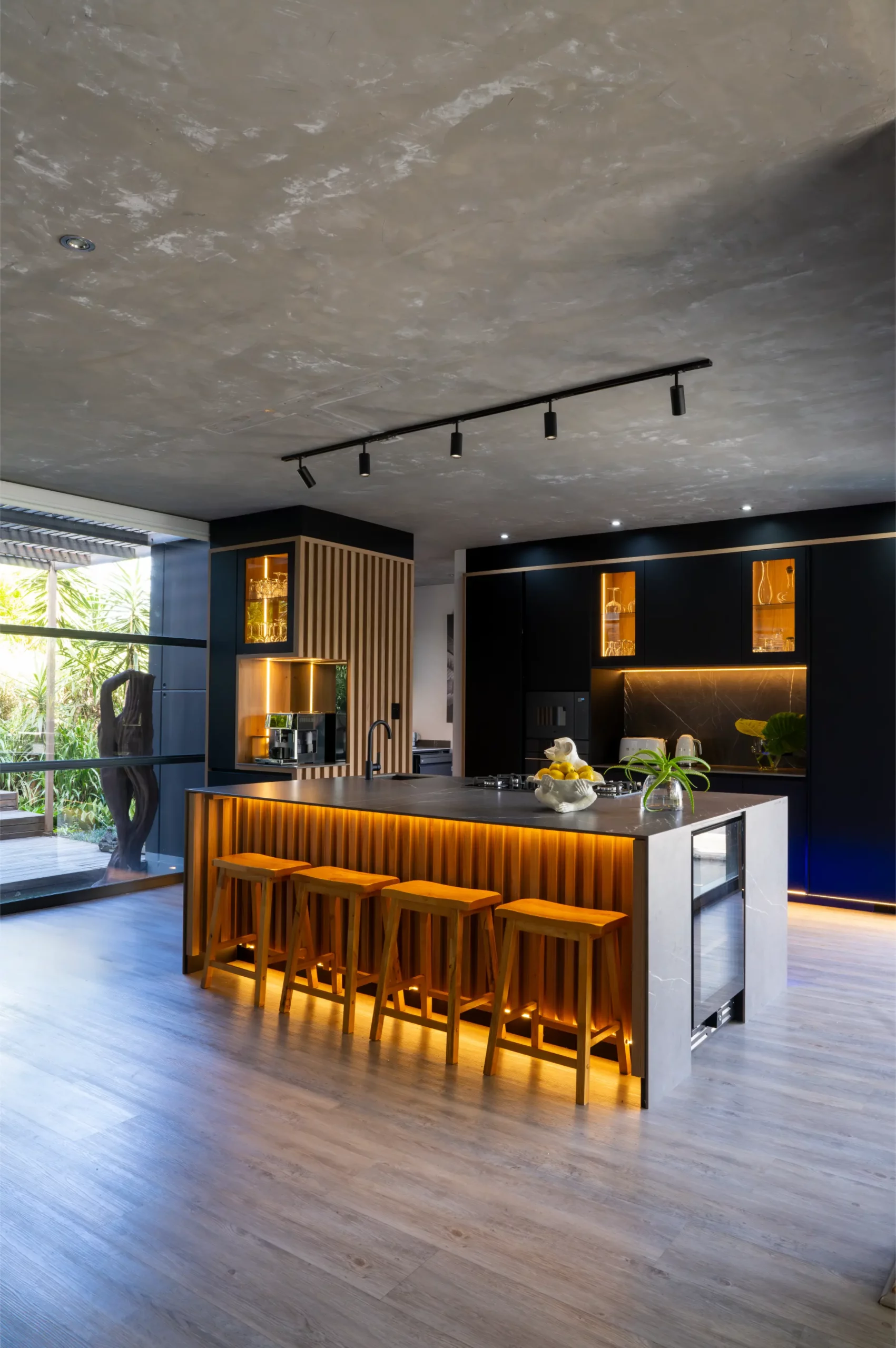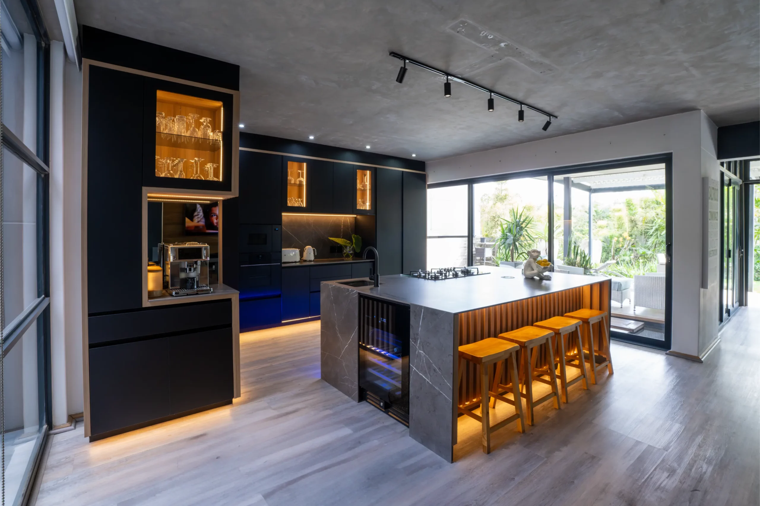 A central island with slim porcelain counters. Featuring sleek black cabinetry with integrated lighting, a central island with textured stone finishes, and vibrant under-cabinet illumination, this space offers both elegance and functionality. The open-plan layout seamlessly connects the kitchen to outdoor living, creating the perfect hub for entertaining and everyday living.