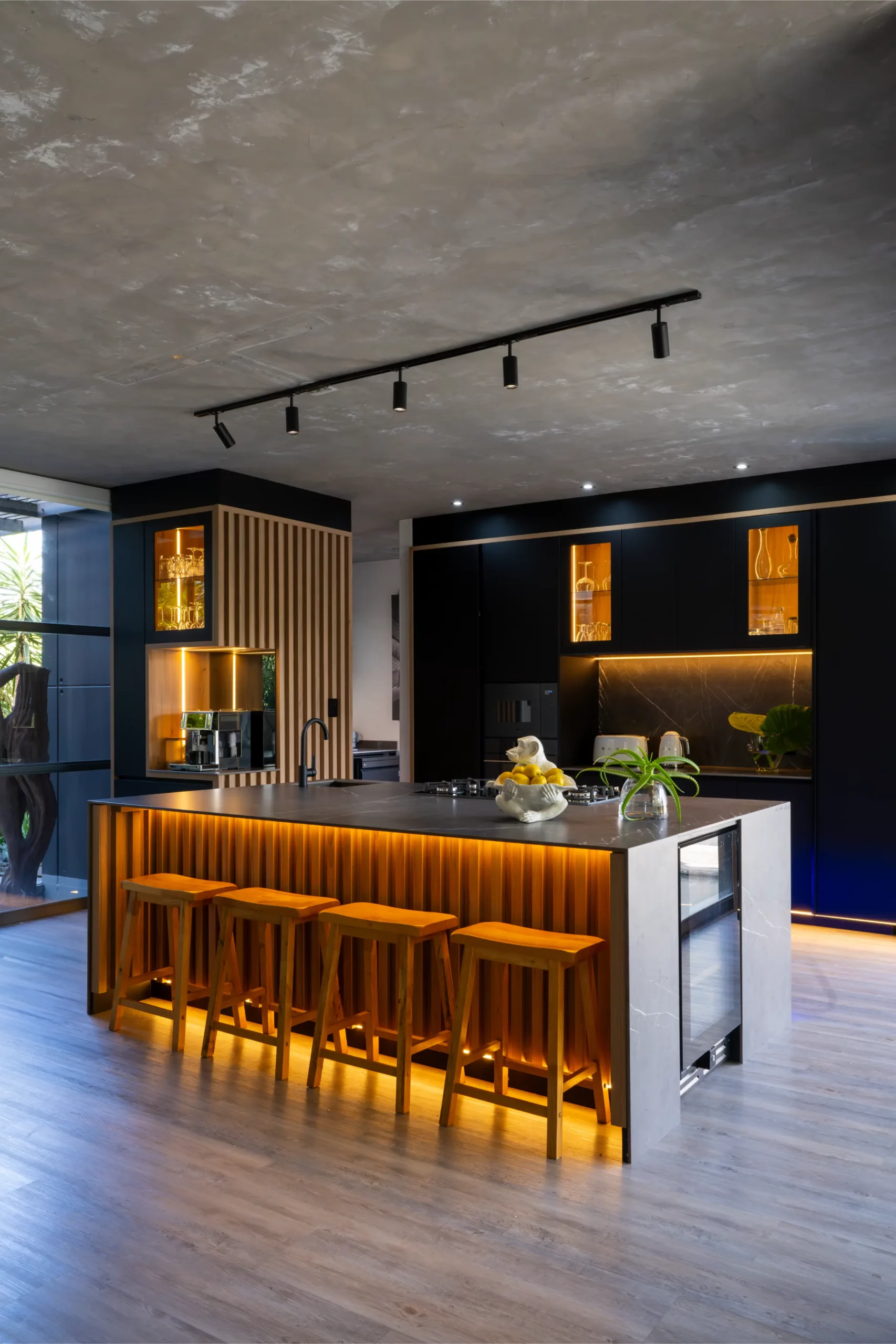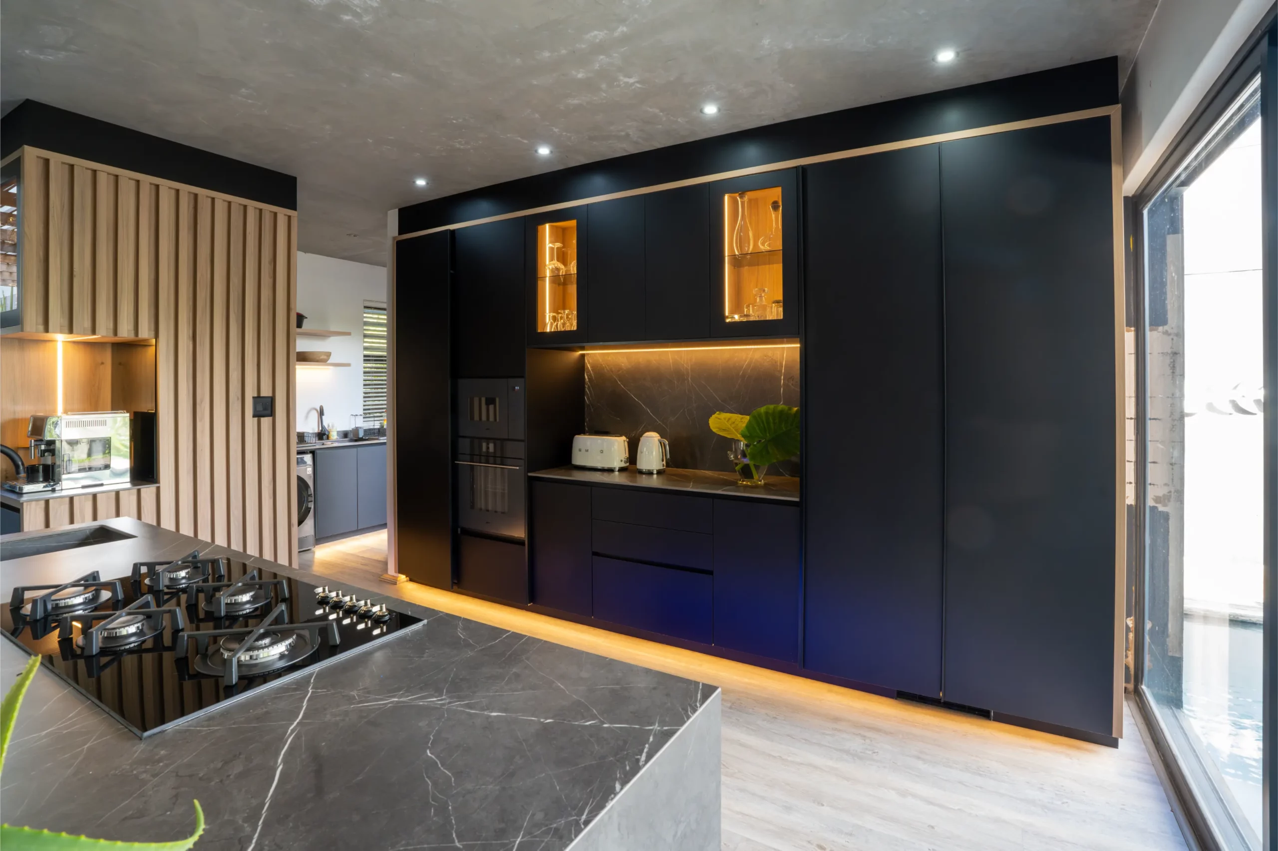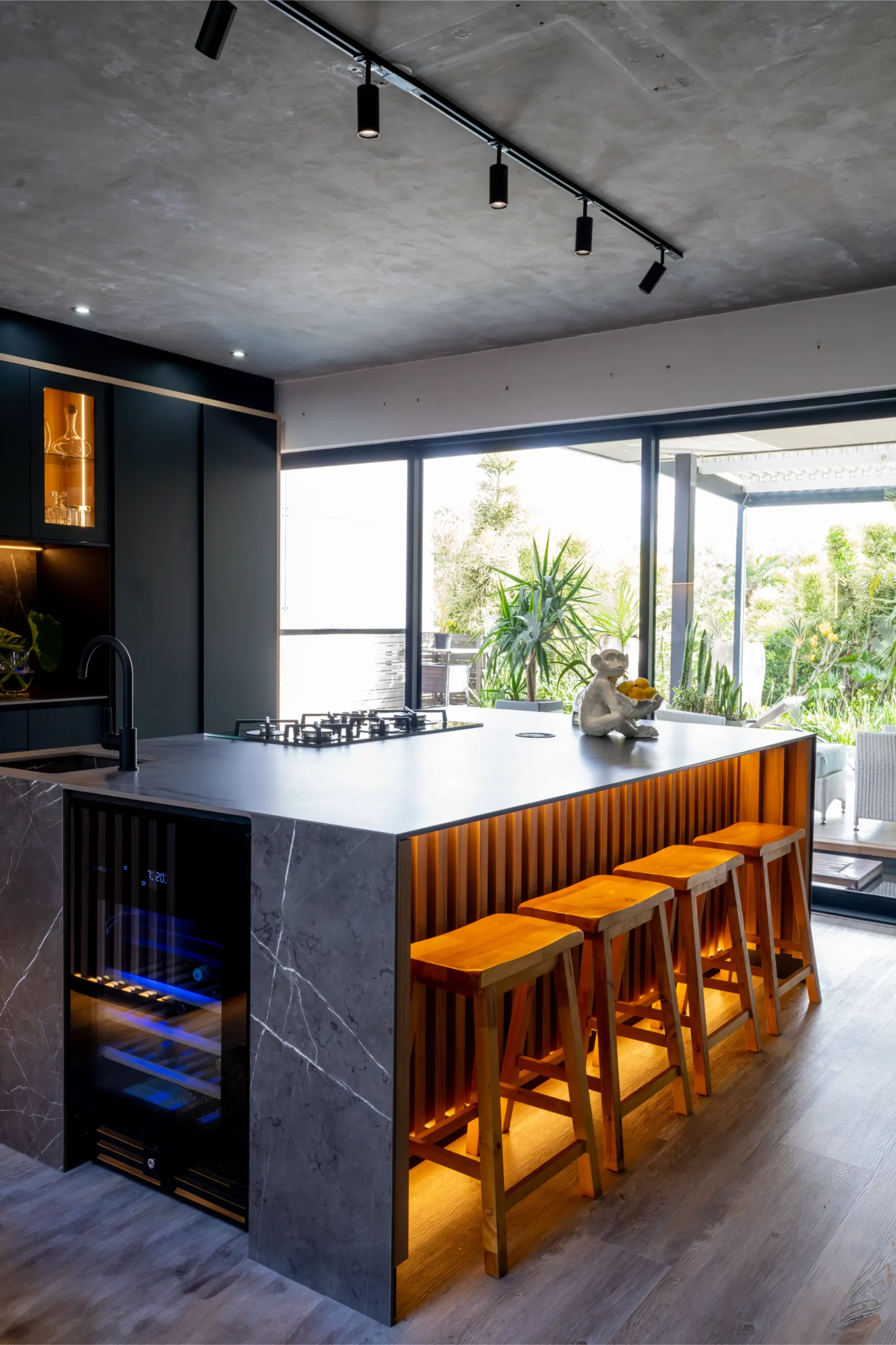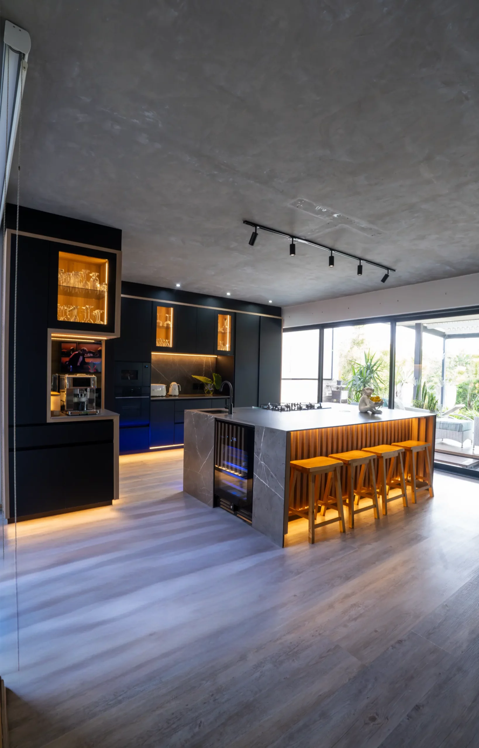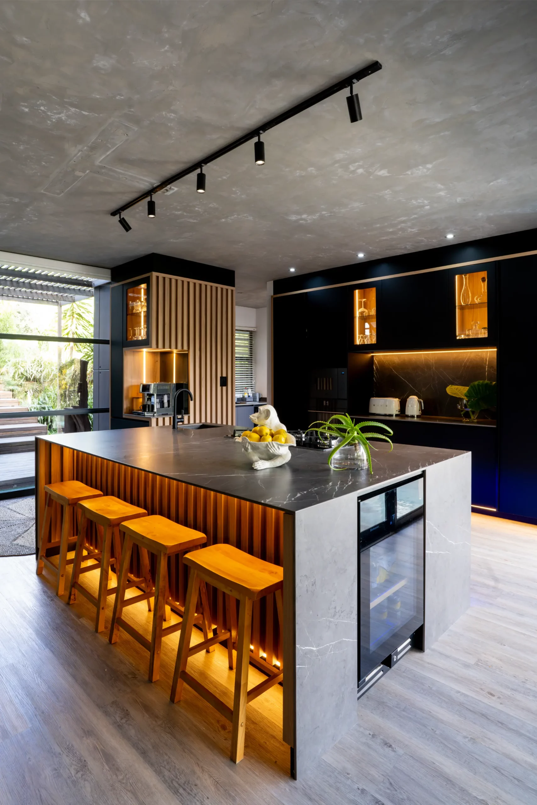 A central island with slim porcelain counters. Featuring sleek black cabinetry with integrated lighting, a central island with textured stone finishes, and vibrant under-cabinet illumination, this space offers both elegance and functionality. The open-plan layout seamlessly connects the kitchen to outdoor living, creating the perfect hub for entertaining and everyday living.