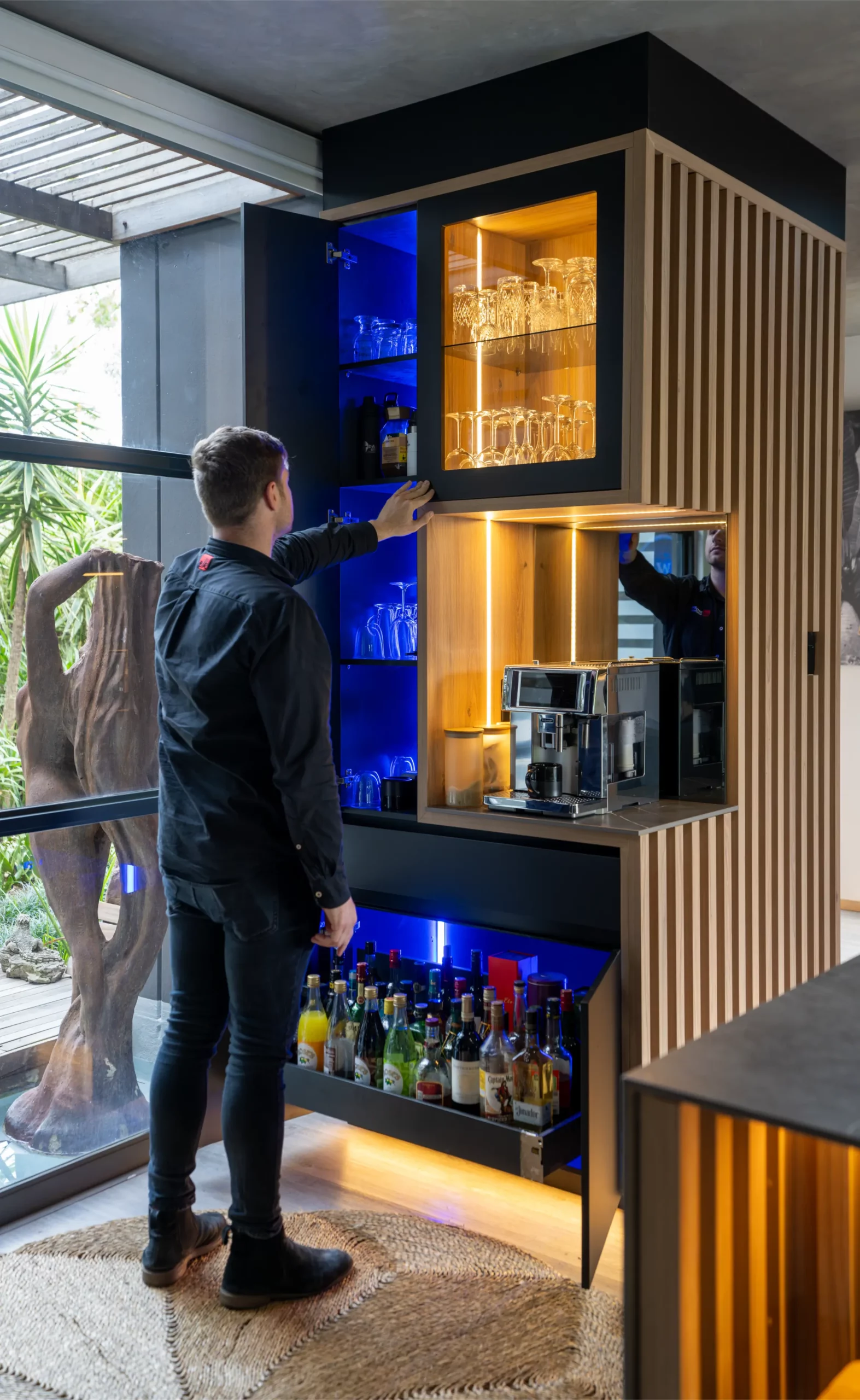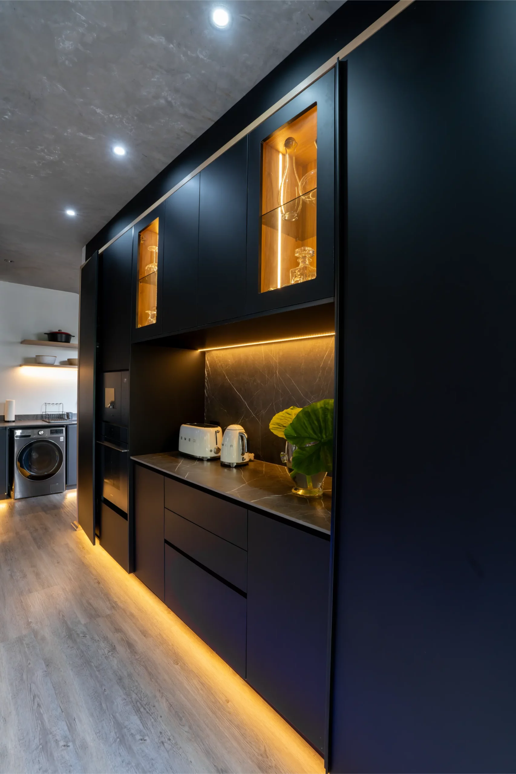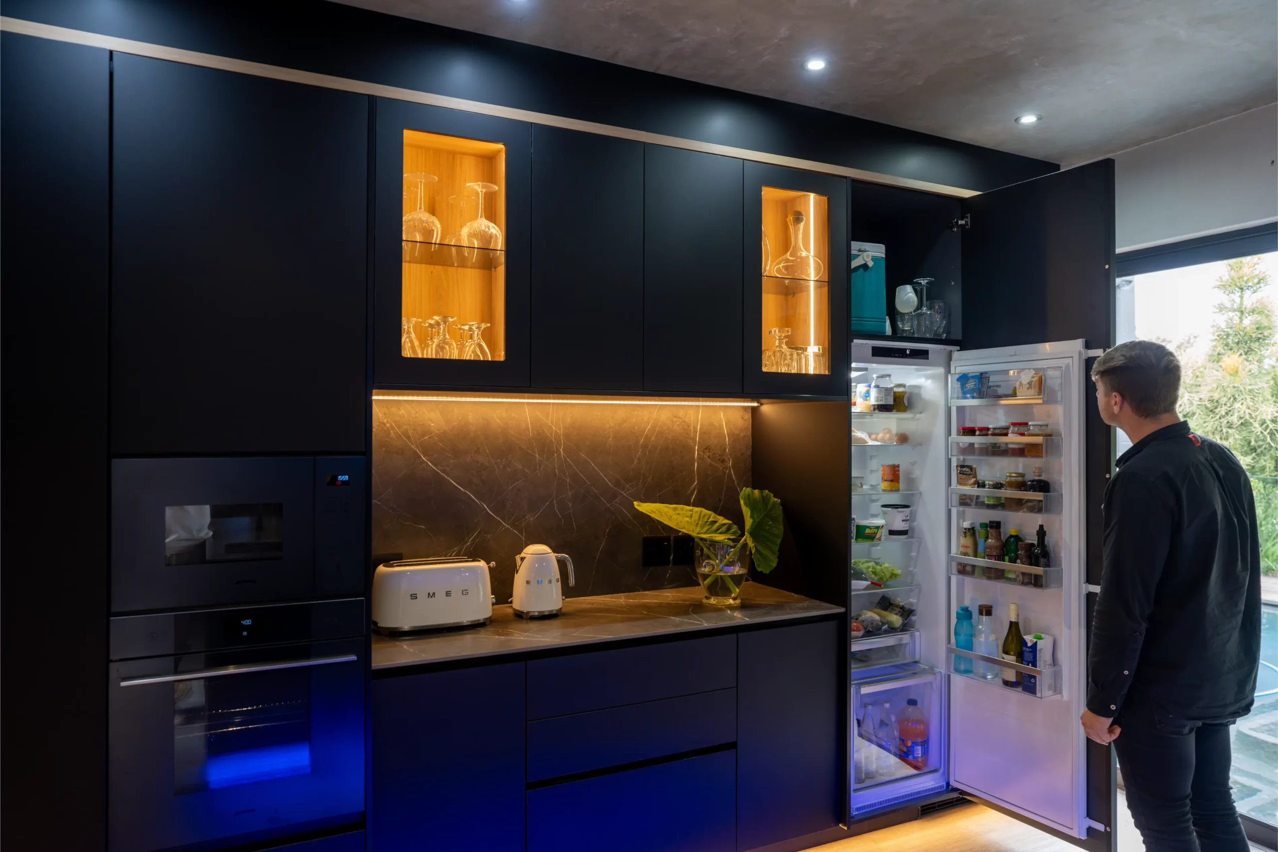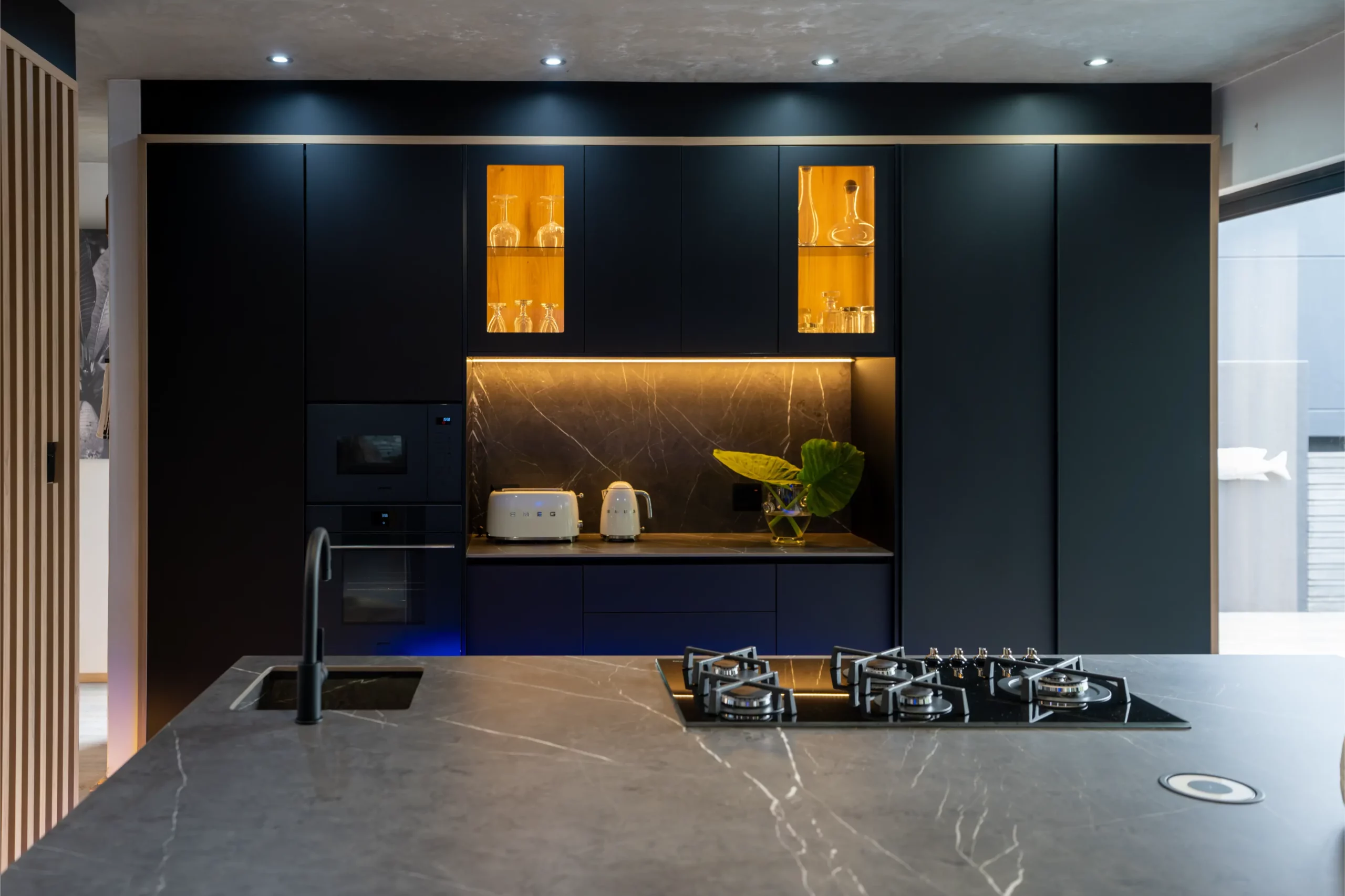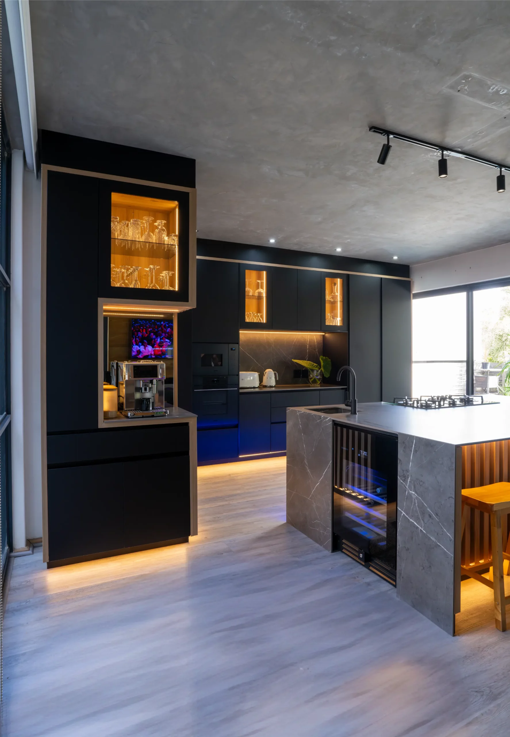 A central island with slim porcelain counters. Featuring sleek black cabinetry with integrated lighting, a central island with textured stone finishes, and vibrant under-cabinet illumination, this space offers both elegance and functionality. The open-plan layout seamlessly connects the kitchen to outdoor living, creating the perfect hub for entertaining and everyday living.