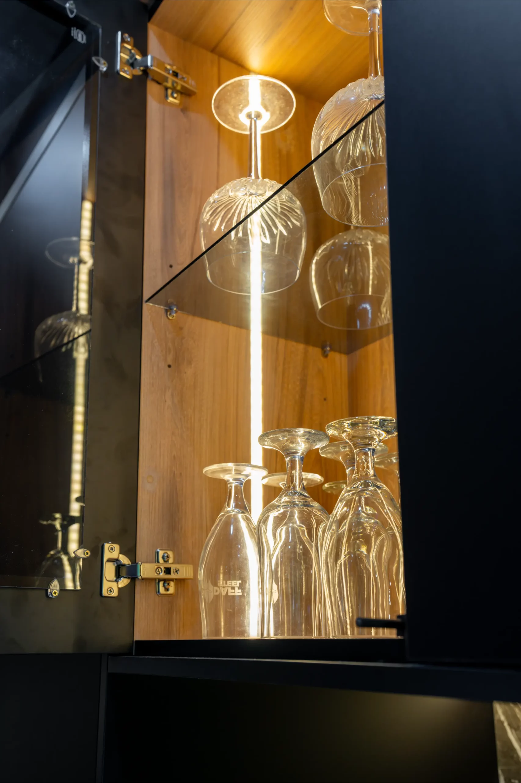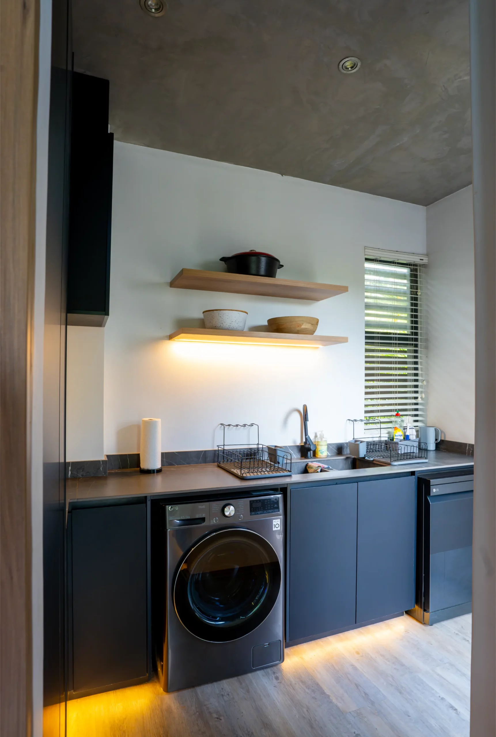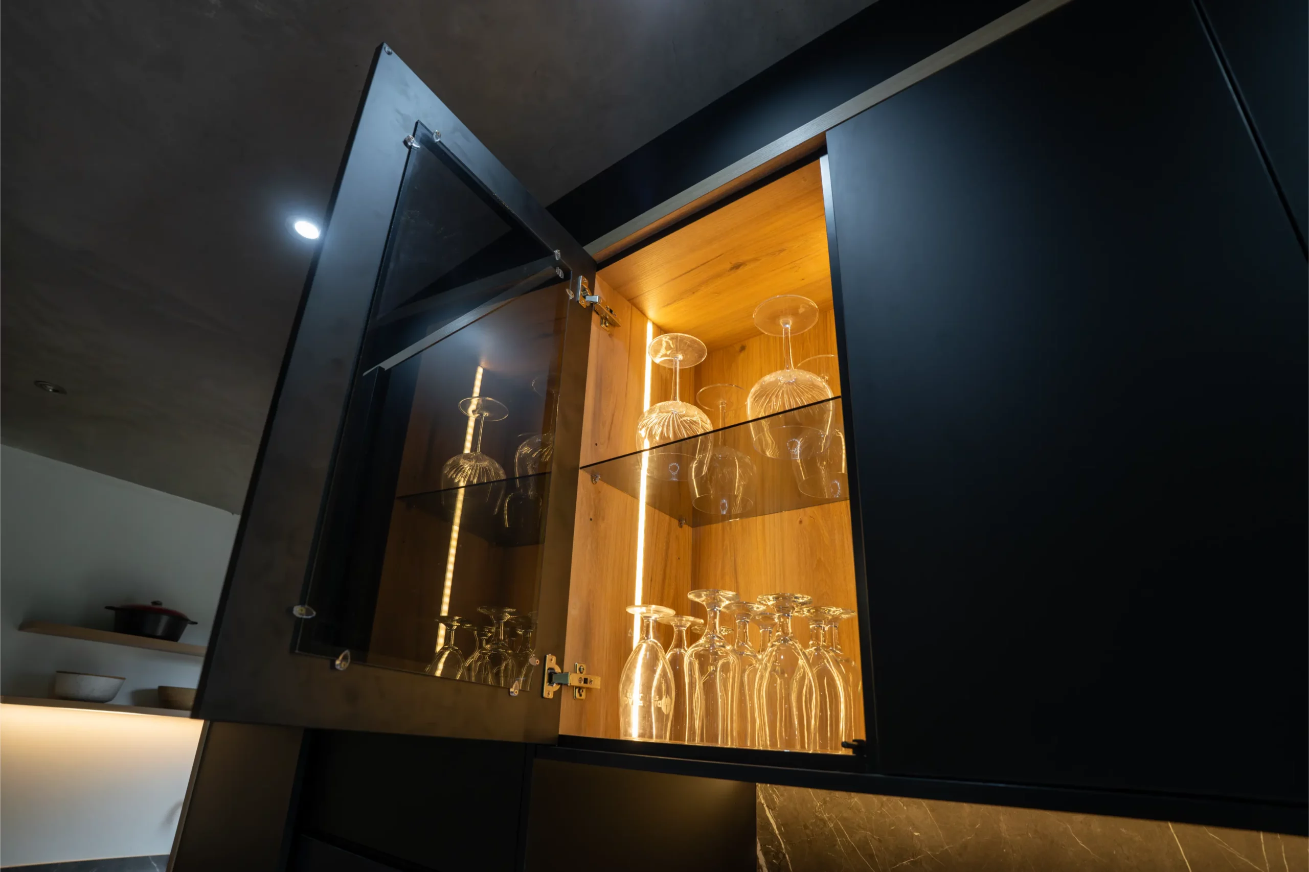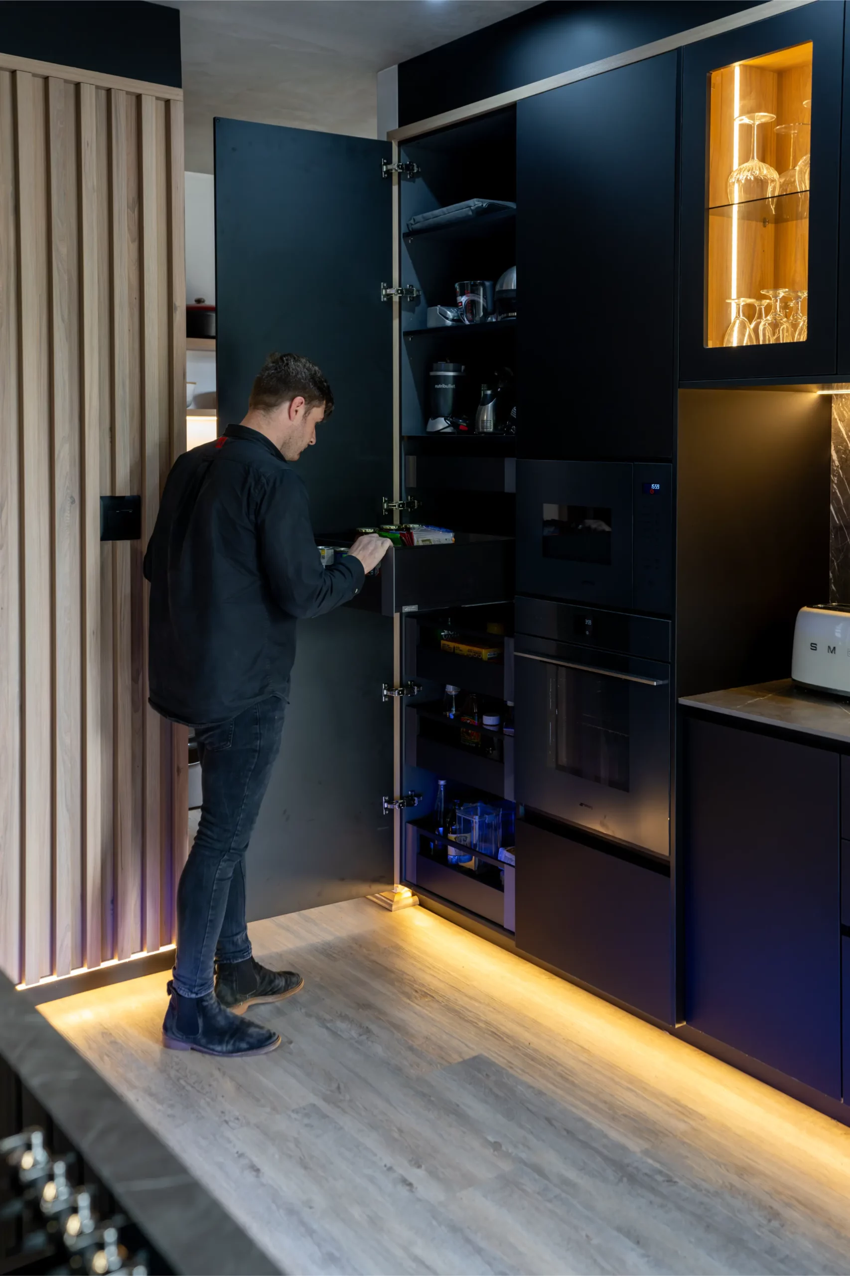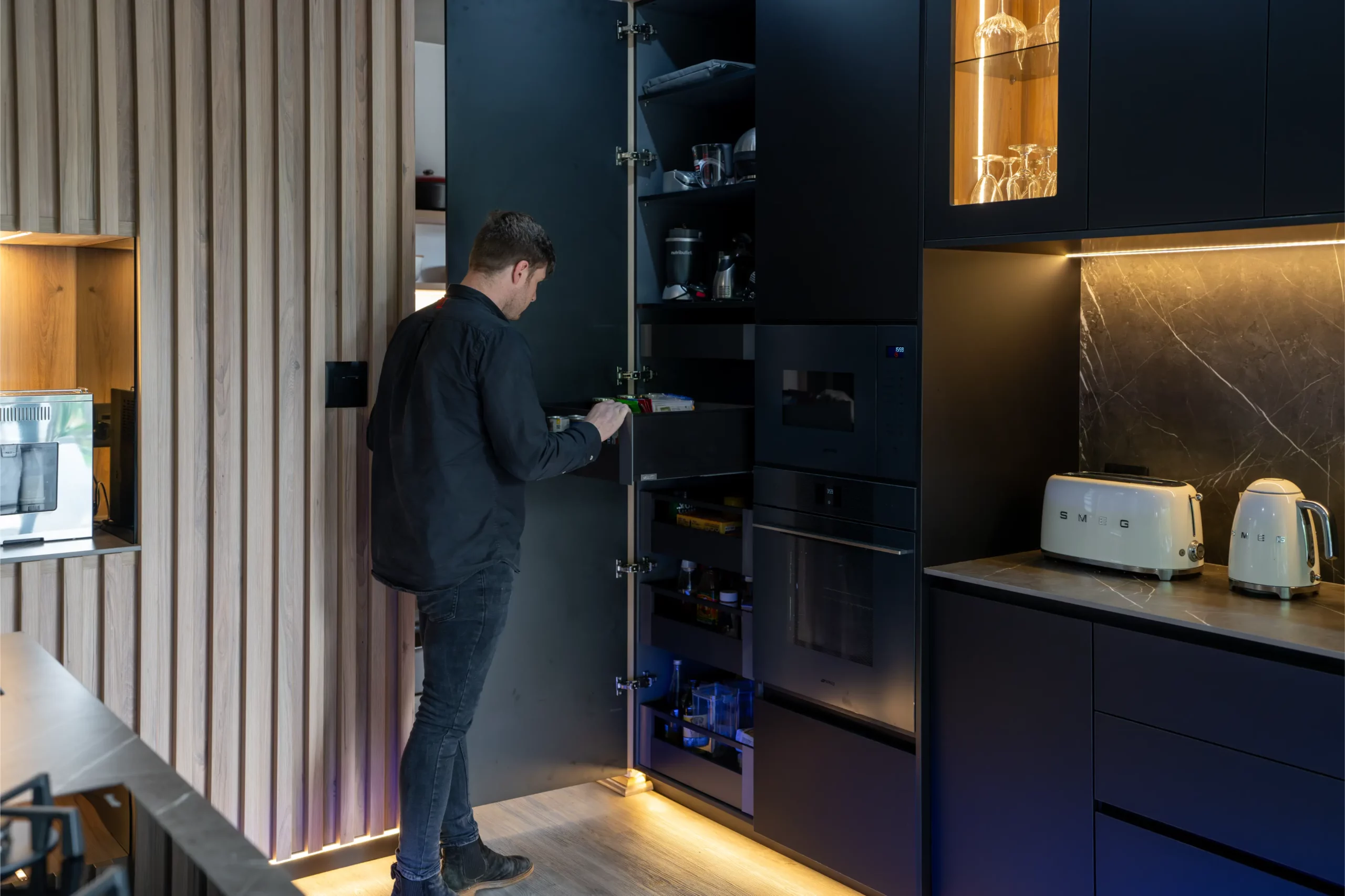 A central island with slim porcelain counters. Featuring sleek black cabinetry with integrated lighting, a central island with textured stone finishes, and vibrant under-cabinet illumination, this space offers both elegance and functionality. The open-plan layout seamlessly connects the kitchen to outdoor living, creating the perfect hub for entertaining and everyday living.