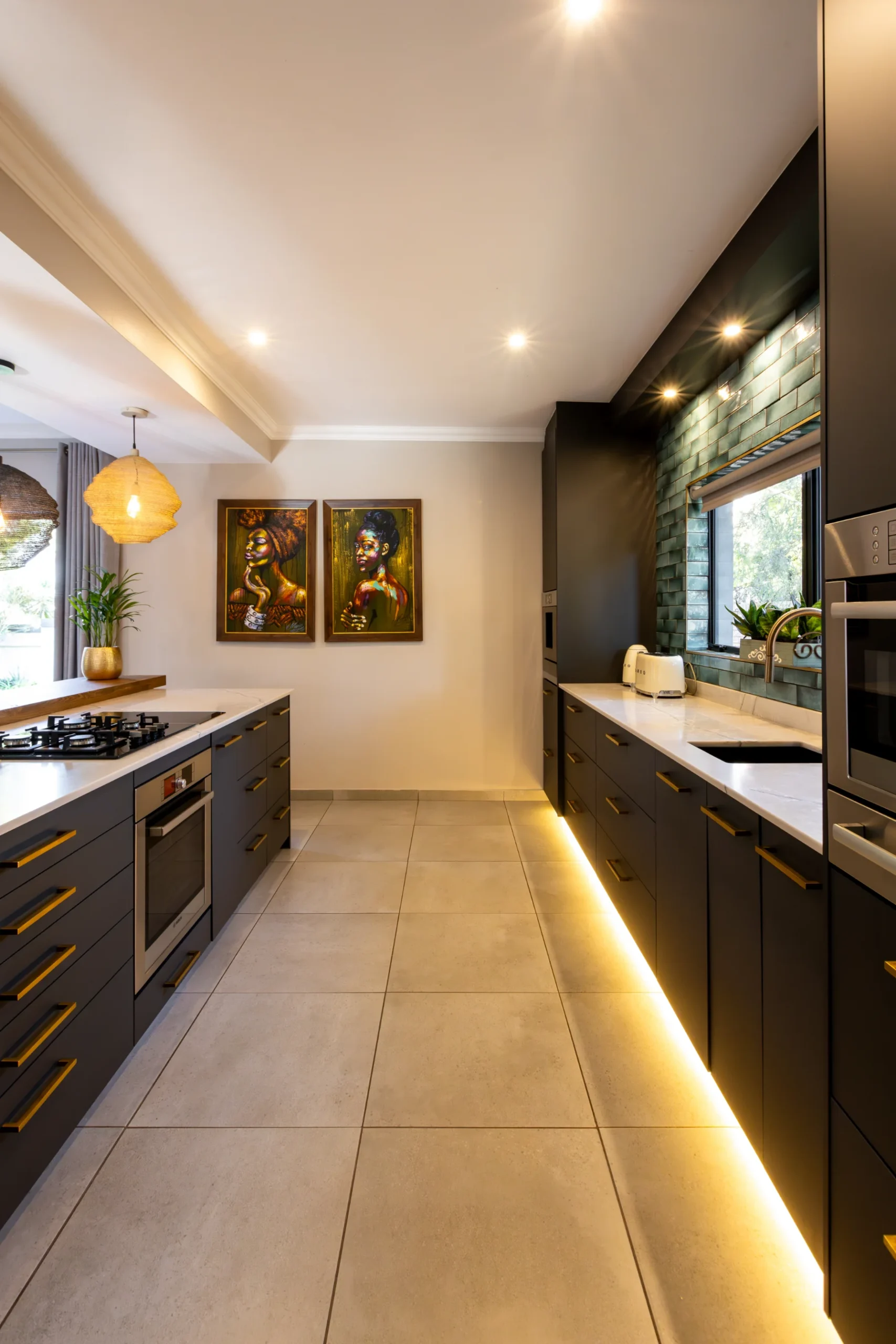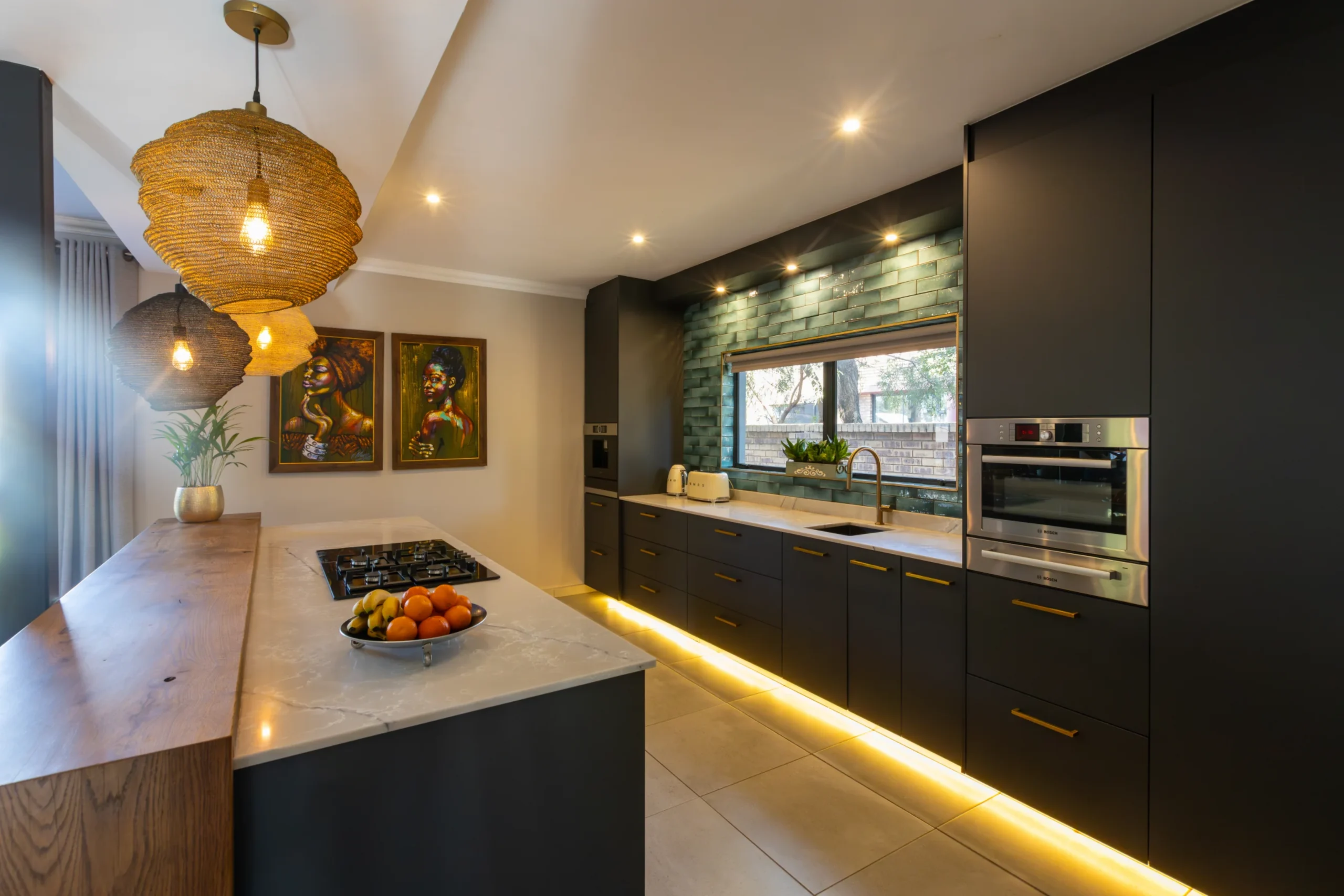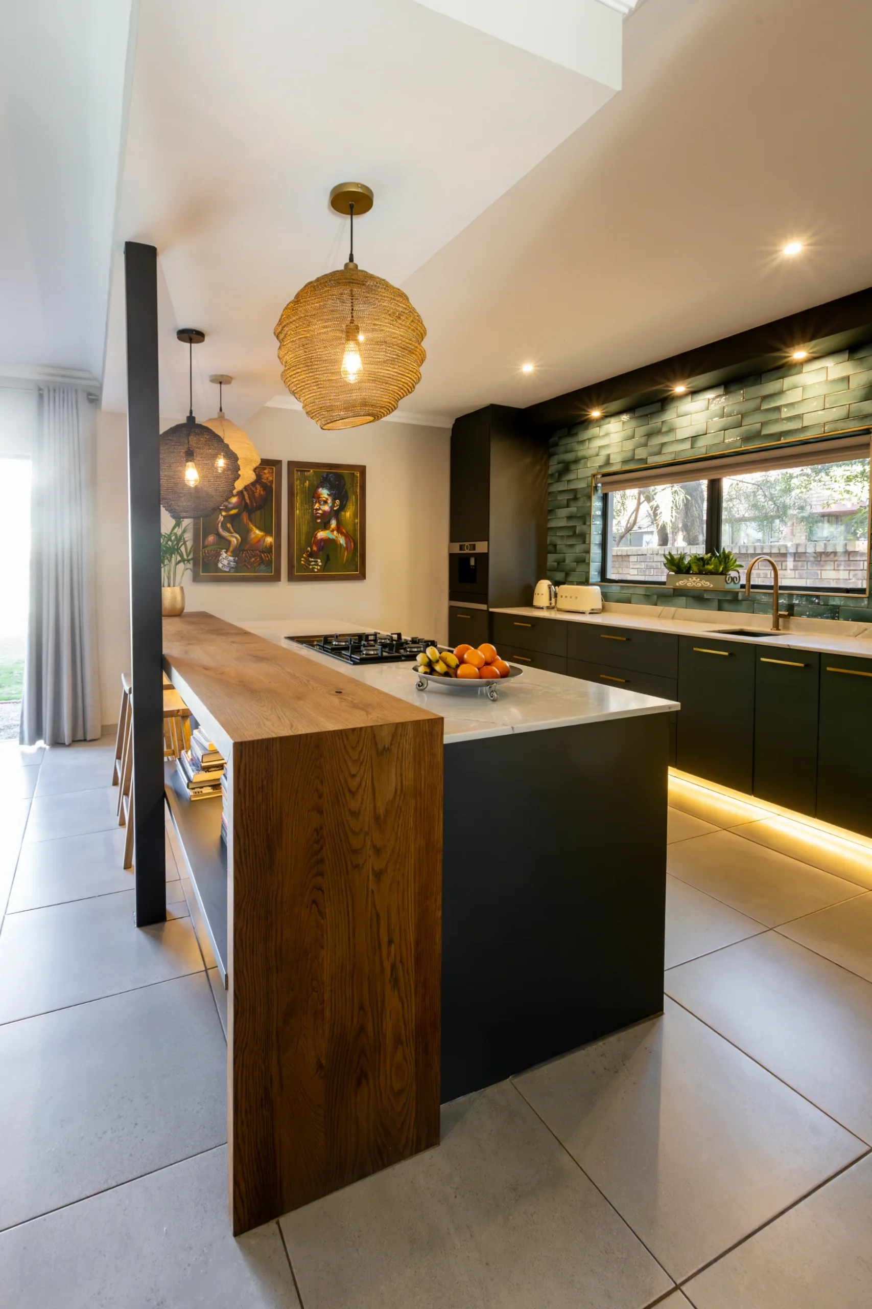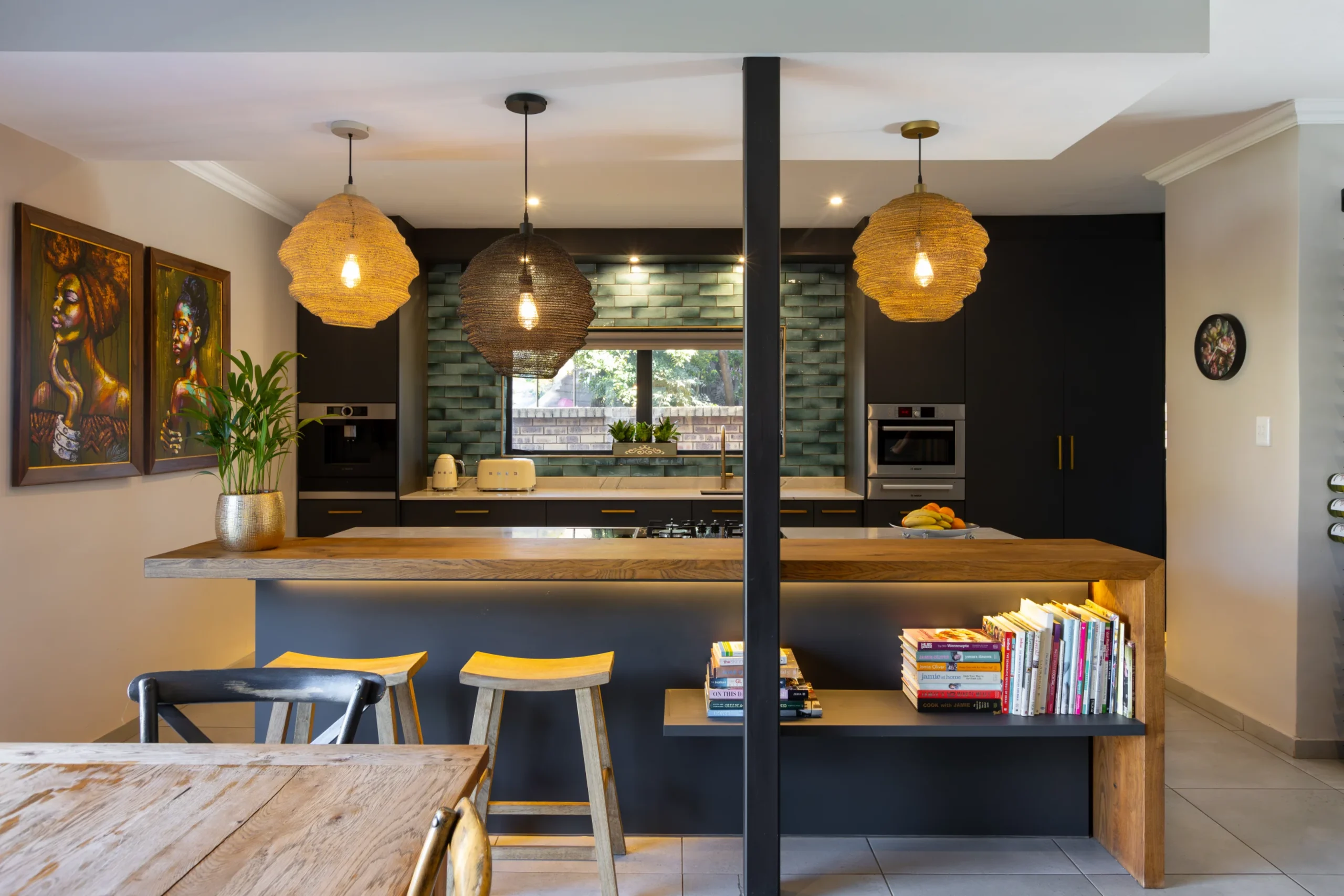 This kitchen captures the beauty of nature with its earthy tones, textured lighting, and organic materials. The rich, dark cabinetry provides a bold foundation, while the warm wood countertop and bar stools bring in a rustic touch. Subtle green subway tiles as the backsplash introduce a hint of colour, perfectly balanced by natural woven pendant lights that give the space a cosy, ambient glow. Accented with unique artwork and a practical open shelf for cookbooks, this kitchen feels like a stylish yet grounded retreat, ideal for both cooking and gathering.