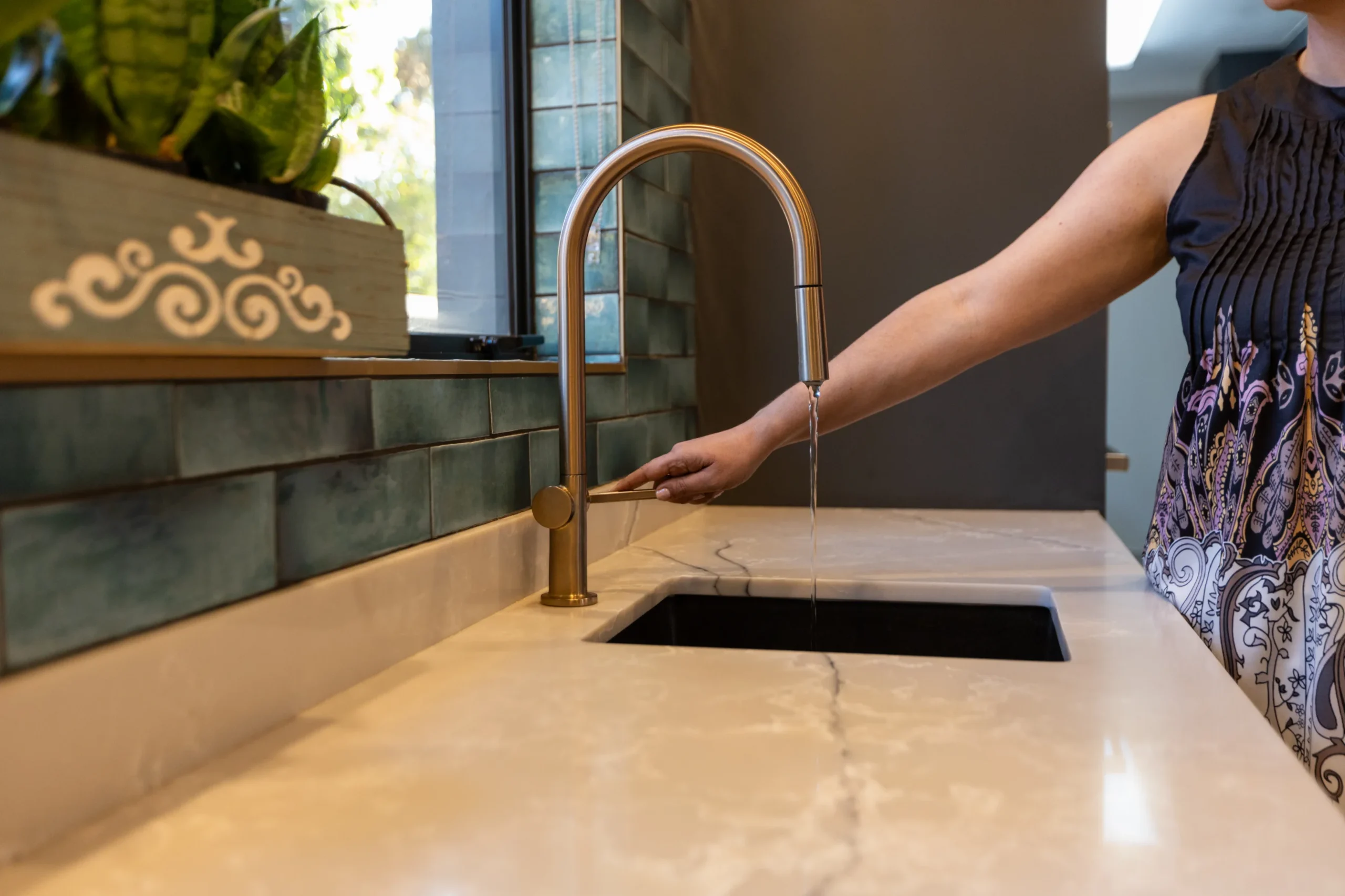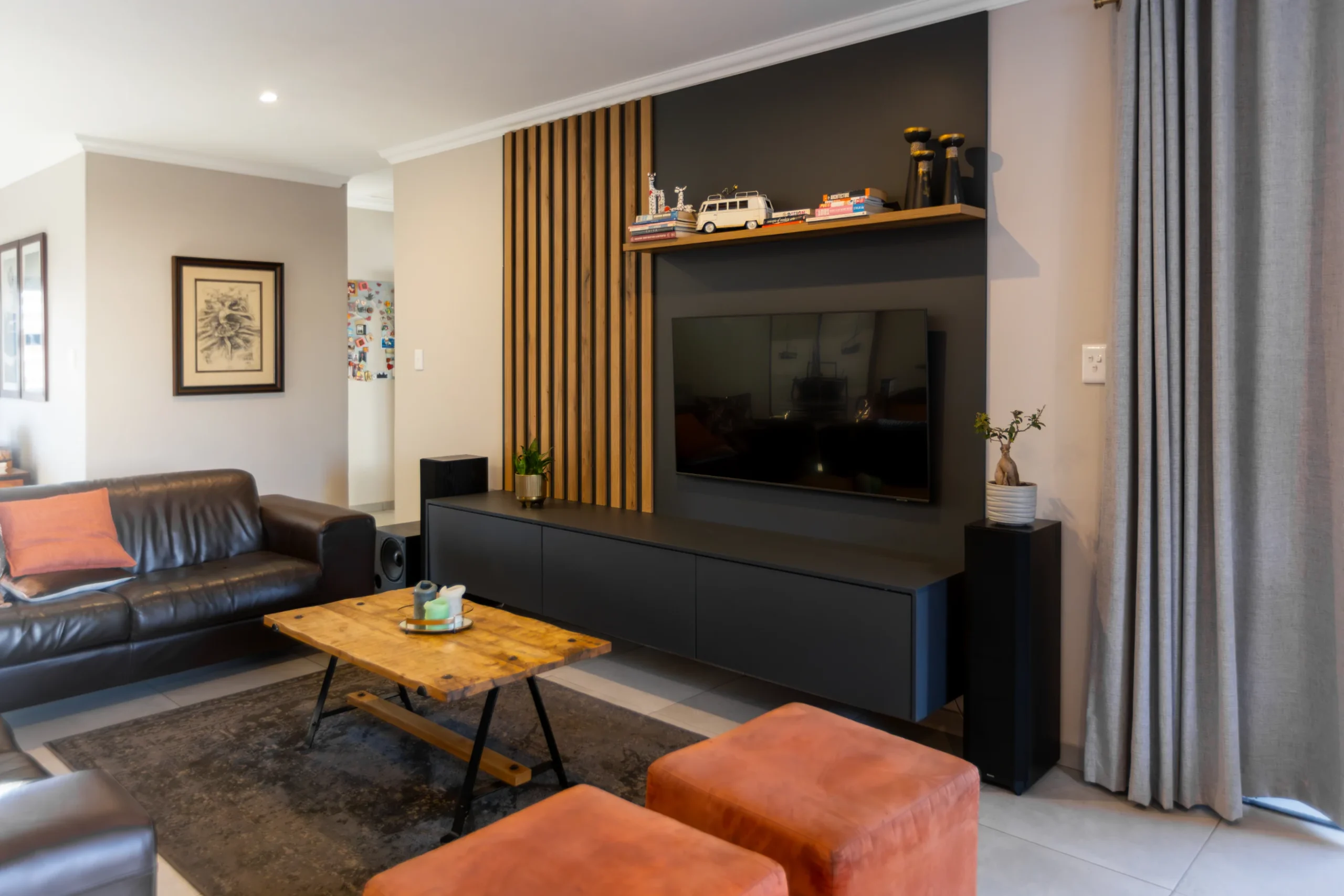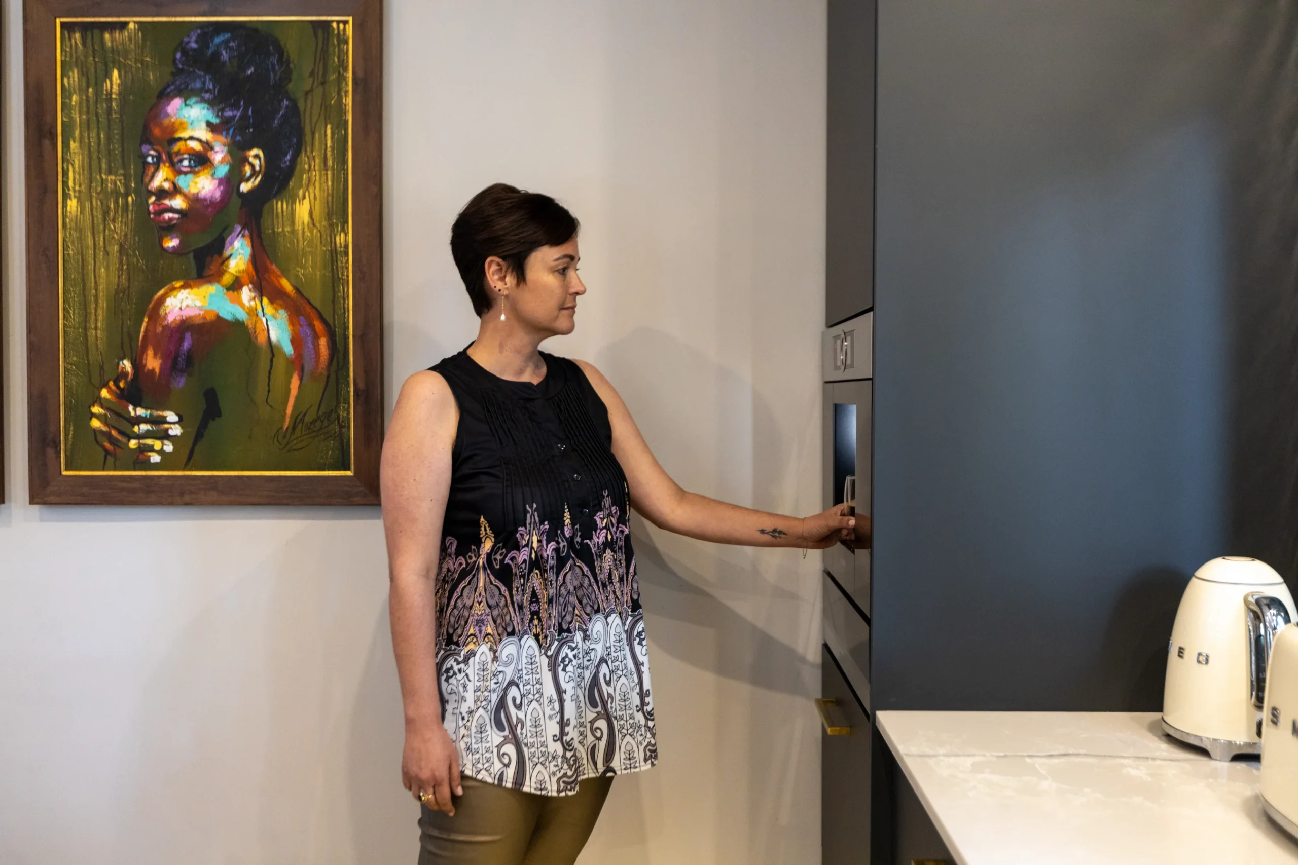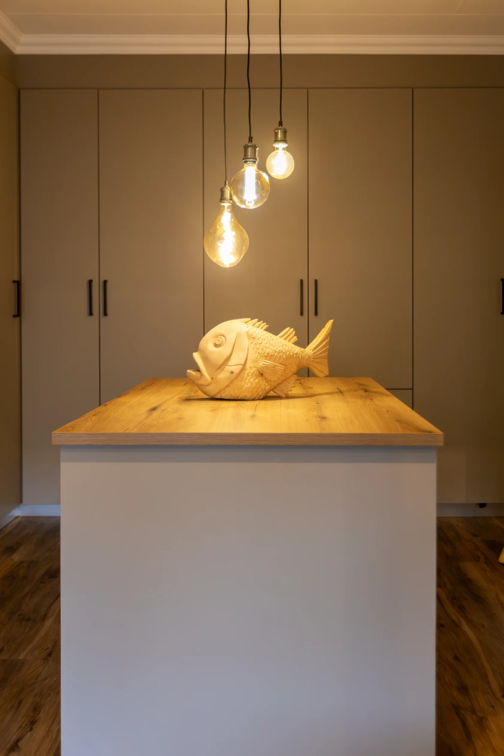 This kitchen captures the beauty of nature with its earthy tones, textured lighting, and organic materials. The rich, dark cabinetry provides a bold foundation, while the warm wood countertop and bar stools bring in a rustic touch. Subtle green subway tiles as the backsplash introduce a hint of colour, perfectly balanced by natural woven pendant lights that give the space a cosy, ambient glow. Accented with unique artwork and a practical open shelf for cookbooks, this kitchen feels like a stylish yet grounded retreat, ideal for both cooking and gathering.