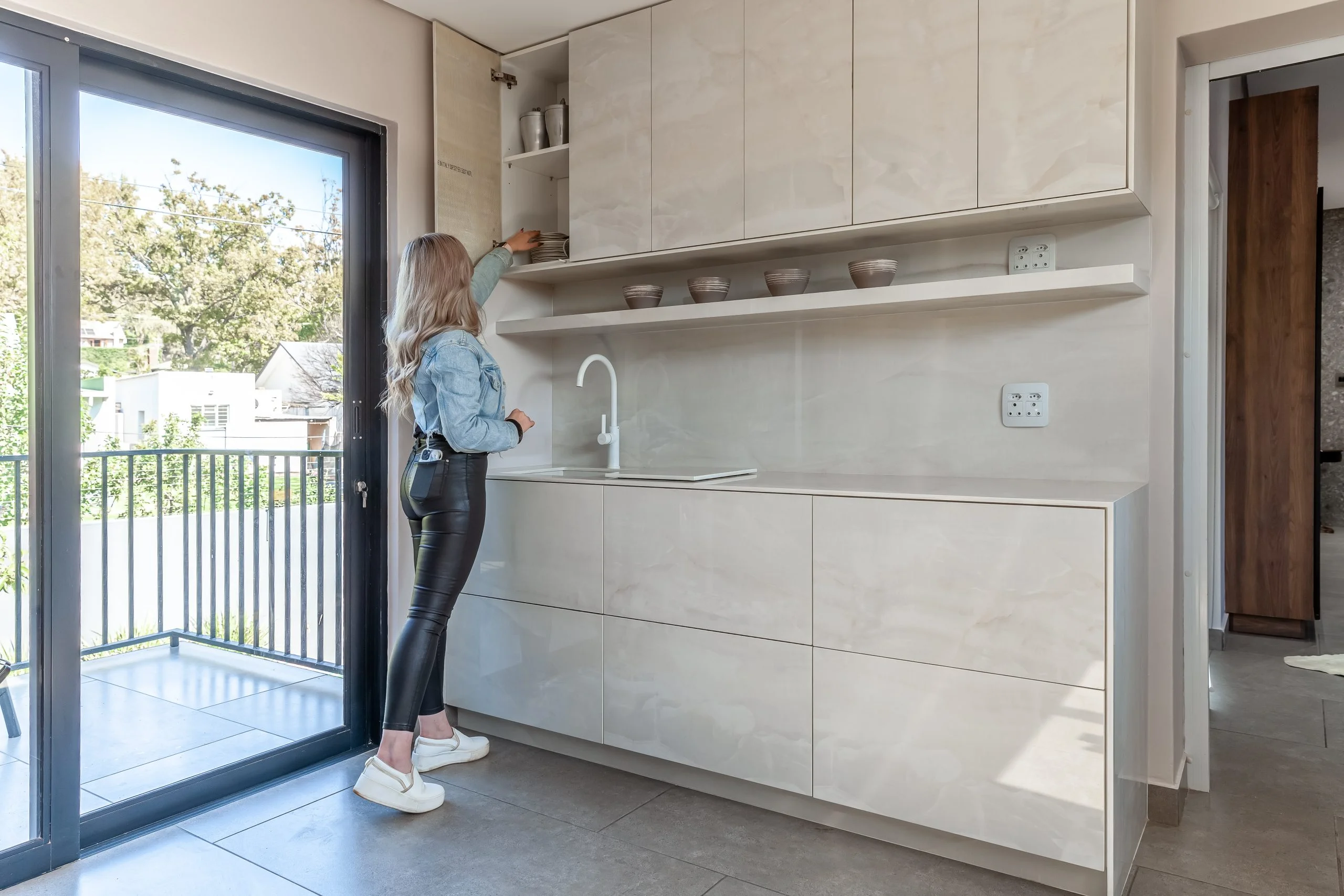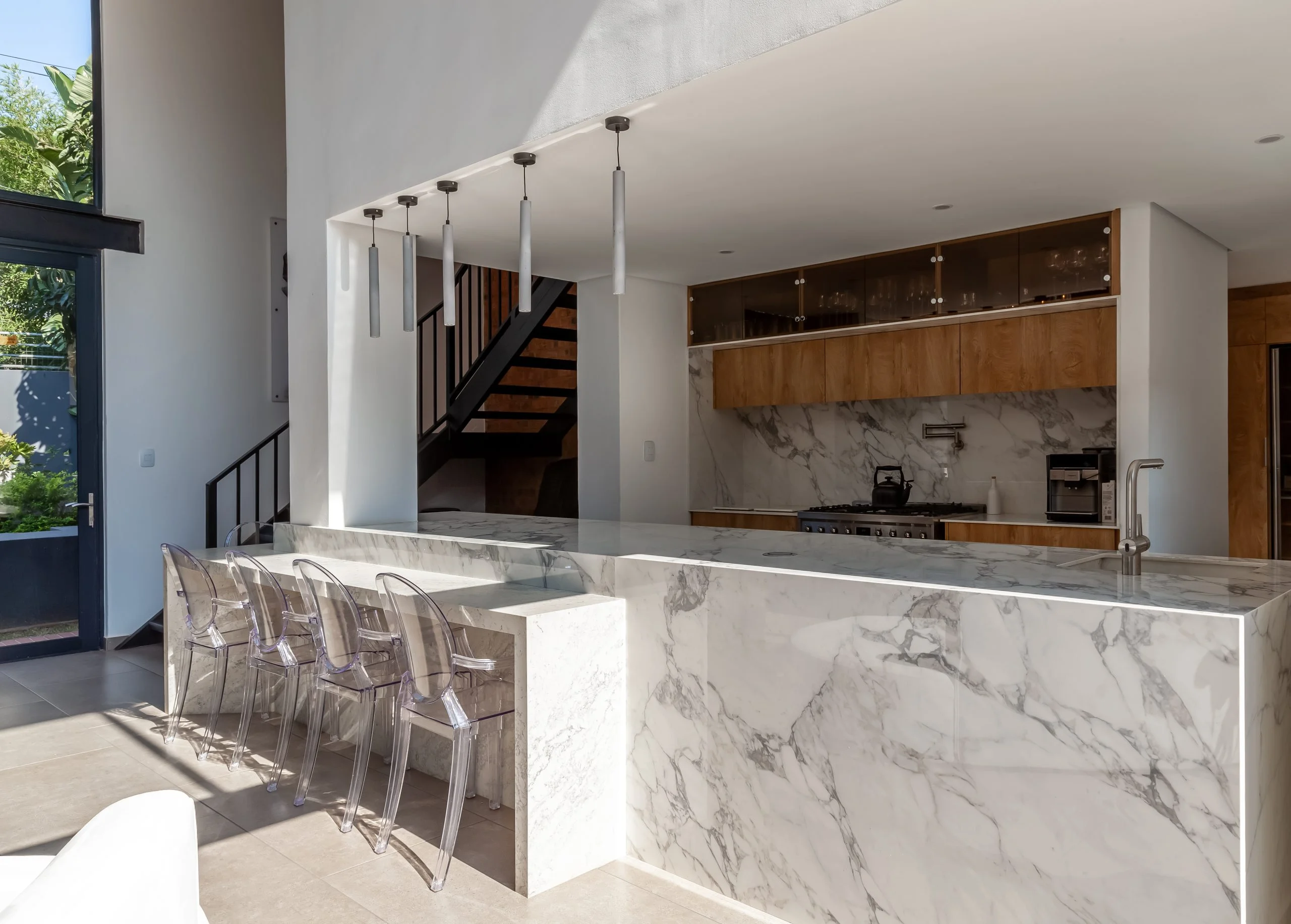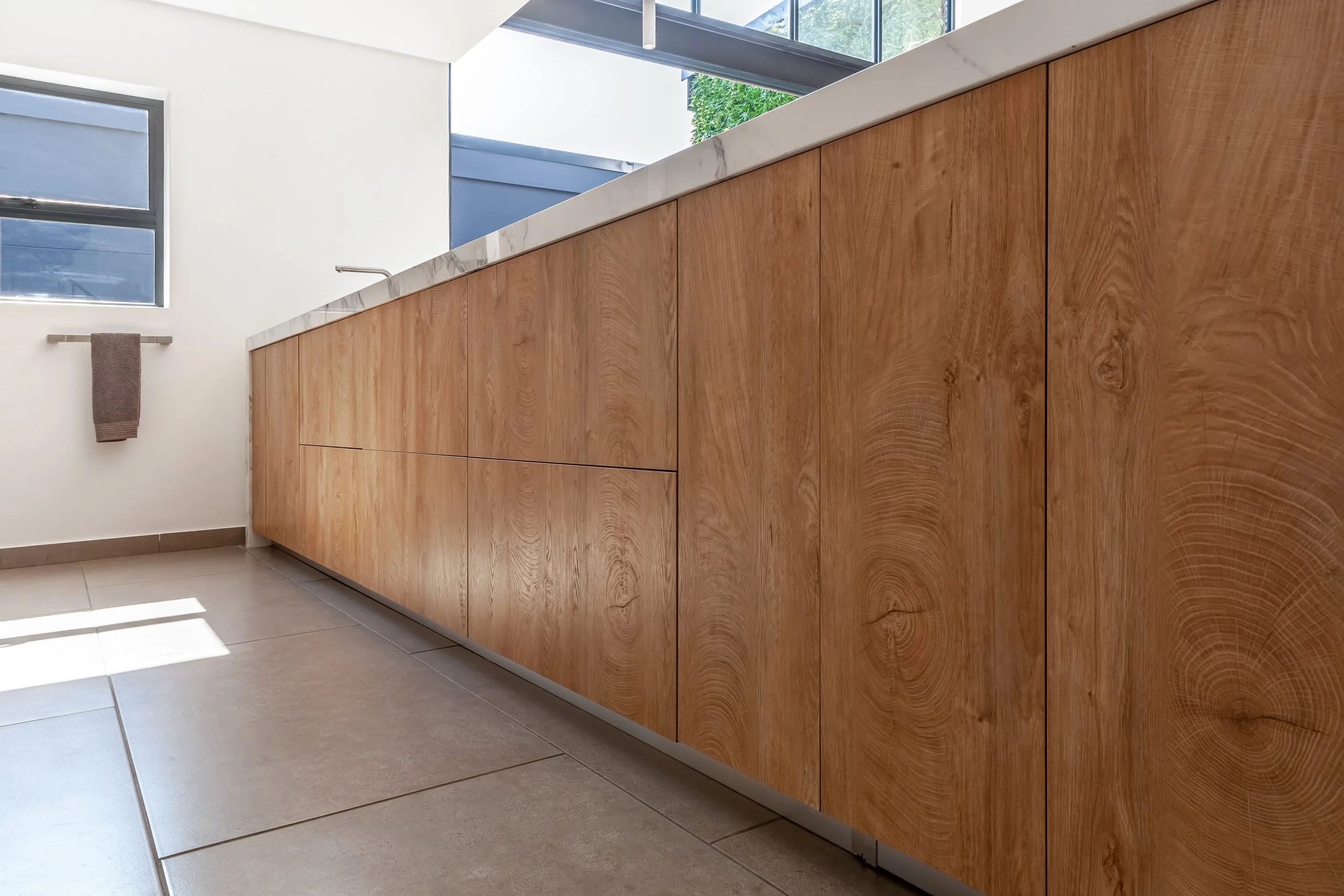 A minimalist look where the stone was the feature was achieved in this modern design. To ensure a sleek design we used Blum’s BLUMOTION Tandembox Runners and Tip-On Hinges, as well as customised sinks constructed from the same stone as the countertops. The Atlas Neo Mixer is a great feature on its own and allows the convenience of a touch-free kitchen mixer.